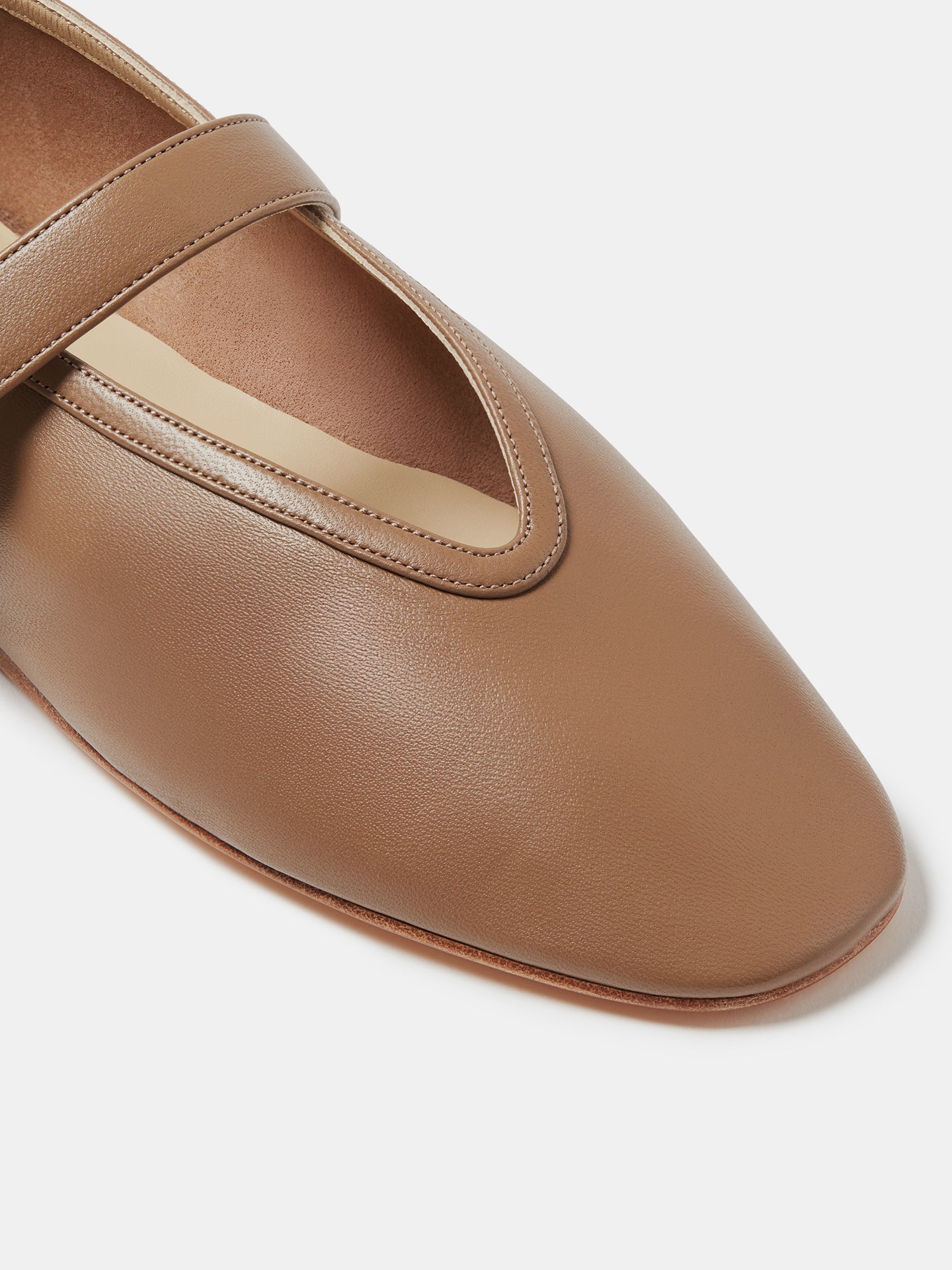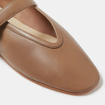 Stella Slipper in taupe lamb leather, with buckle-fastening, a cushioned calf leather insole and leather piping. 8mm heel. Made in Italy.