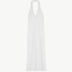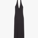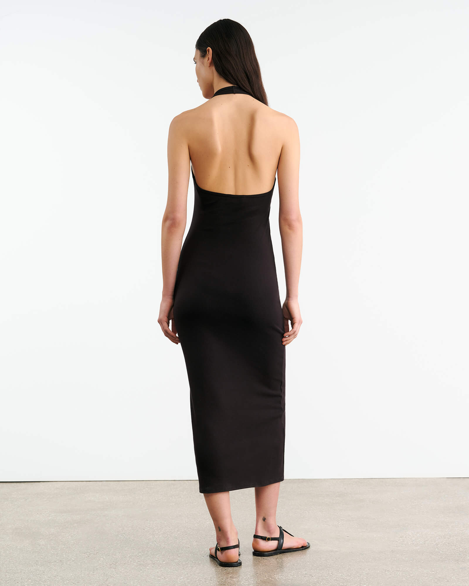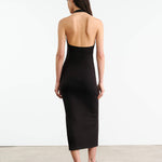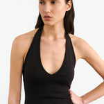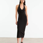Slim fit baby rib halter mid-length dress in American cotton. Open back.