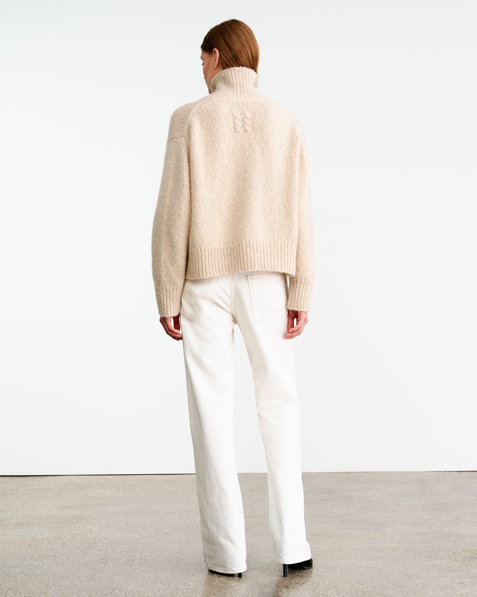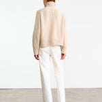 Chunky weight boxy turtleneck. High neck designed to be worn up, but easily able to fold over. Dropped shoulder. Rib start at hem and sleeve. Fashioning along arm hole. Signature center back cable knit detail.