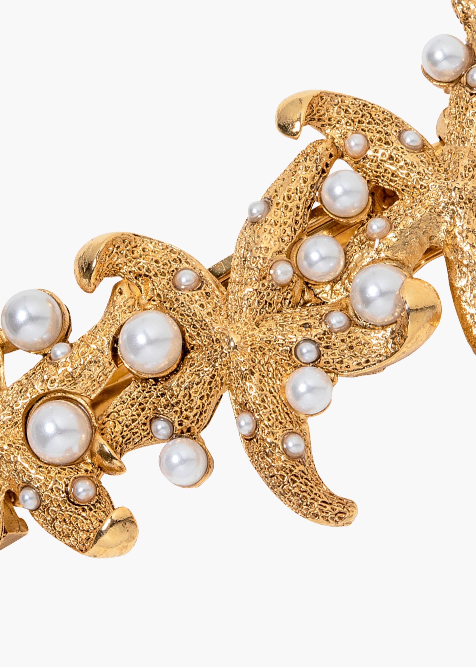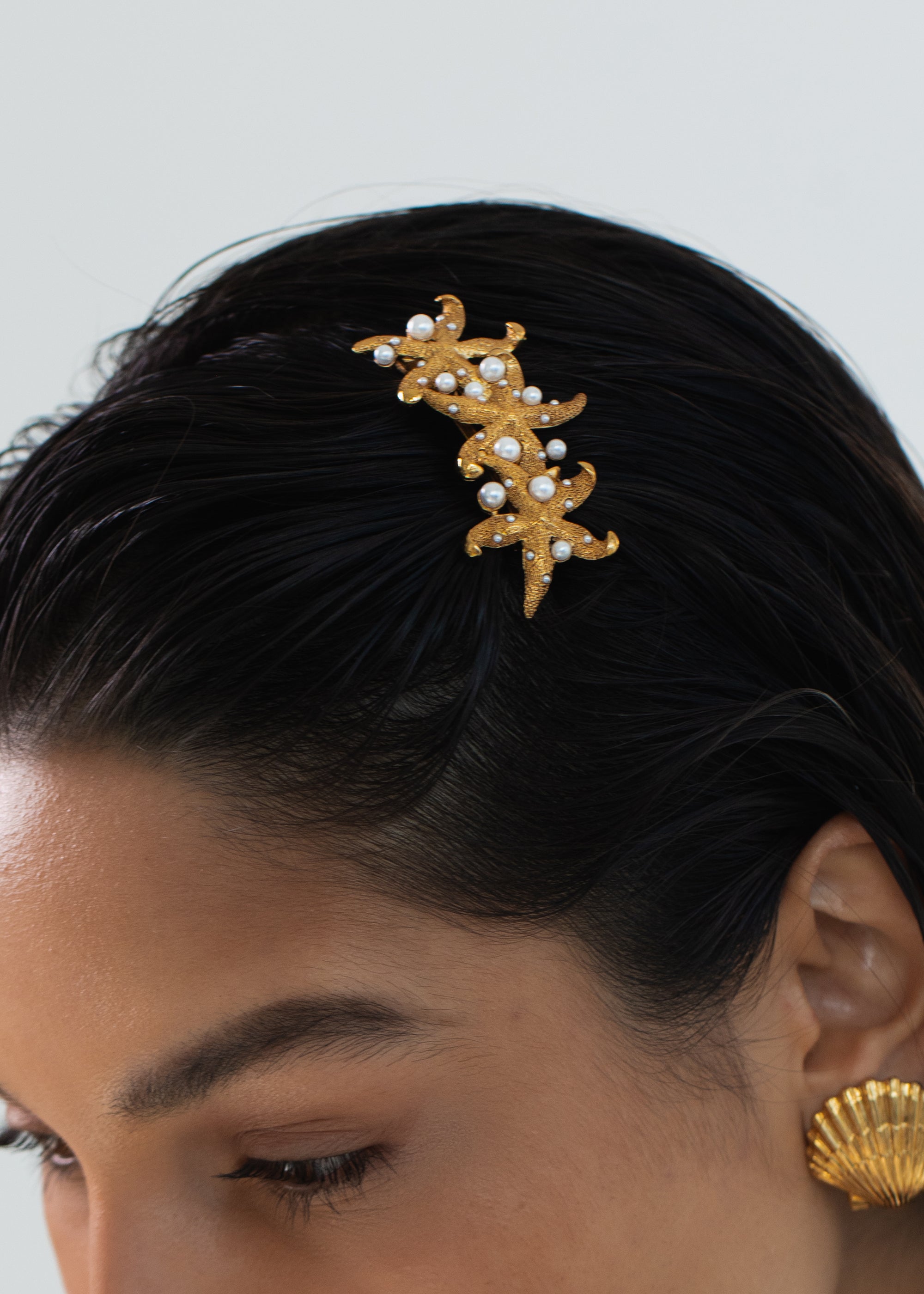 The Thalassa Barrette celebrates the enigmatic starfish, with sculptural details and texture imbuing the piece with a sense of movement. Pearls are scattered throughout, with organic placement playfully recalling barnacle formations on seaside cliffs. It fastens with an automatic French barrette closure, making placement in the hair a breeze, regardless of the style. Dimensions: 2.5 inch width, 1 inch length