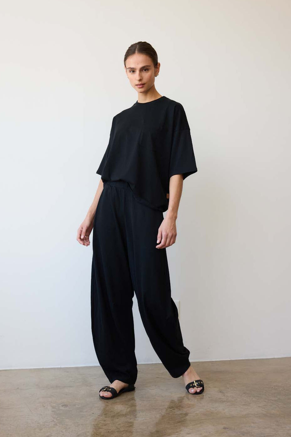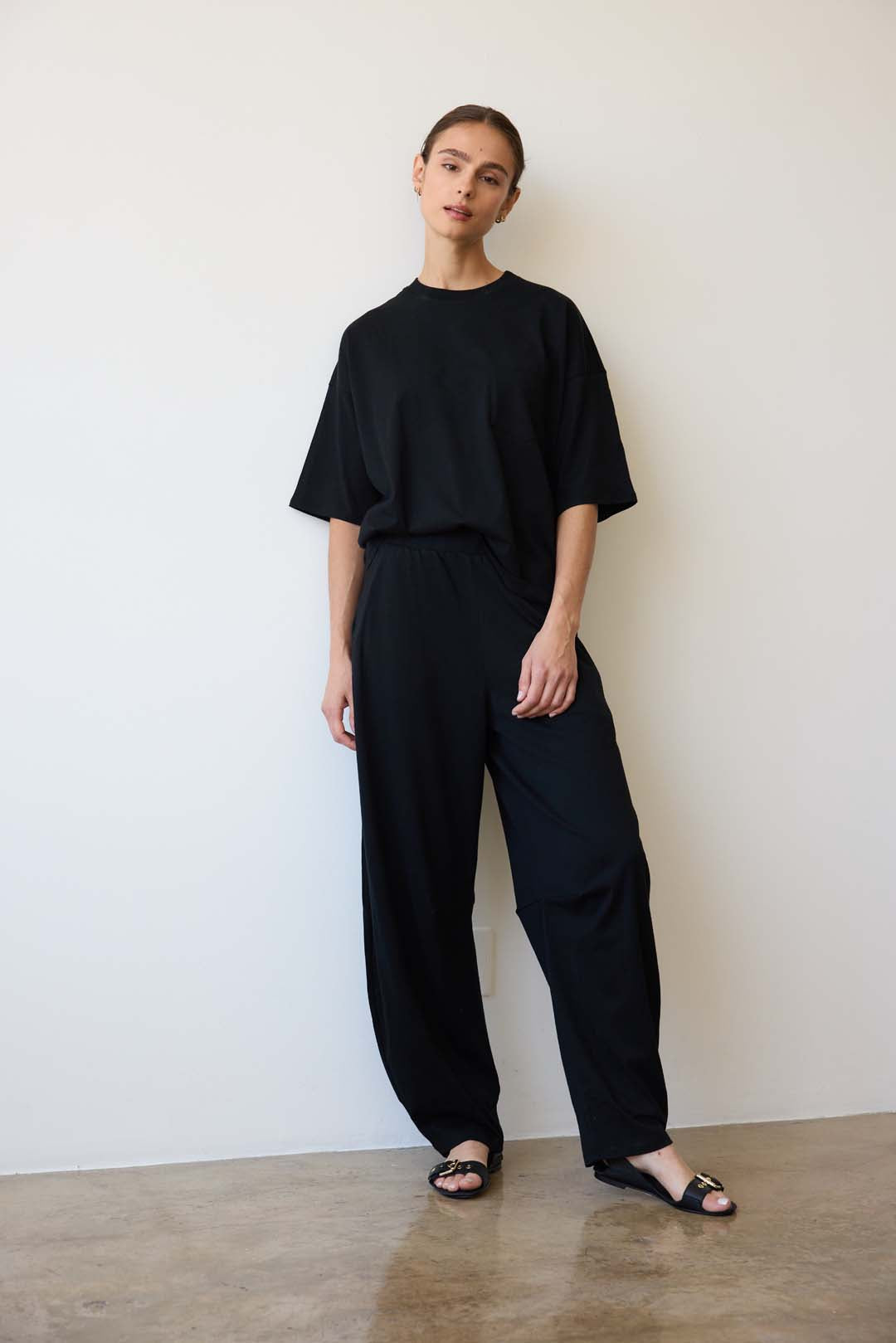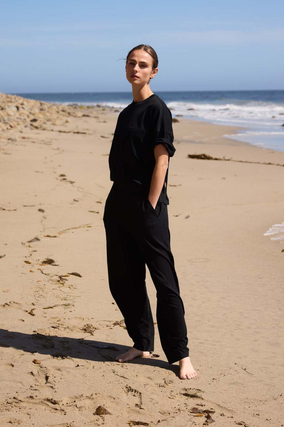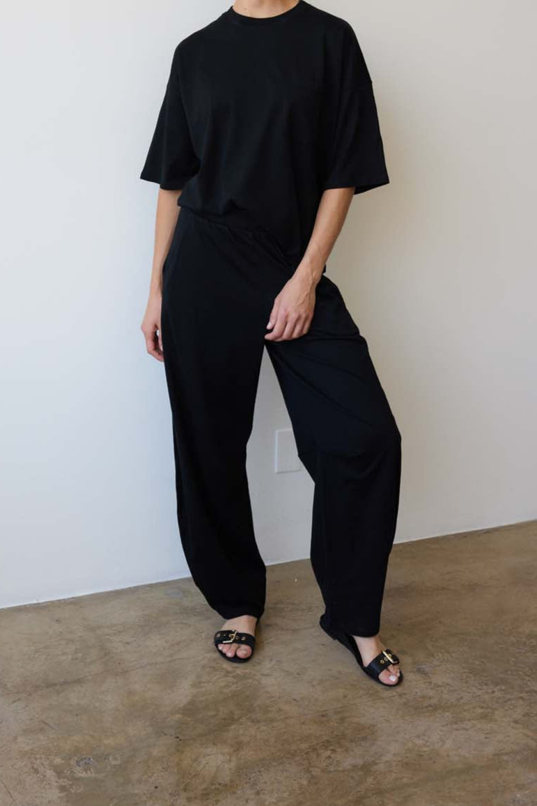 The Arc Lounge Jersey Pant is also offered in our deep Black and matches the Boxy tee perfectly.