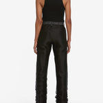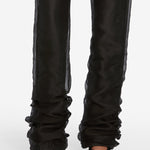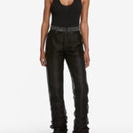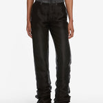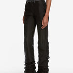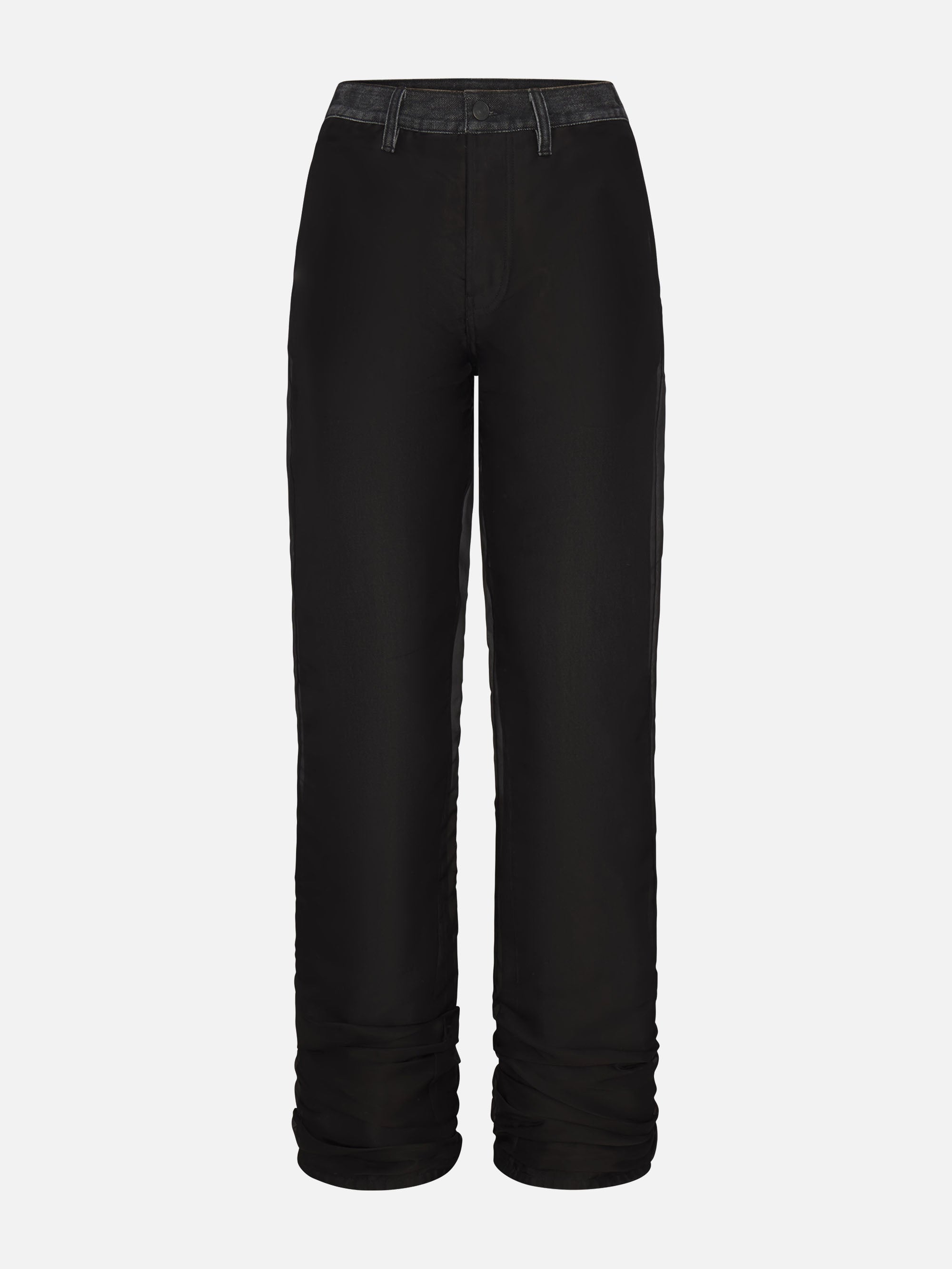 This cutting-edge jean is comprised of two layers, black denim and a dramatic silk organza overlay, with an extra-long inseam for a dramatically stacked look.