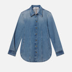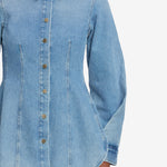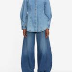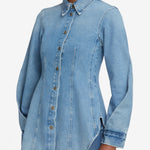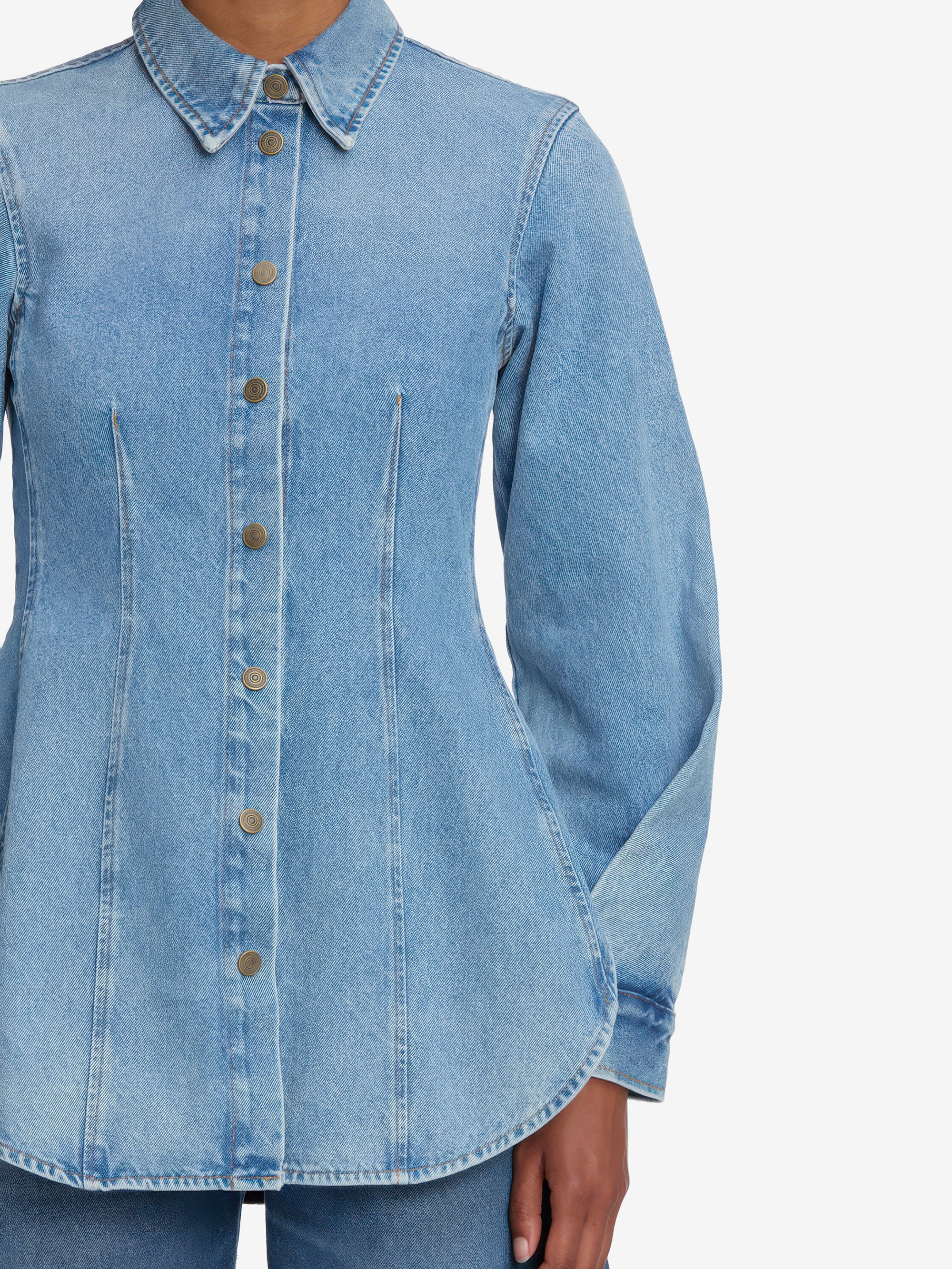 The essence of modern femininity. This structured, form-fitting shirt is crafted from non-stretch denim with figure-flattering front pleats and a nipped waist. Finished with bronze buttons and edgy twisted sleeves.