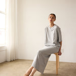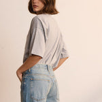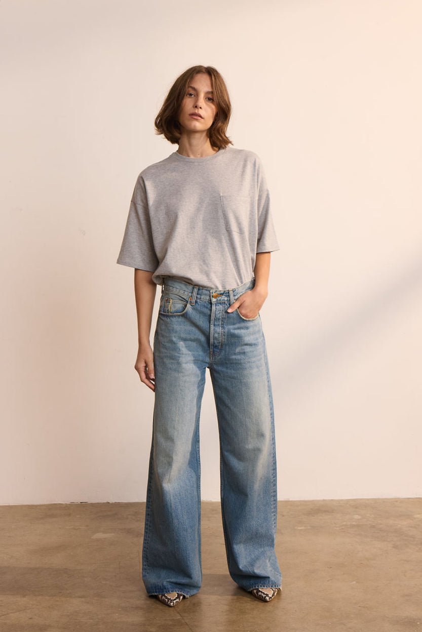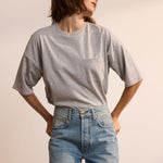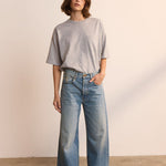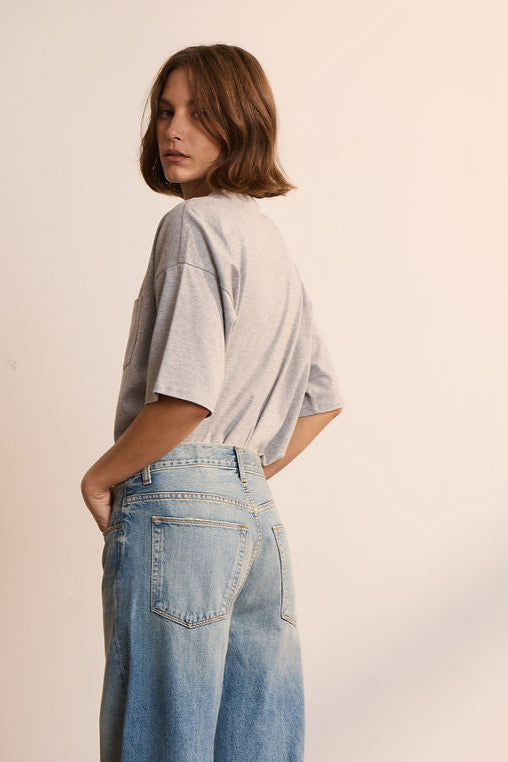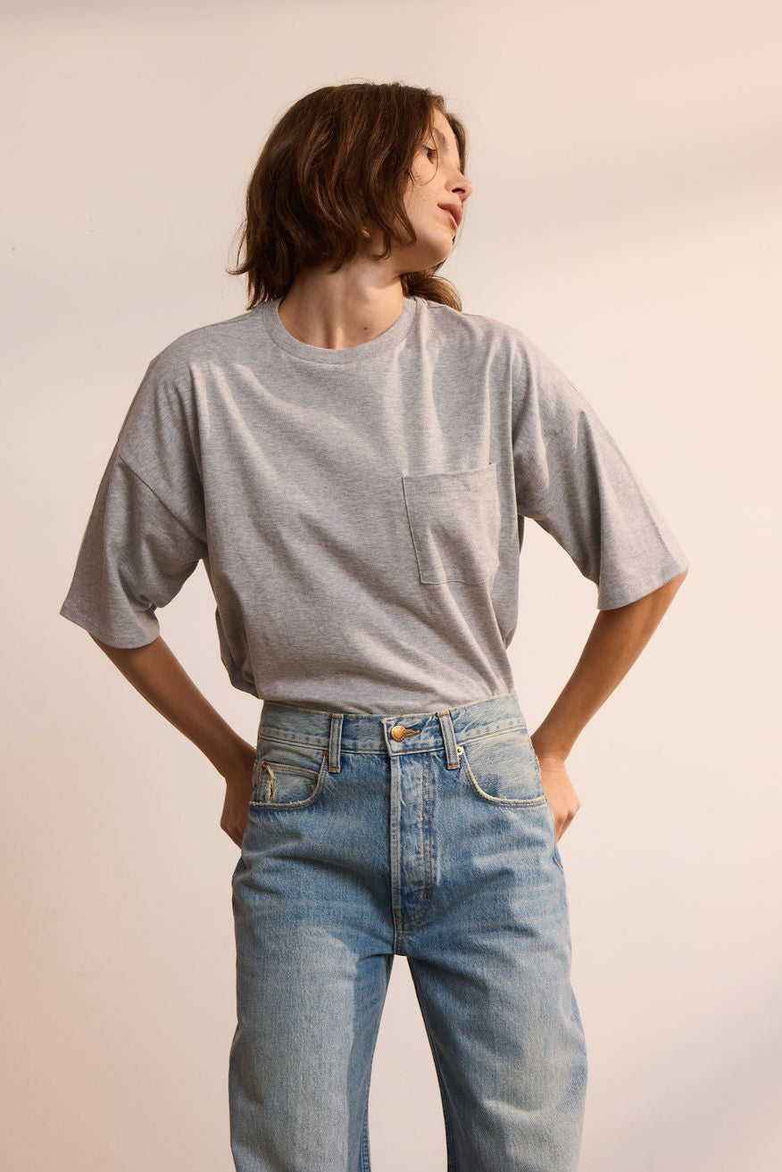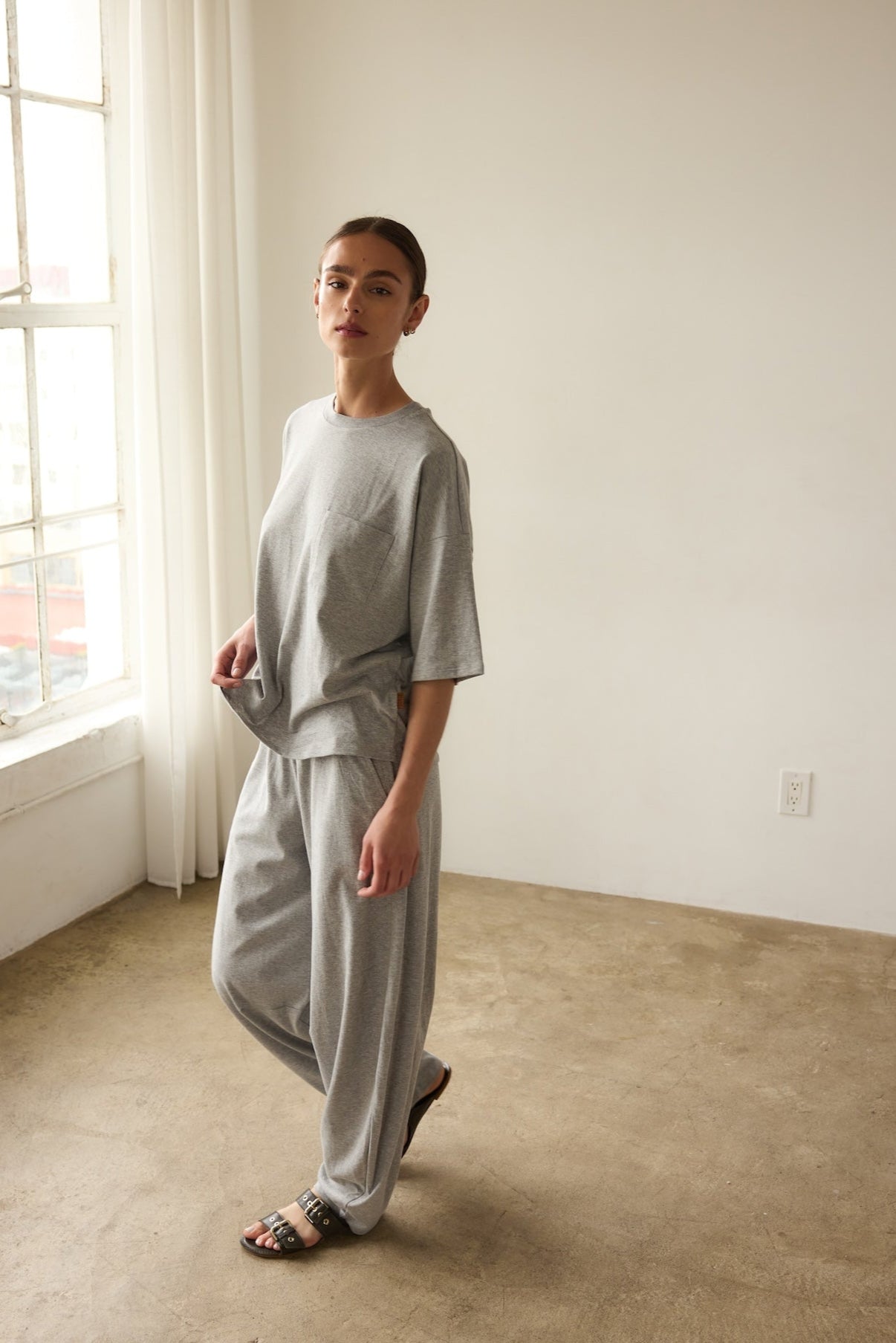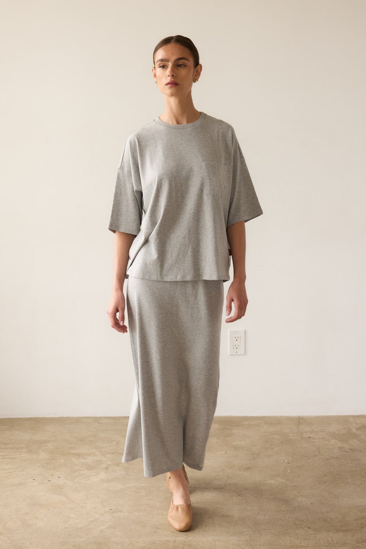 A crew neck tee with a dolman inspired loose-ish fit. Boyish inspiration with feminine drape creates modern, understated, casual appeal. A boxy fit creates beautiful shape when tucked and modern structure when undone. Cut in a soft multi-ply 100% Japanese cotton jersey. Piece dyed for deep color saturation and preshrunk for fit continuity.