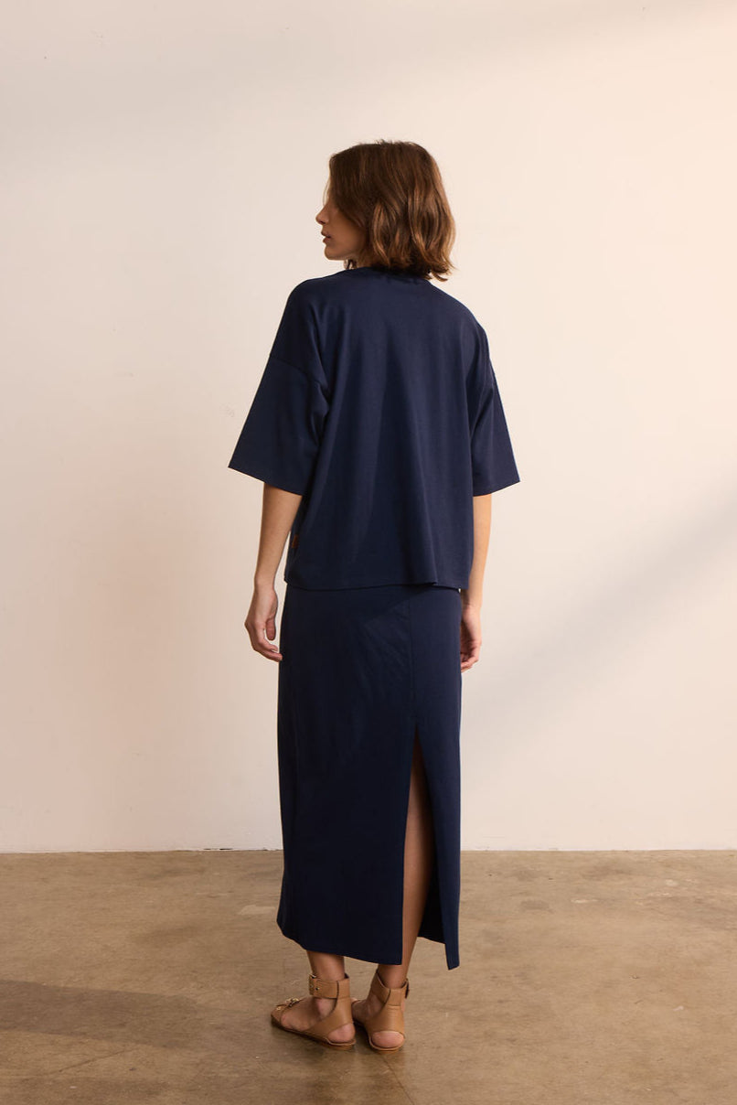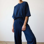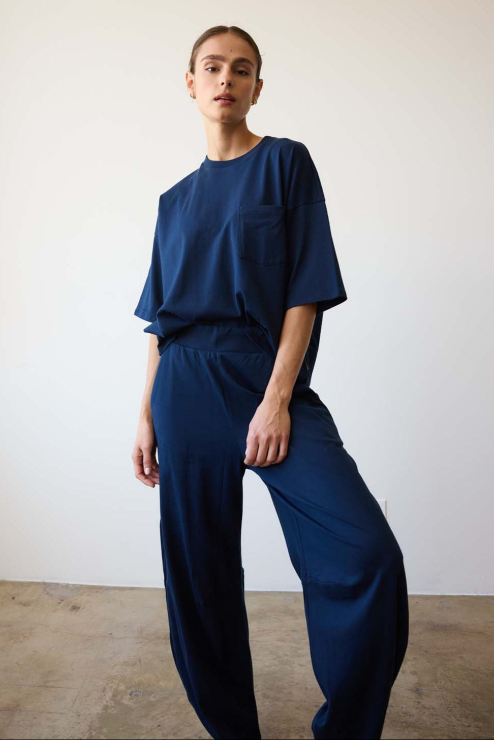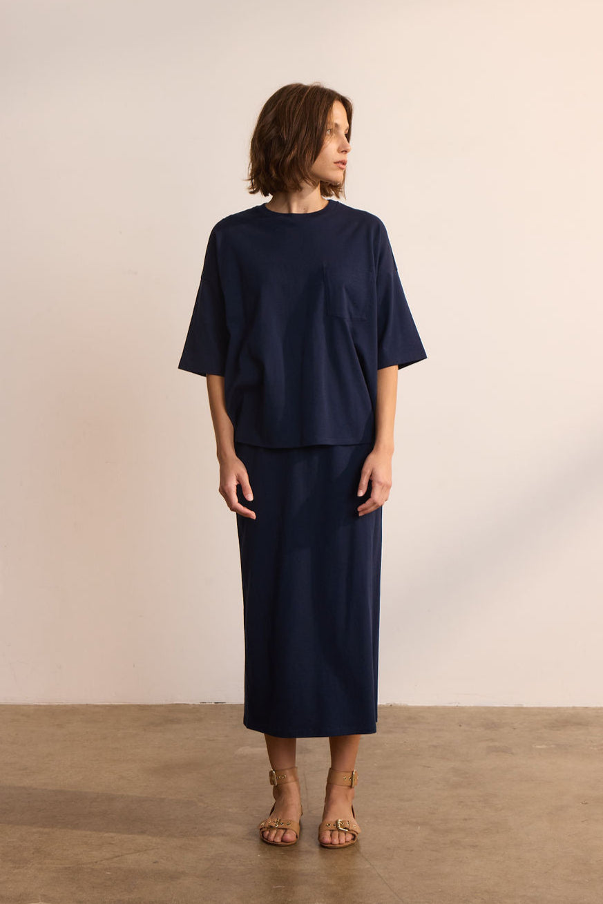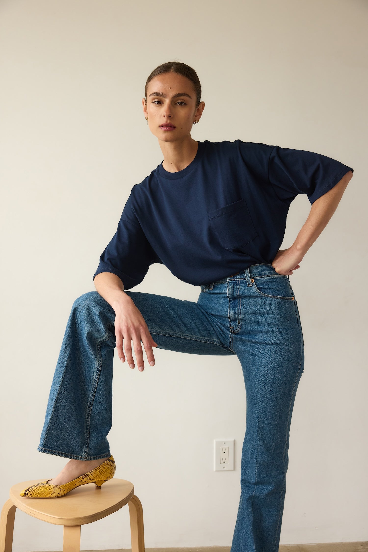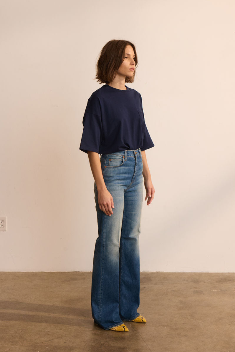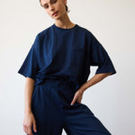 A crew neck tee with a dolman inspired loose-ish fit. Boyish inspiration with feminine drape creates modern, understated, casual appeal. A boxy fit creates beautiful shape when tucked and modern structure when undone. Cut in a soft multi-ply 100% Japanese cotton jersey. Piece dyed for deep color saturation and preshrunk for fit continuity.