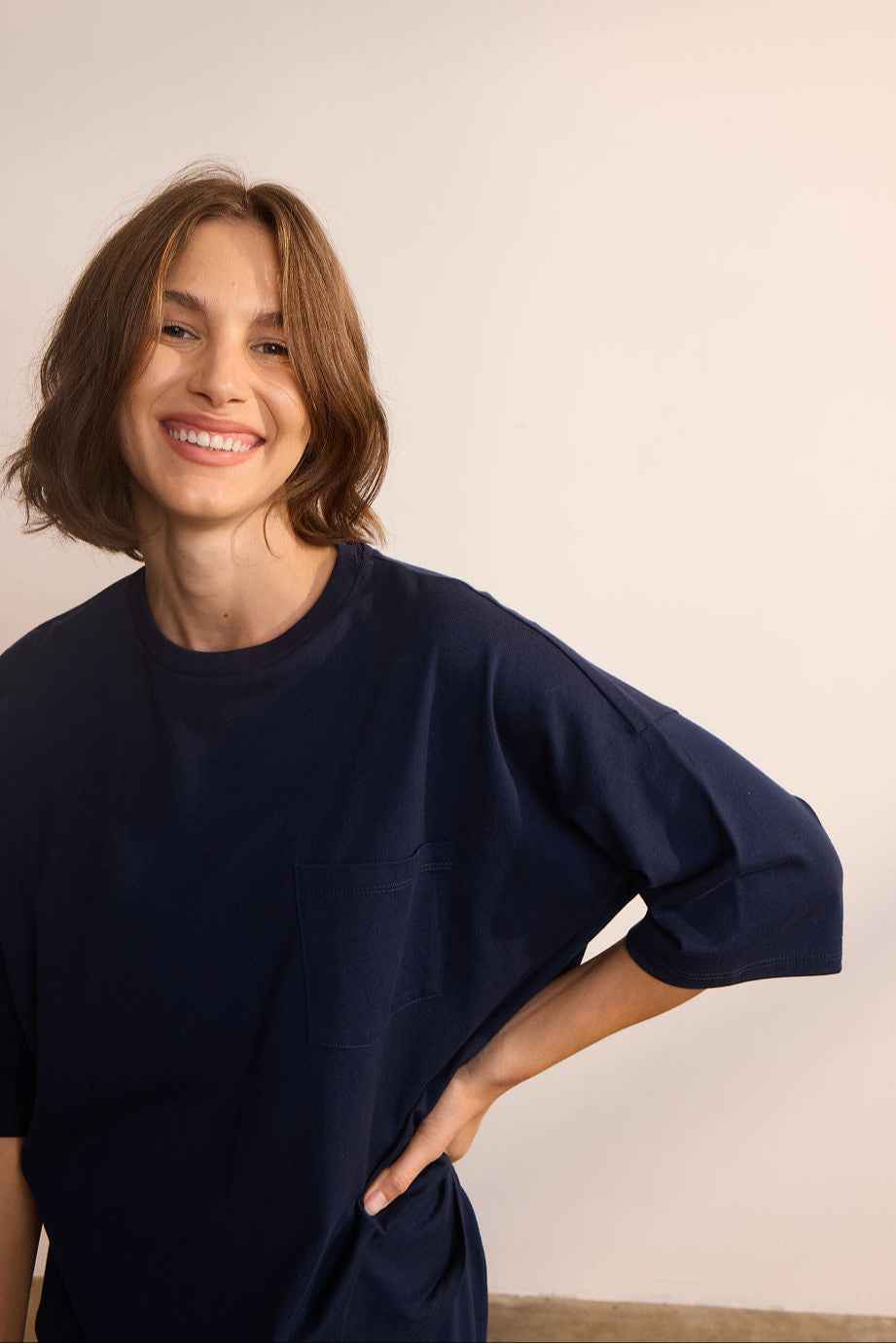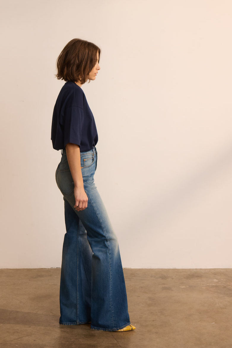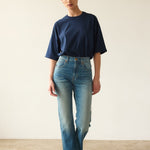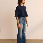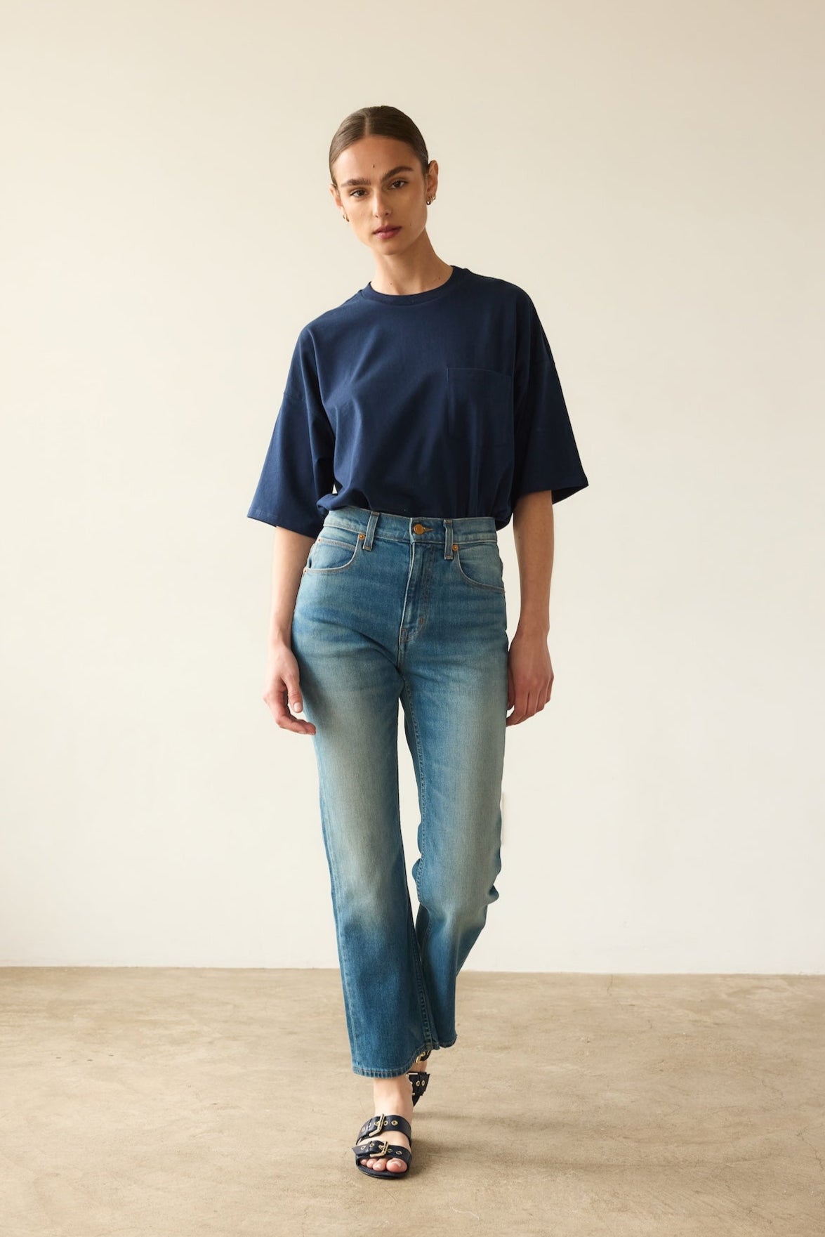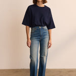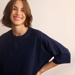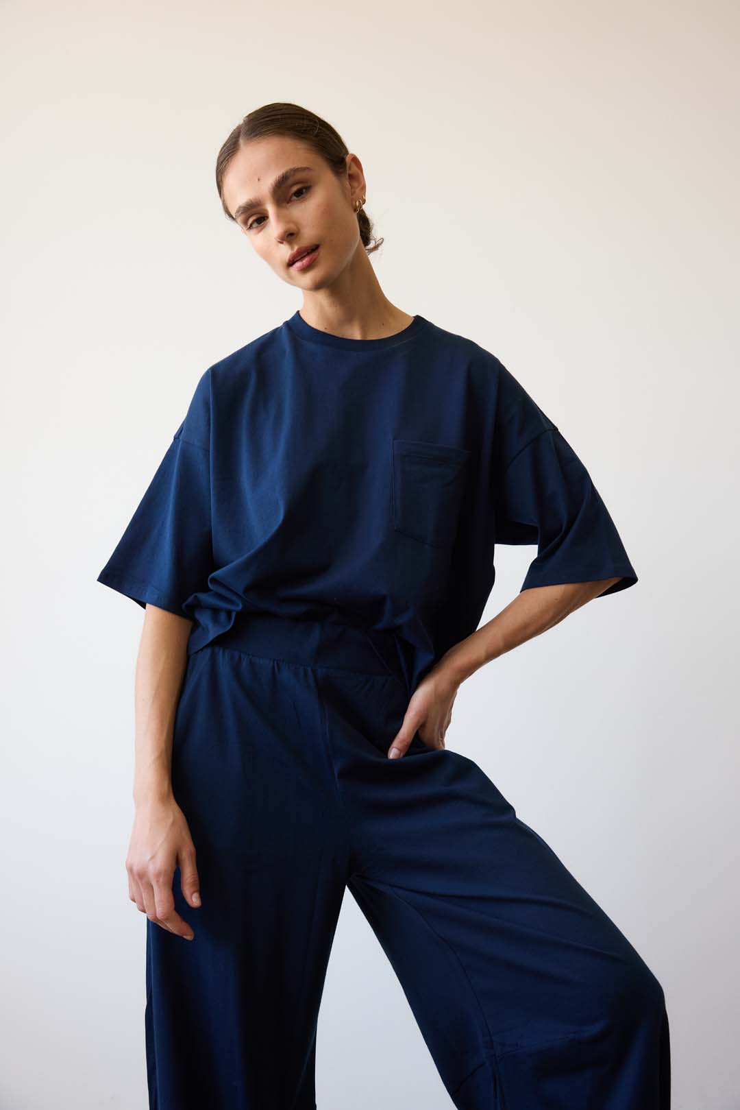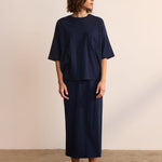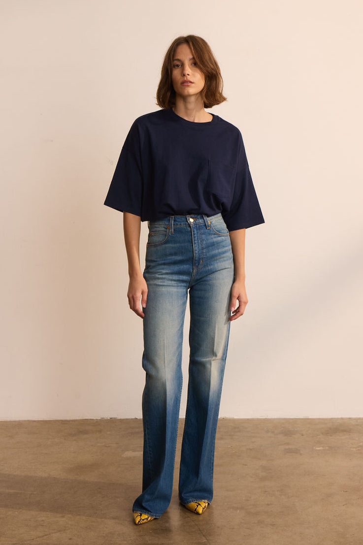 A crew neck tee with a dolman inspired loose-ish fit. Boyish inspiration with feminine drape creates modern, understated, casual appeal. A boxy fit creates beautiful shape when tucked and modern structure when undone. Cut in a soft multi-ply 100% Japanese cotton jersey. Piece dyed for deep color saturation and preshrunk for fit continuity.
