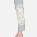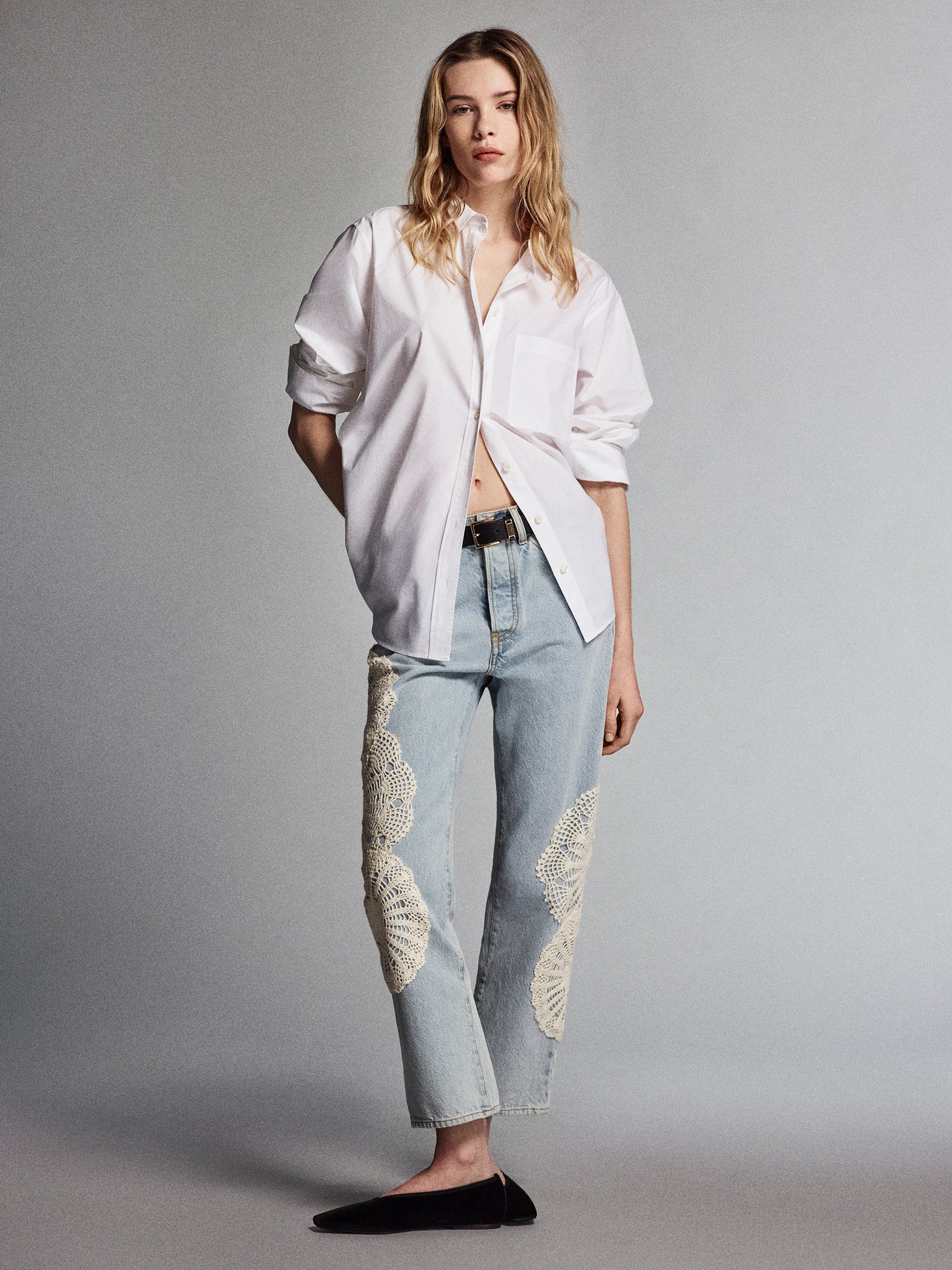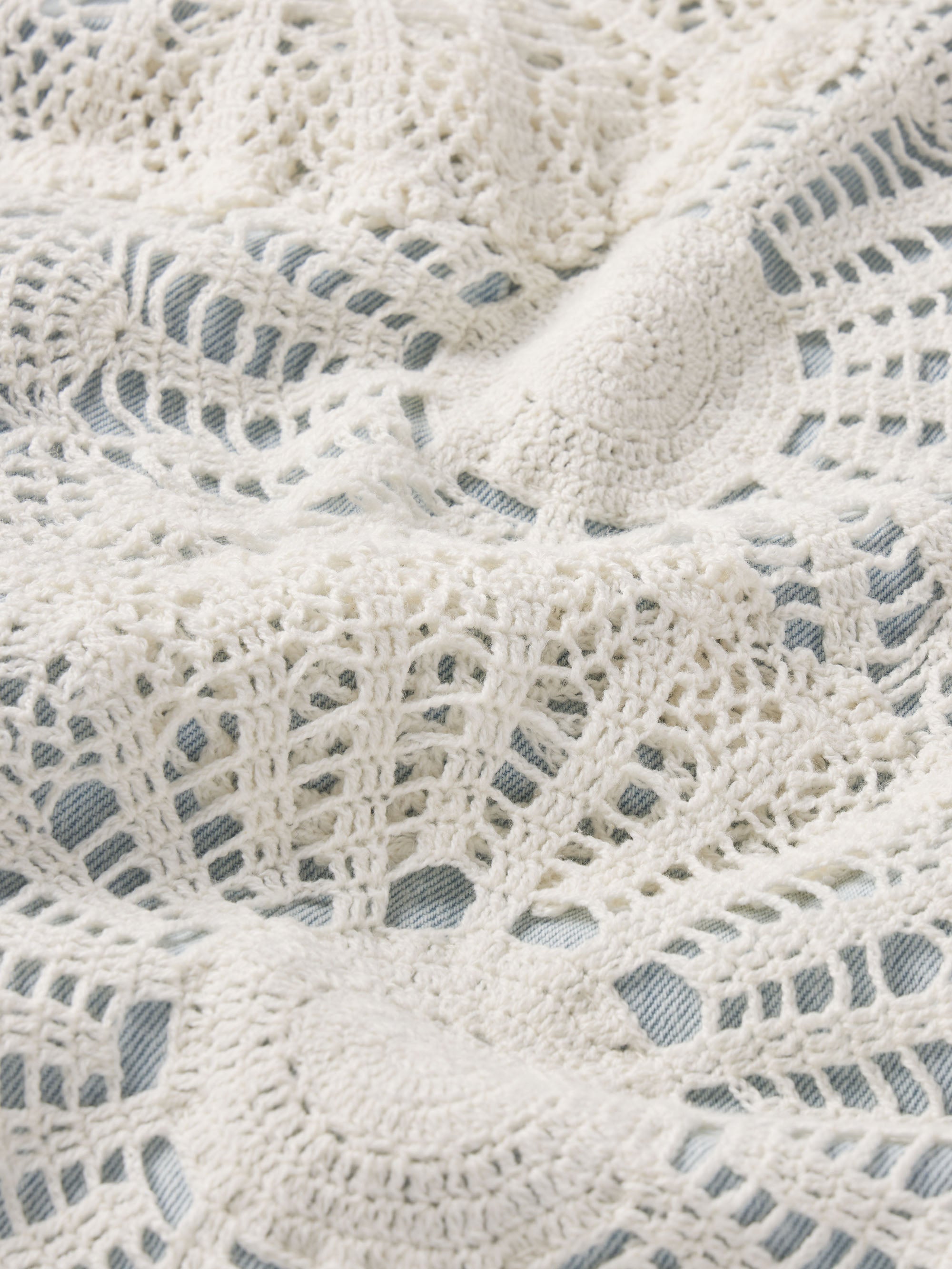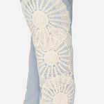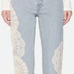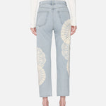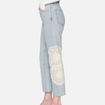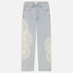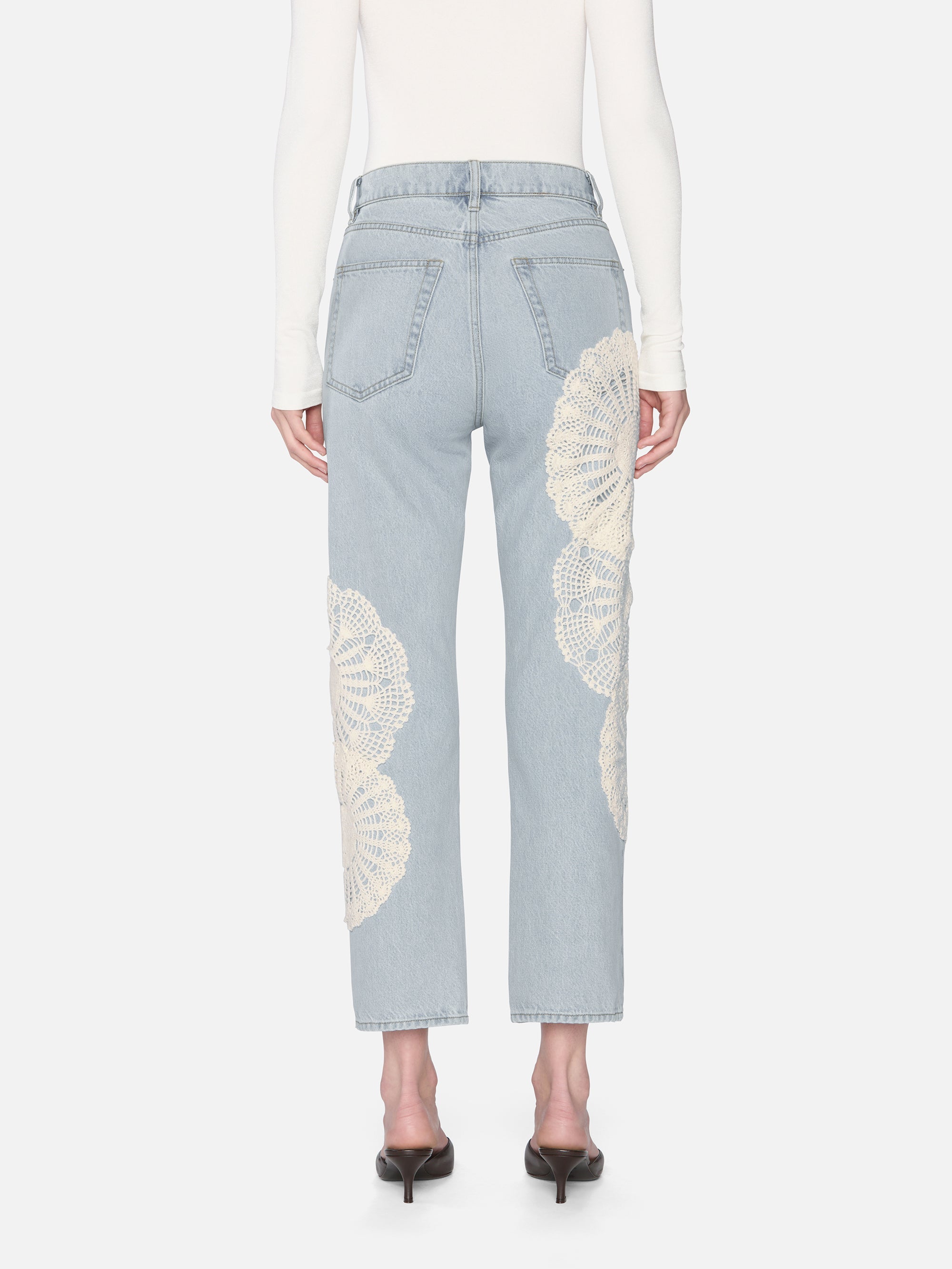 The Vertical Crop is a shorter version of the original showstopper, featuring a high-rise waist, straight-leg, and cropped inseam with rigid structure that softens over time. Finished with a button fly and crochet doilies along each outseam for an artisanal twist.