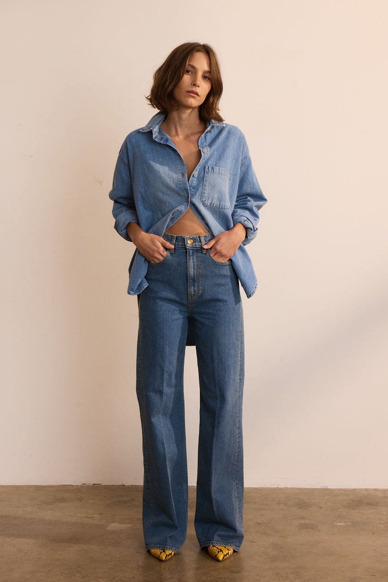 The bestselling Essential denim shirt in Timeworn Indigo is expertly cut for a beautiful denim drape with a straight & relaxed shape. A perfectly placed button at the chest allows for a deep neckline. A button under the neckline creates the opportunity for a high buttoned up look without the choke. A small button perfectly placed on the hidden cuff placket for an easy undone cuff that doesn’t get away from you. Small details make the difference and create an undone feeling that can still feel polished. Design that supports styling. I am always looking to find the tension between a done and an undone look, the place between polished and casual, that feels like me.