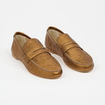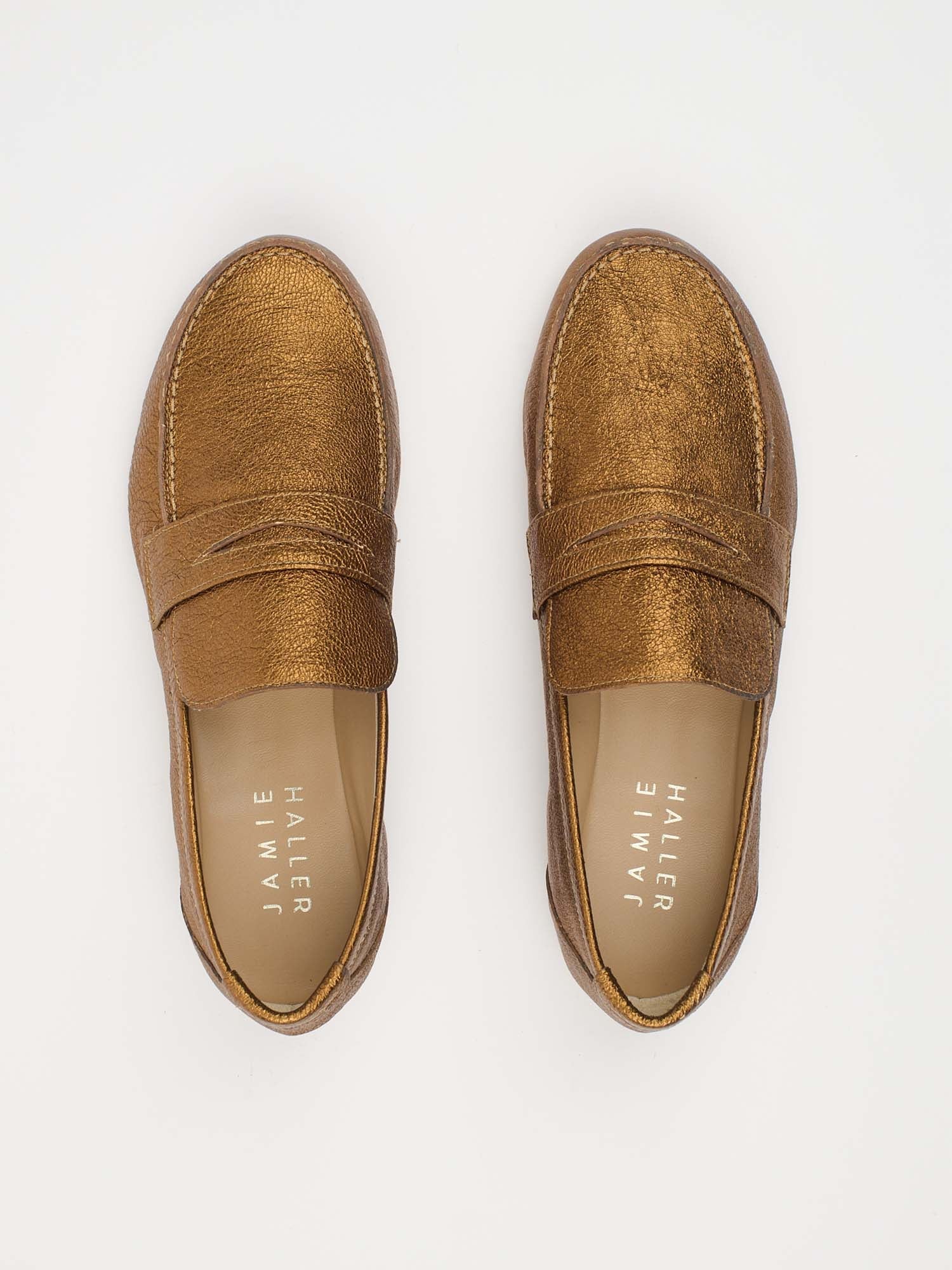 Inspired by the handsome lines of a 70’s Italian mens loafer with the understated soul of a slipper. Constructed in an Italian Calfskin with a metallic bronze finish. Soft lambskin lining and insole. A leather sole with anti slip rubber injection. Handmade in Tuscany using old world Sacchetto construction for a glove like fit and feel that you can’t unsee.