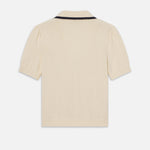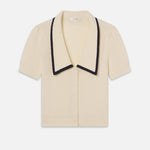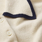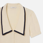 A new shape, knit from our bestselling textured yarn. This soft button-up features a contrast-trim sailor collar and short sleeves, striking that balance between nostalgic charm and everyday wearability. A nod to tradition—with a lighter touch.