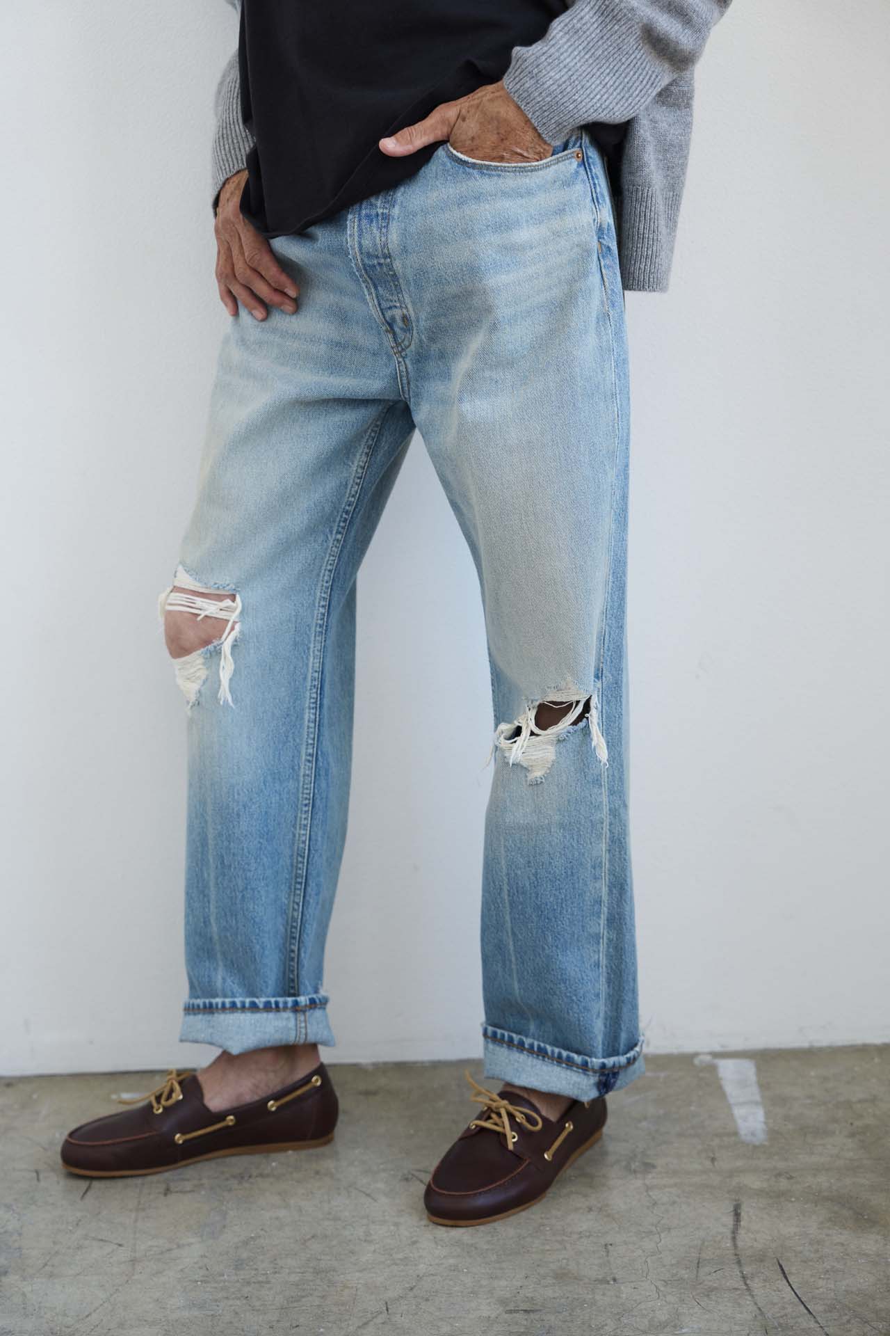 Inspired by every jean I have ever loved and worn out. The irreplaceable ones. The slouch is a mid rise, relaxed, ankle fit jean. An easy going fit that perfects a slung slouch and falls from the hip with ease. I prefer them with a knuckle deep, single cuff worn back to the loafer. They are the perfect loafer jean.