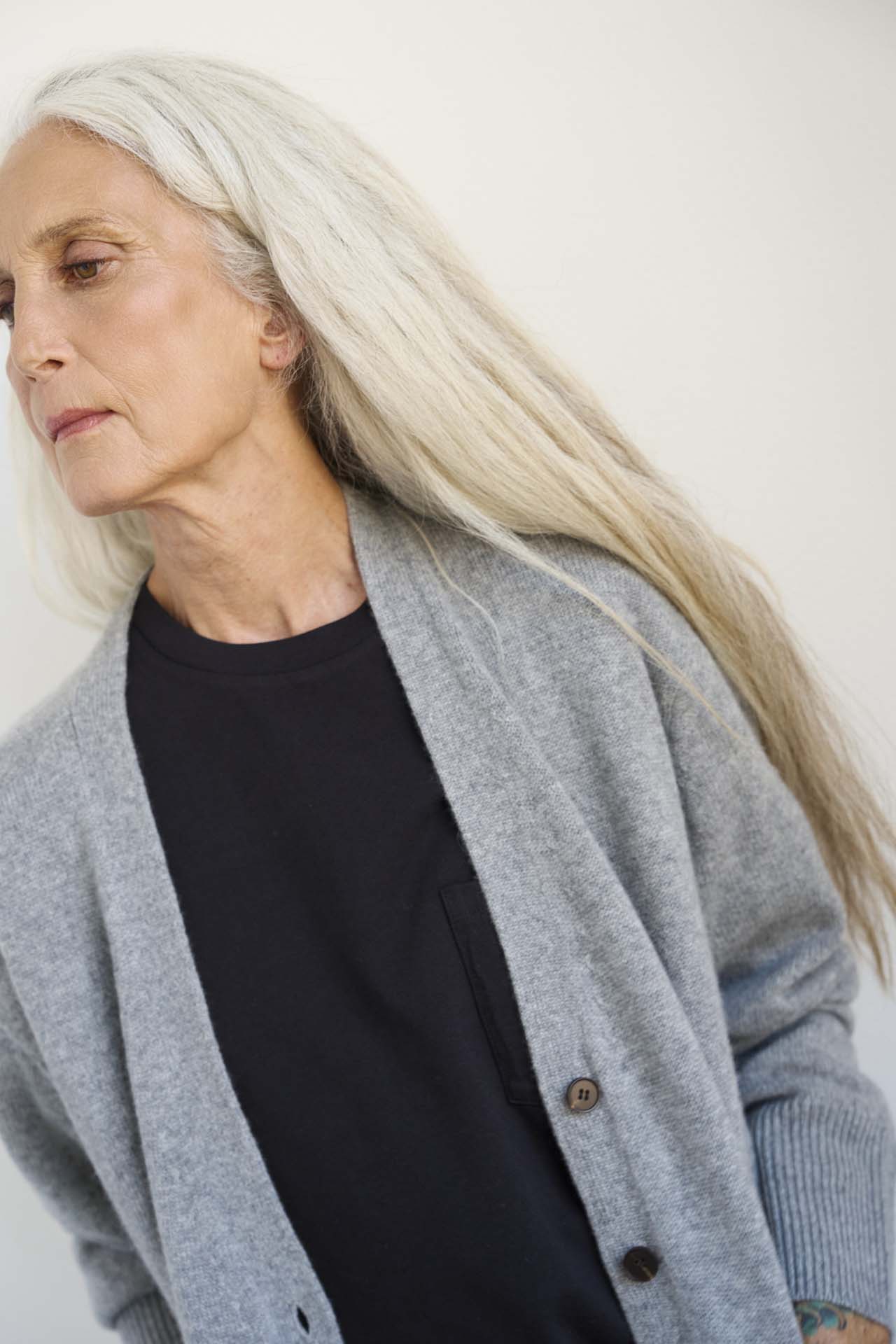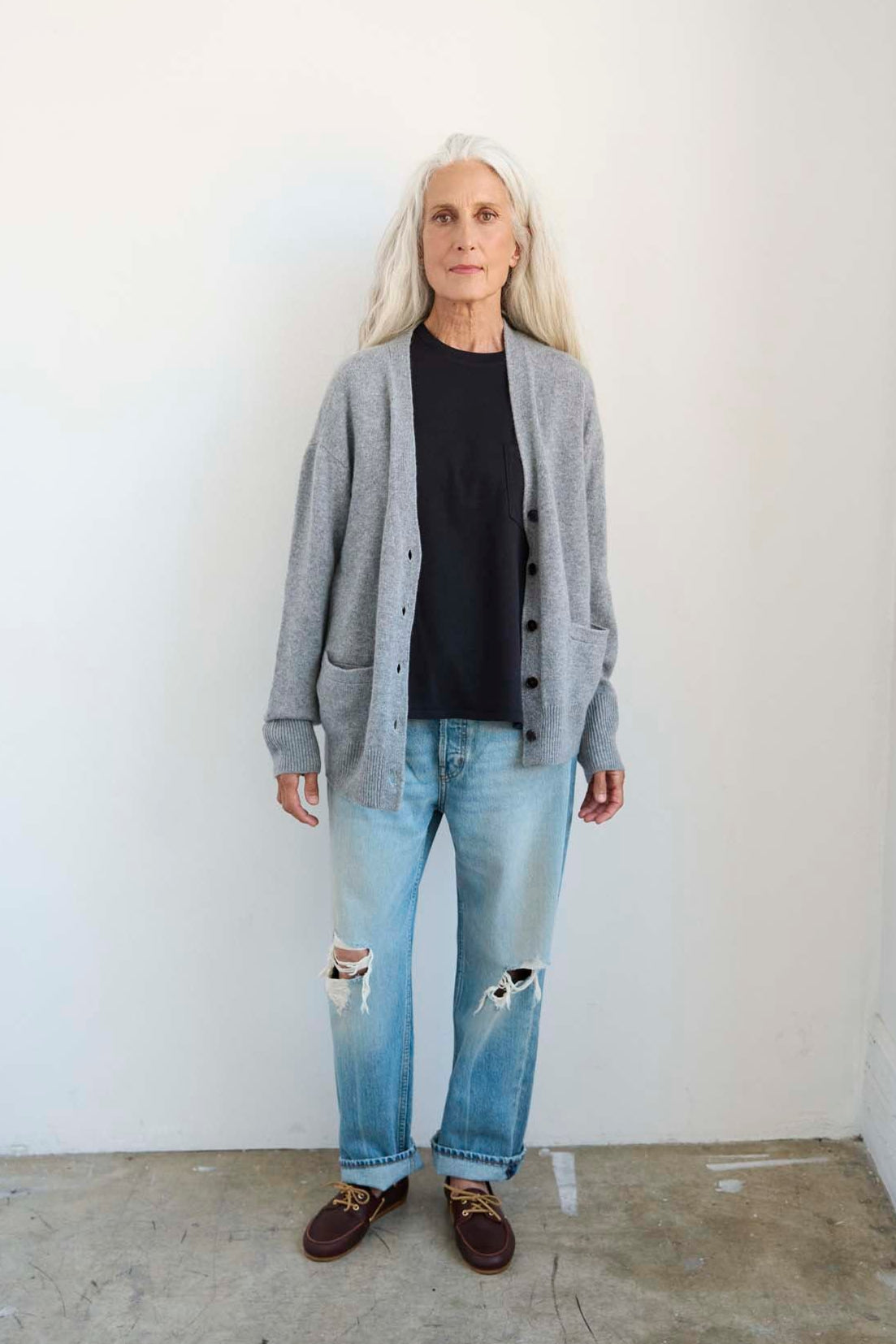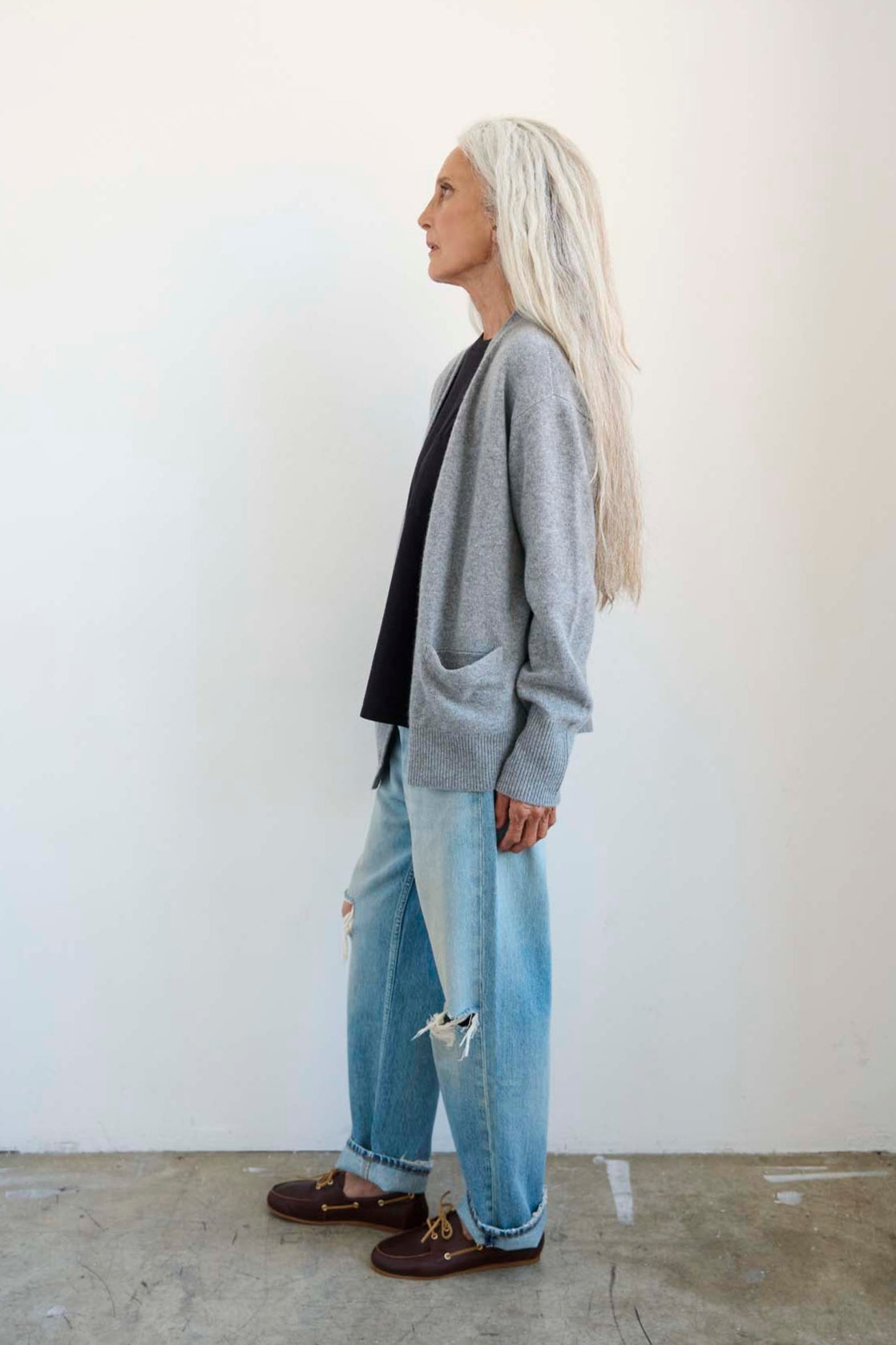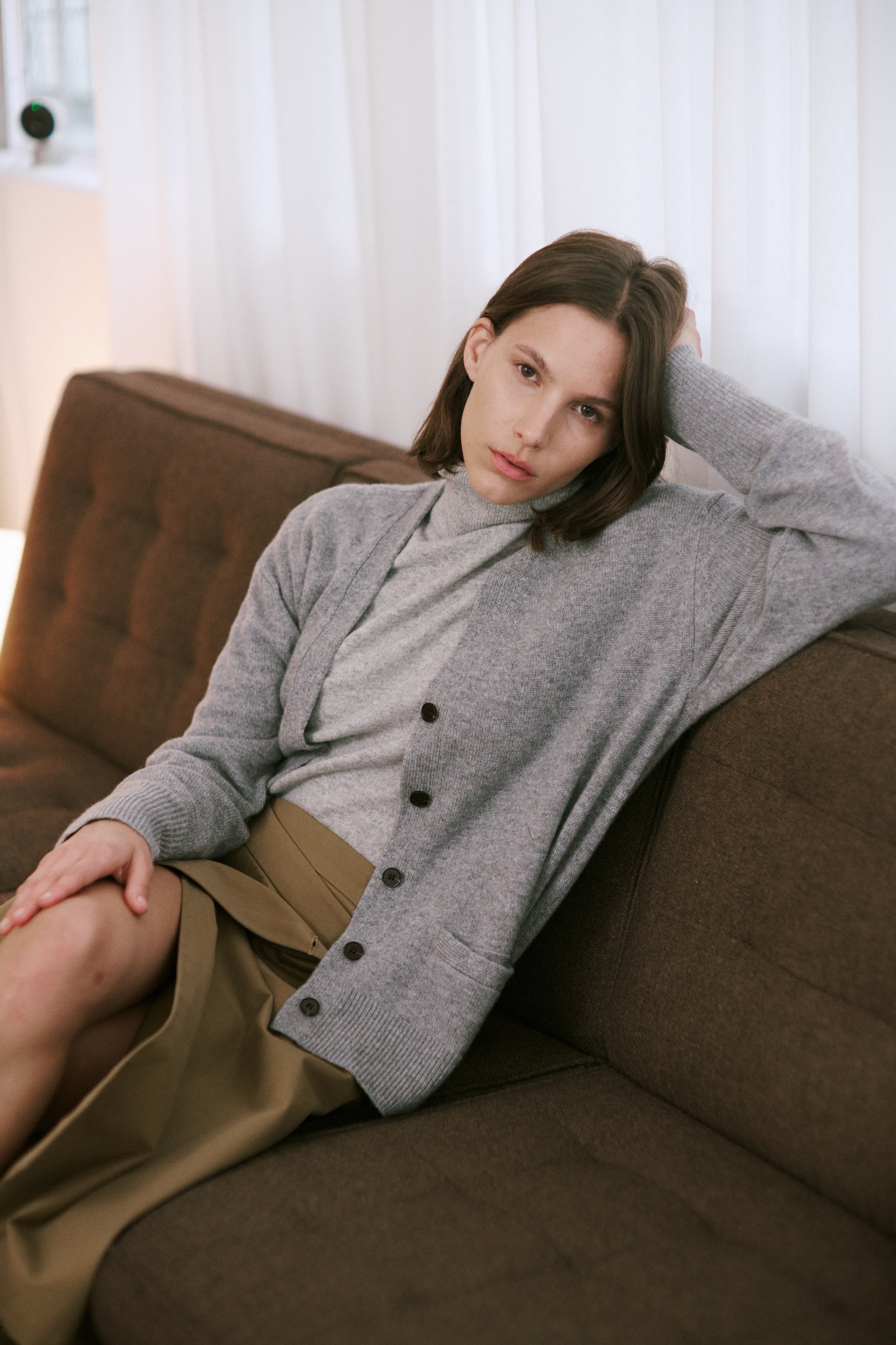 A slightly loose two ply cashmere cardigan, not too fitted and not too baggy. Semi Loose Perfection. The in-between of unstructured and structured. Fully fashioned 100% washed cashmere knit in 7gg yarn. Knit from royal cashmere expertly spun from raw materials sourced in Inner Mongolia. Cashmere encouraging sustainable deeply farming practices in Inner Mongolia which secure animal welfare and community based farming and herding traditions. Knit in Hong Kong with a designer knitting factory specializing in small designer production.