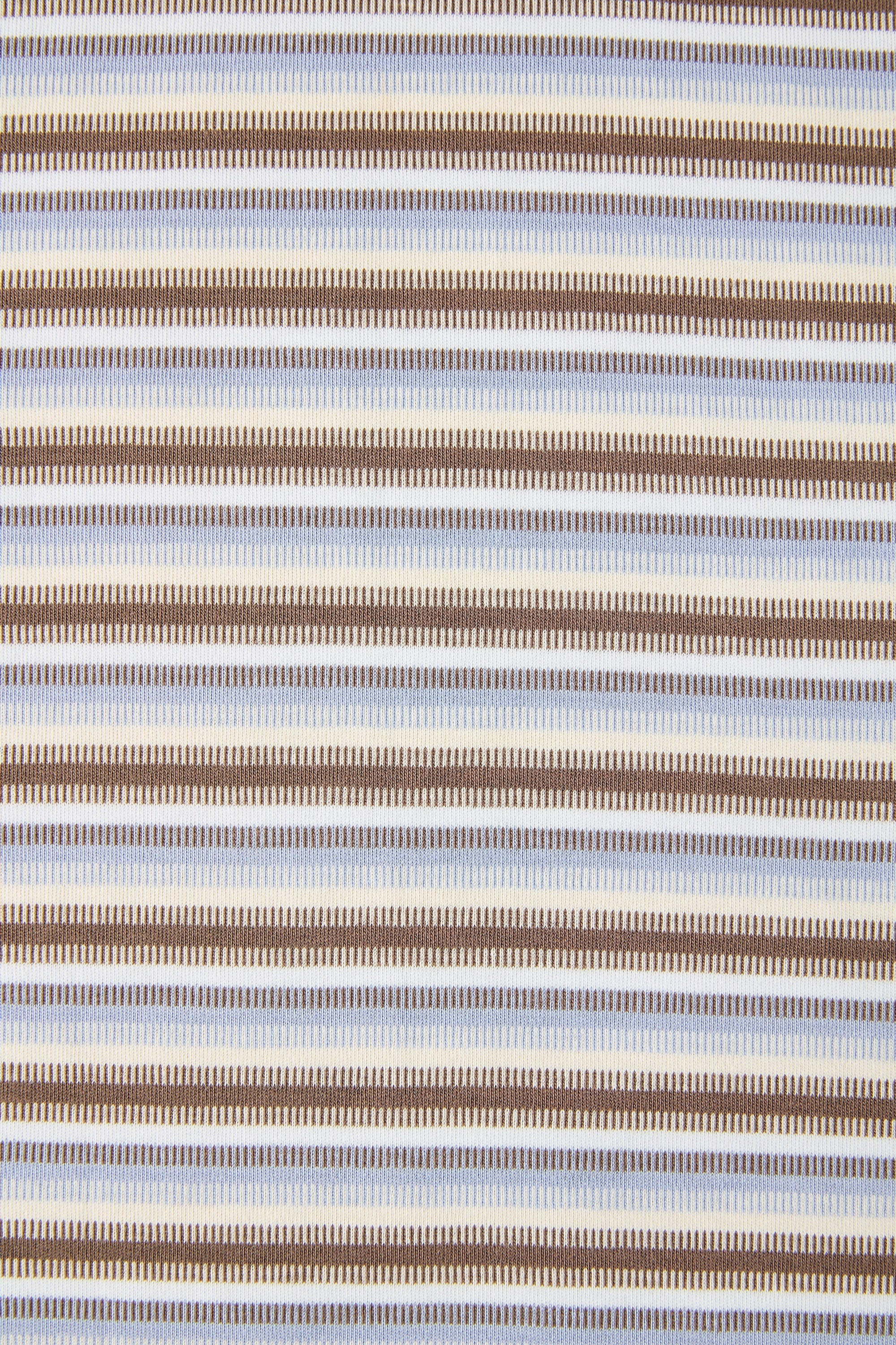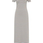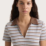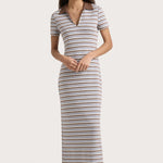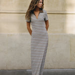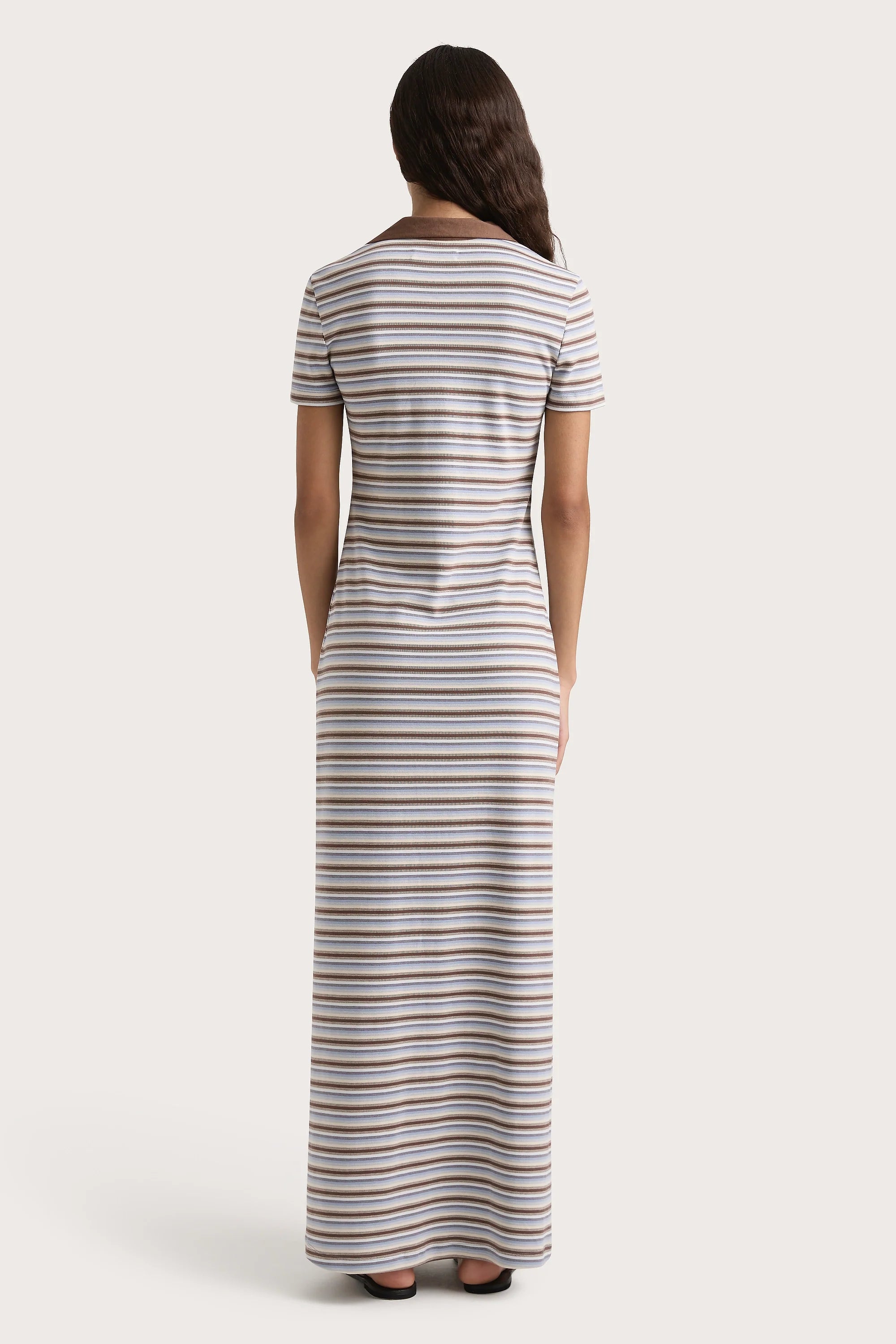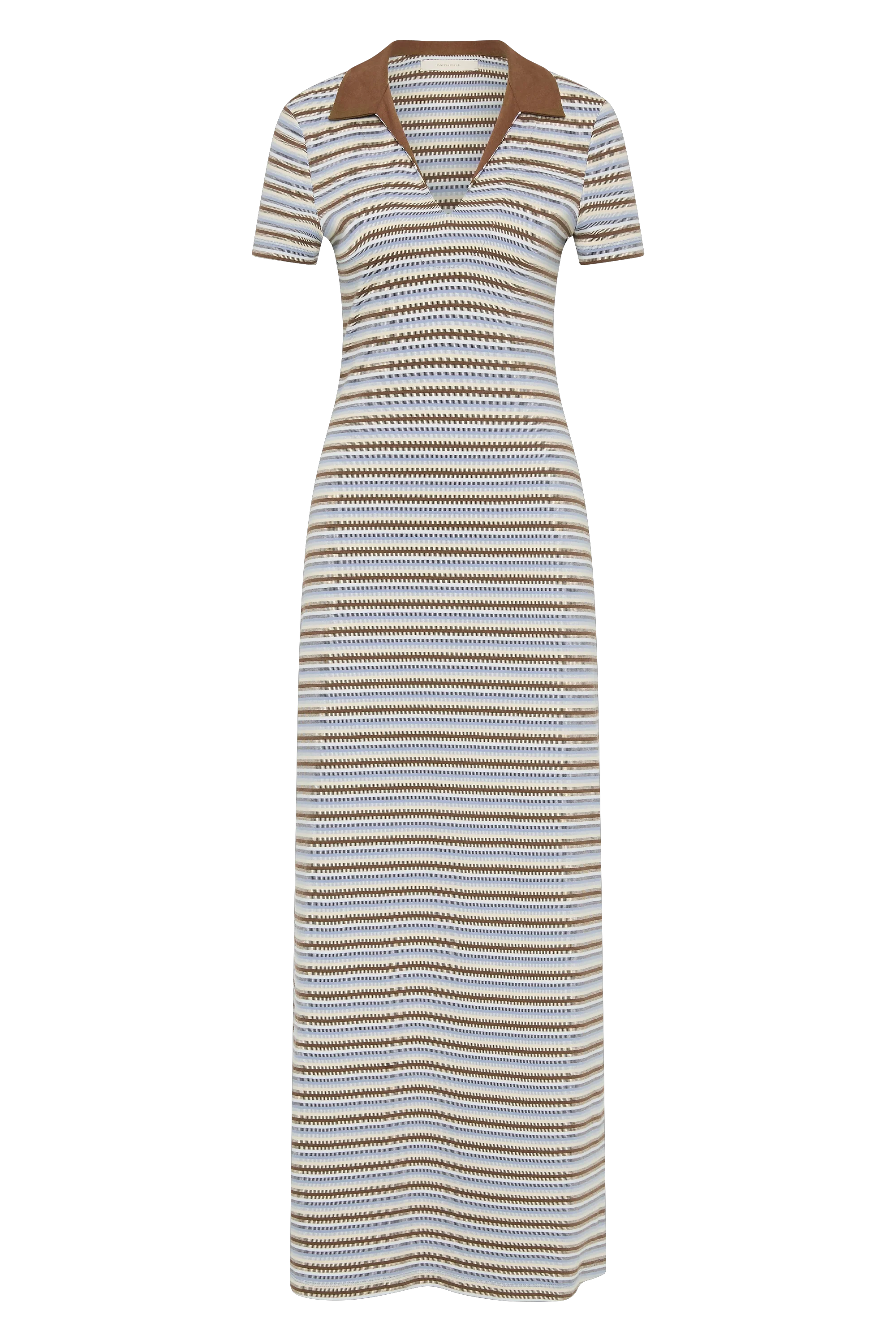 A polo-style maxi dress with a classic collar neckline and short sleeves. Relaxed in fit, it is a straight silhouette that effortlessly falls in line with the body, cropping below the ankles. Designed from an ultra soft 100% organic cotton in a light blue and chocolate brown stripe, wear with a simple sandal in the everyday and on vacation.