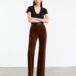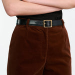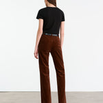 Flat front, high-rise straight leg trouser. Fitted through hips. Zip fly. Hidden hook-and-bar closure. Hidden stay button closure. Belt loops. Back welt pockets.