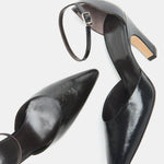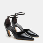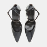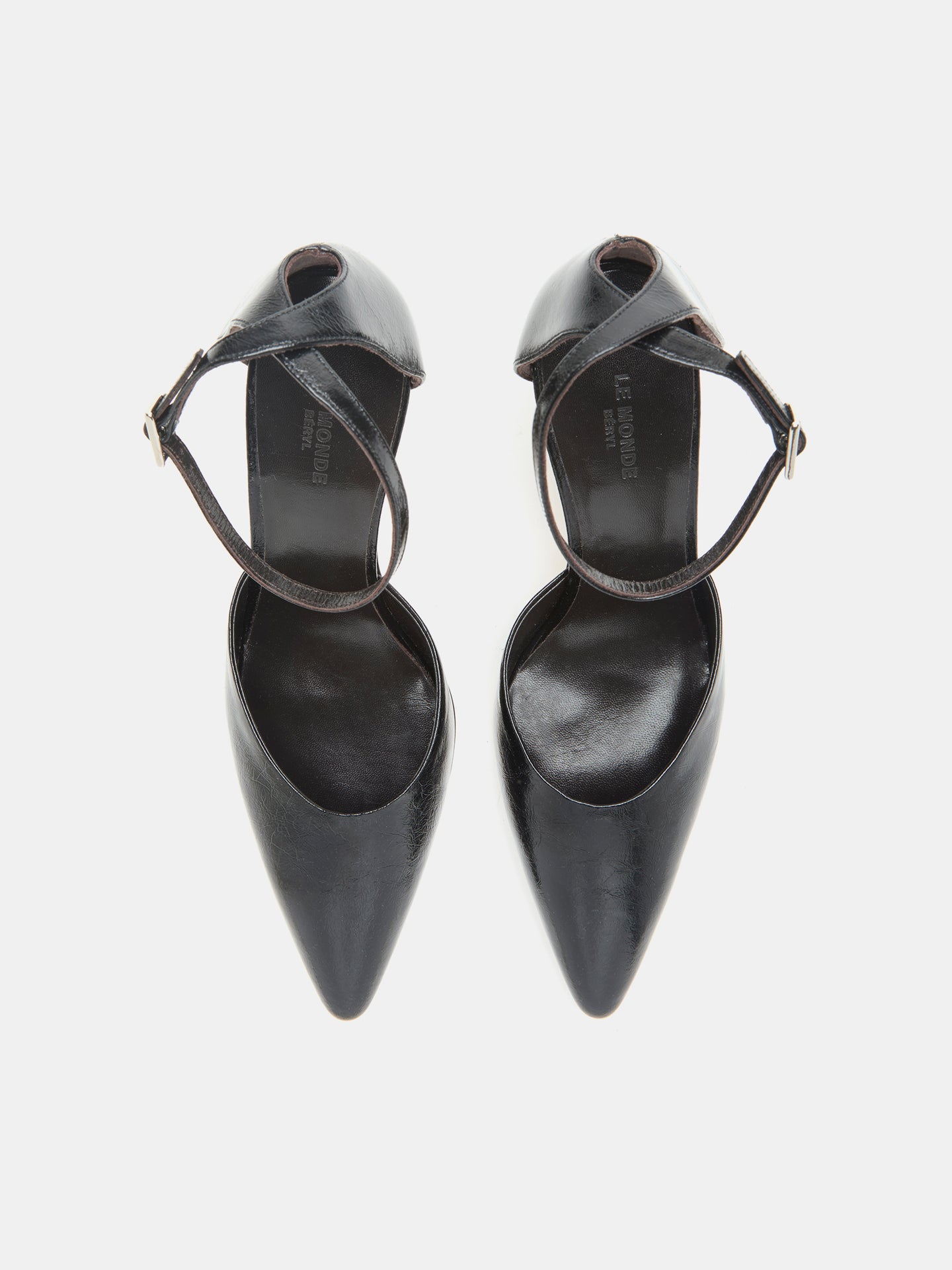 Victoria Pump, handcrafted in black glass leather with a closed pointed toe, ankle strap with buckle fastening and a cushioned calf leather insole. 80mm heel. Made in Italy.