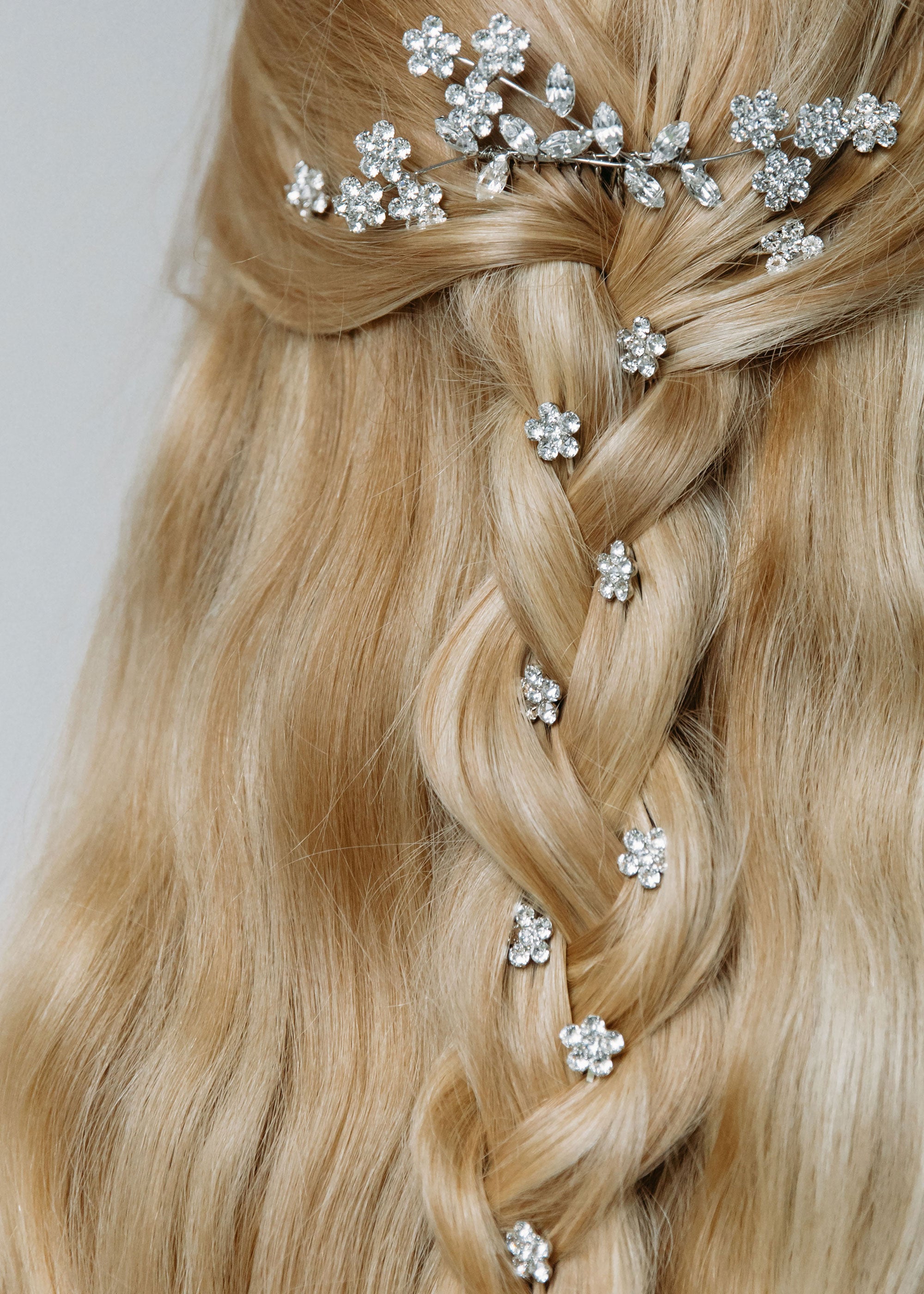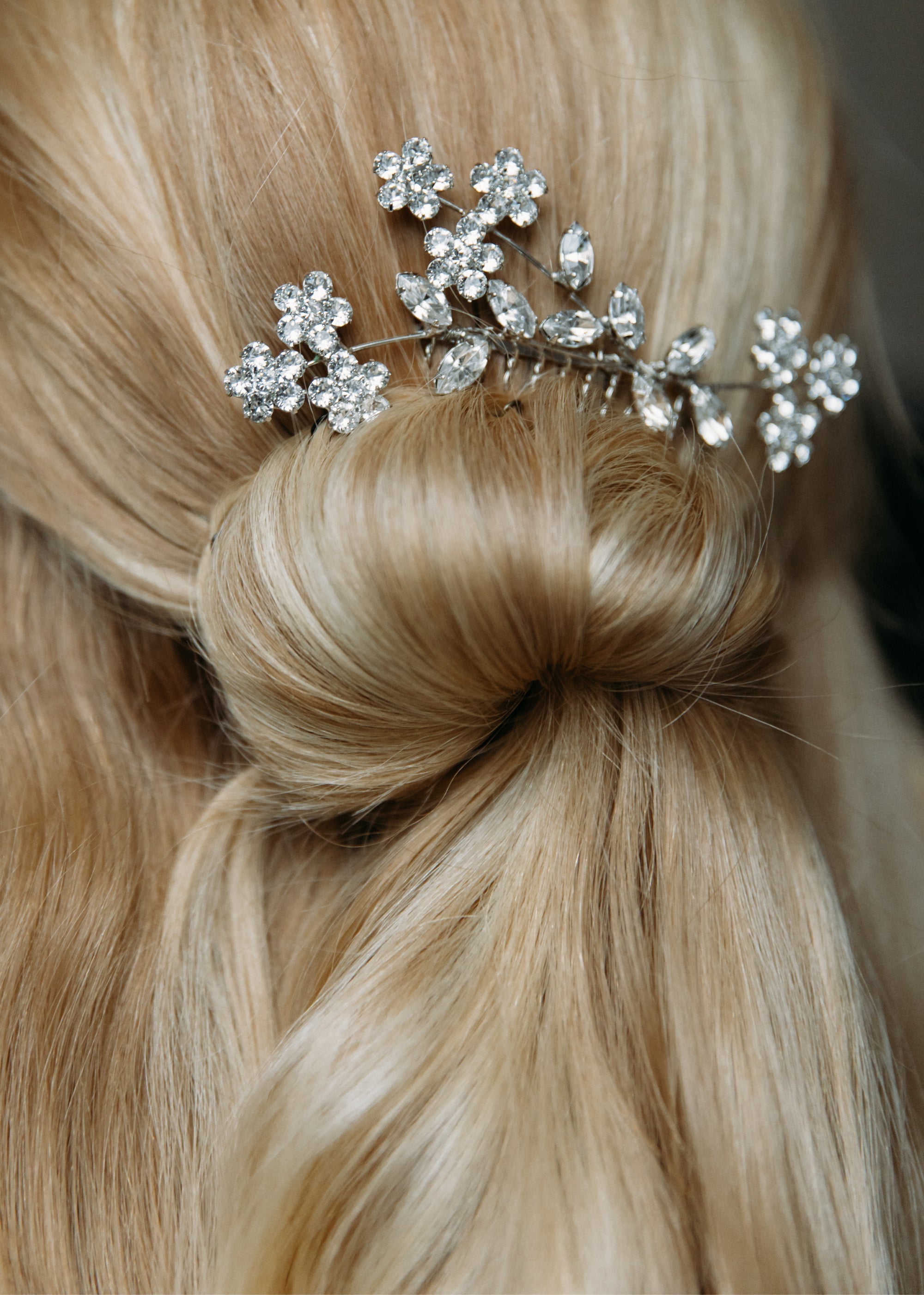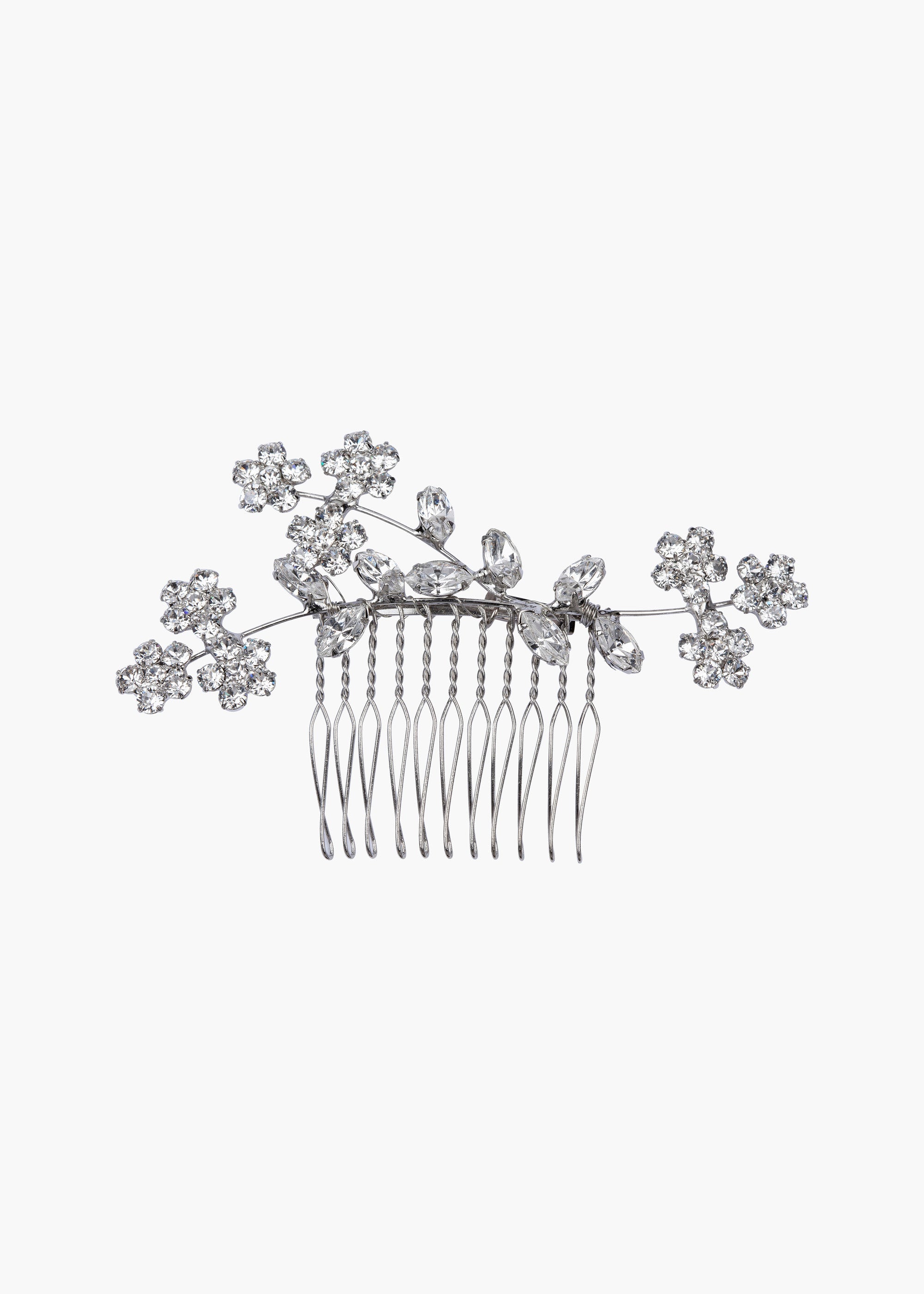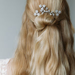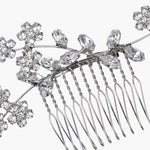 The Violet Comb creates a feminine, sparkling spray of flowers in your hair, with Swarovski crystal blooms in a delicate arrangement. Our combs can be worn solo, or paired with a bridal veil. We love the Violet Comb with Violet Bobby Pins mixed in, to create a look that's uniquely yours. Dimensions: 4 x 2.5 inches Weight: 17g