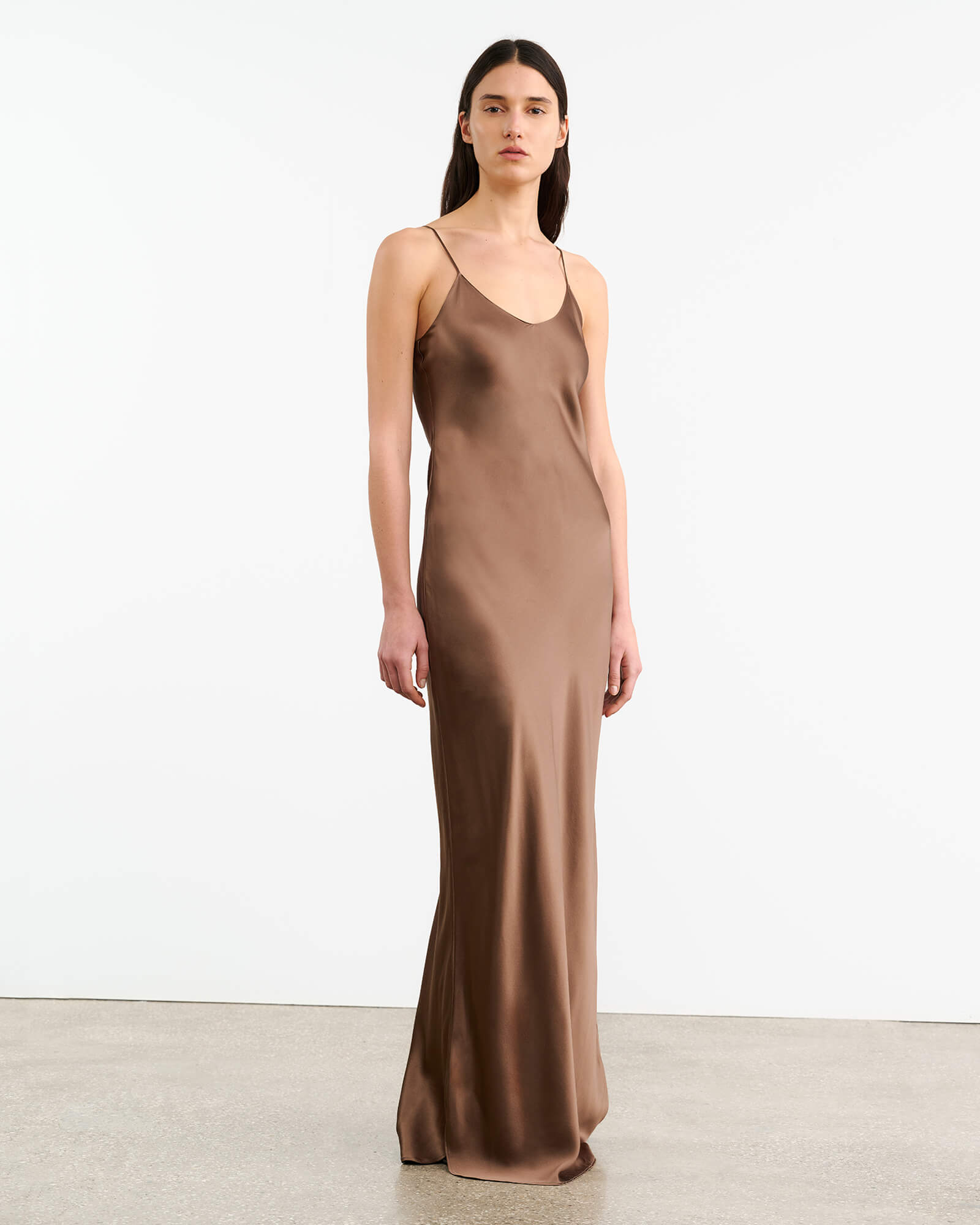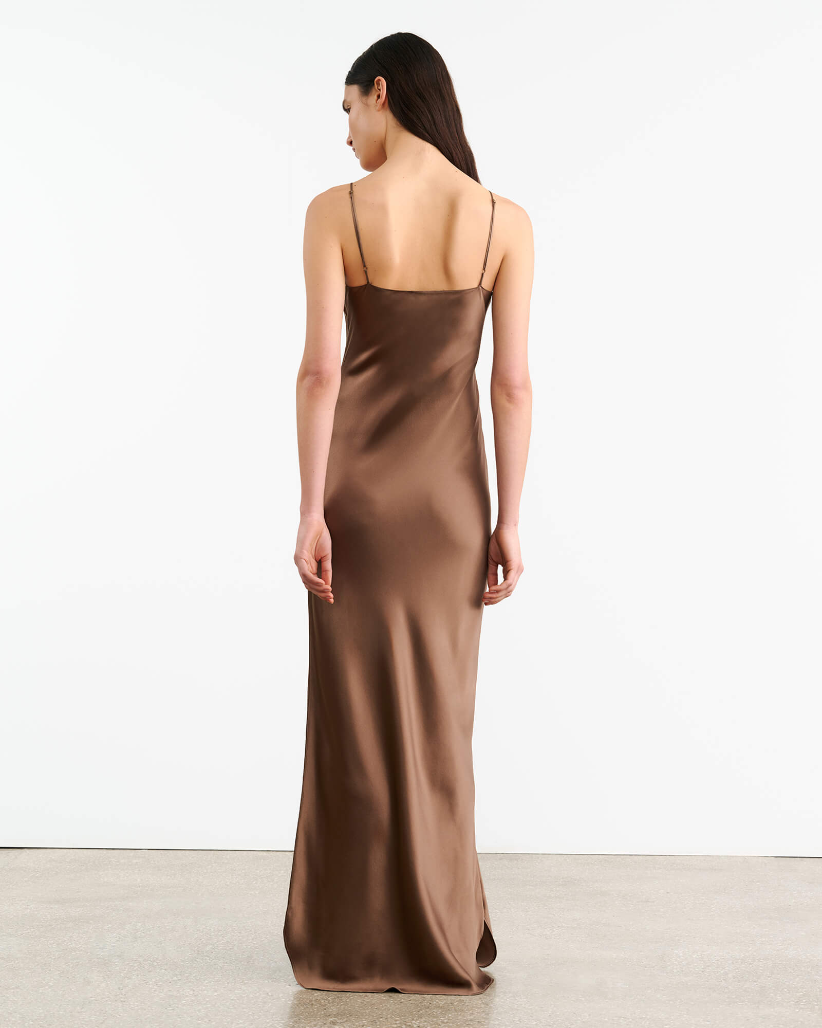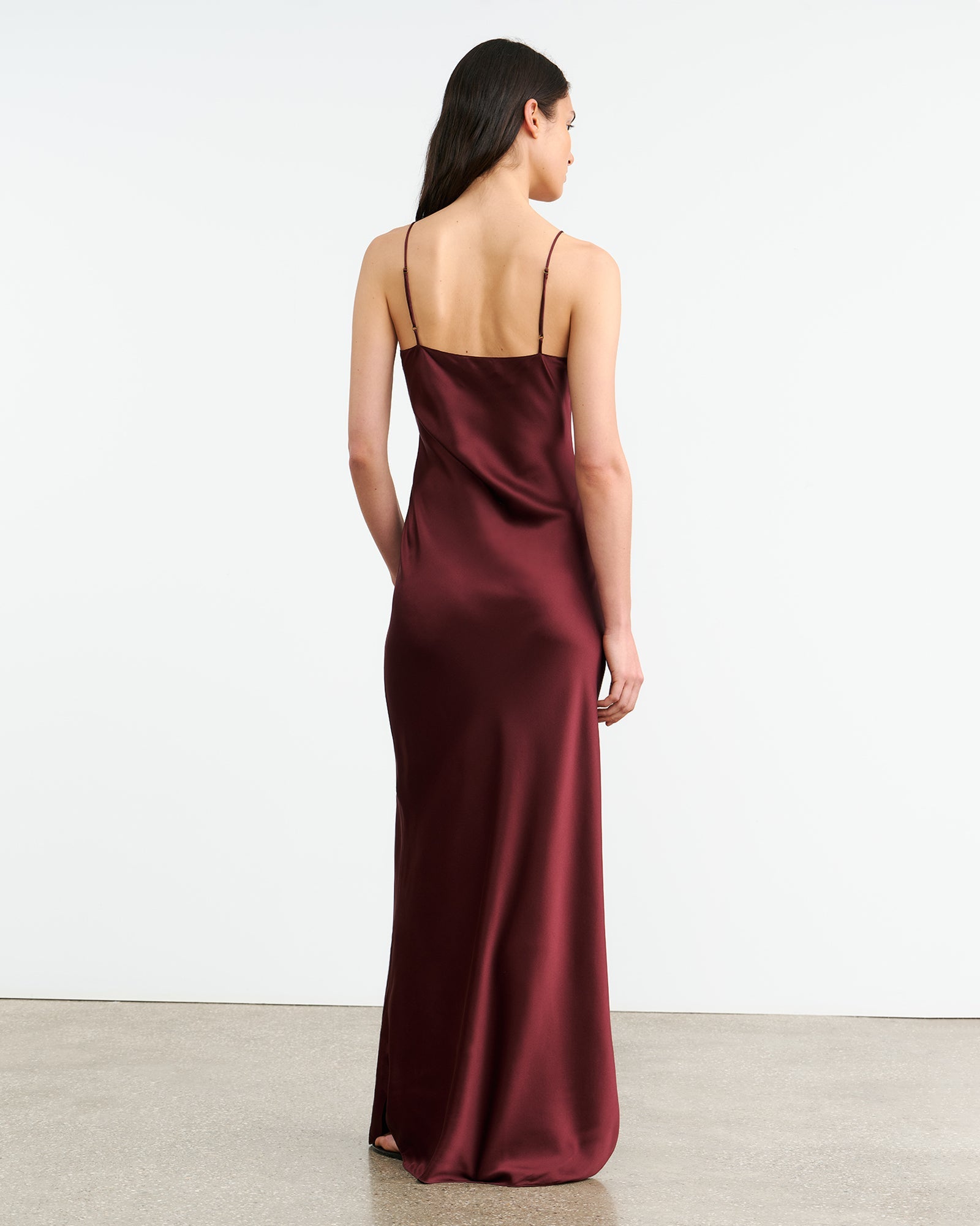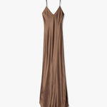 Bias cut floor length gown in silk charmeuse. Adjustable skinny straps. Shirt tale detail at hem.