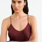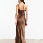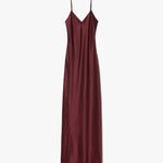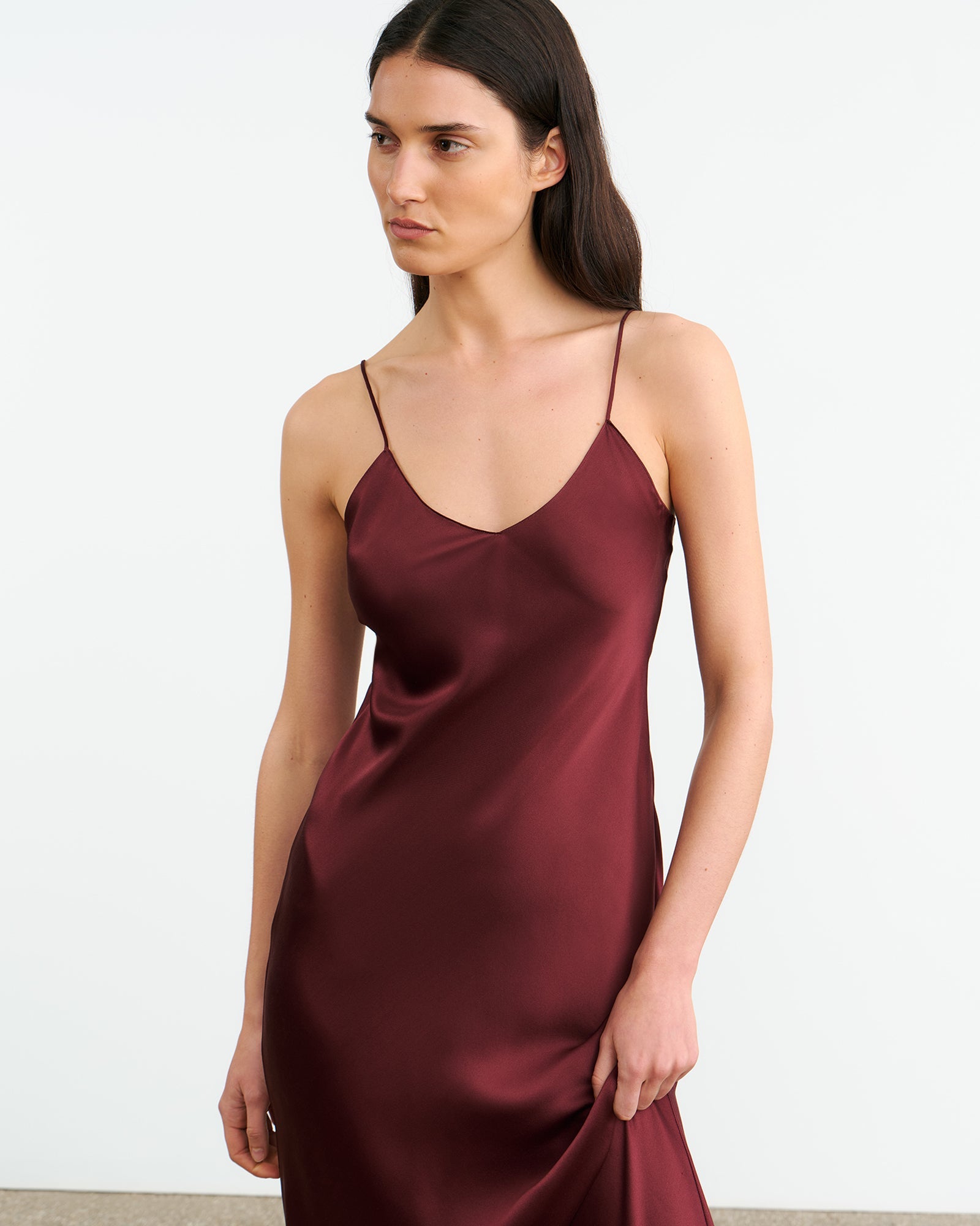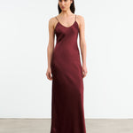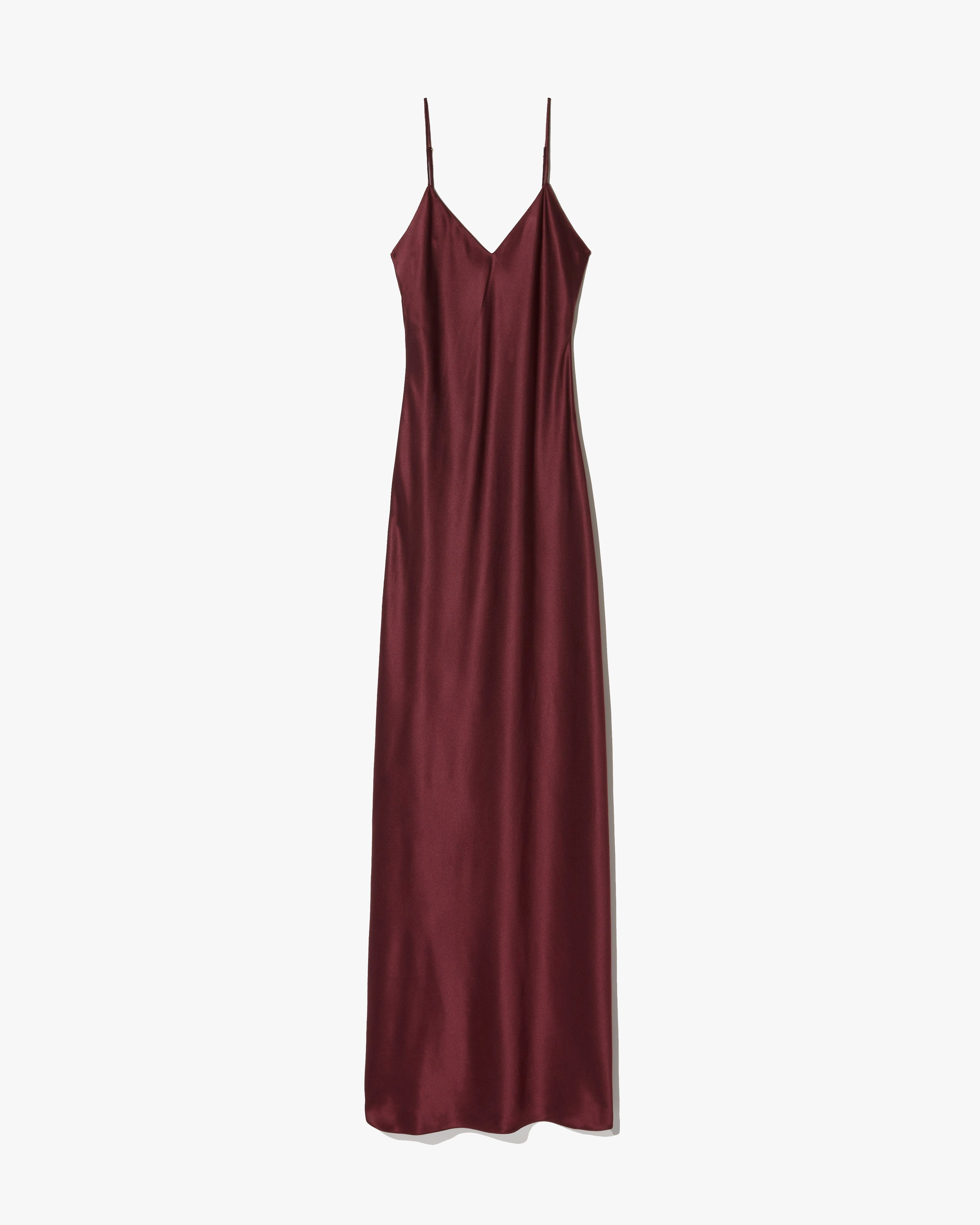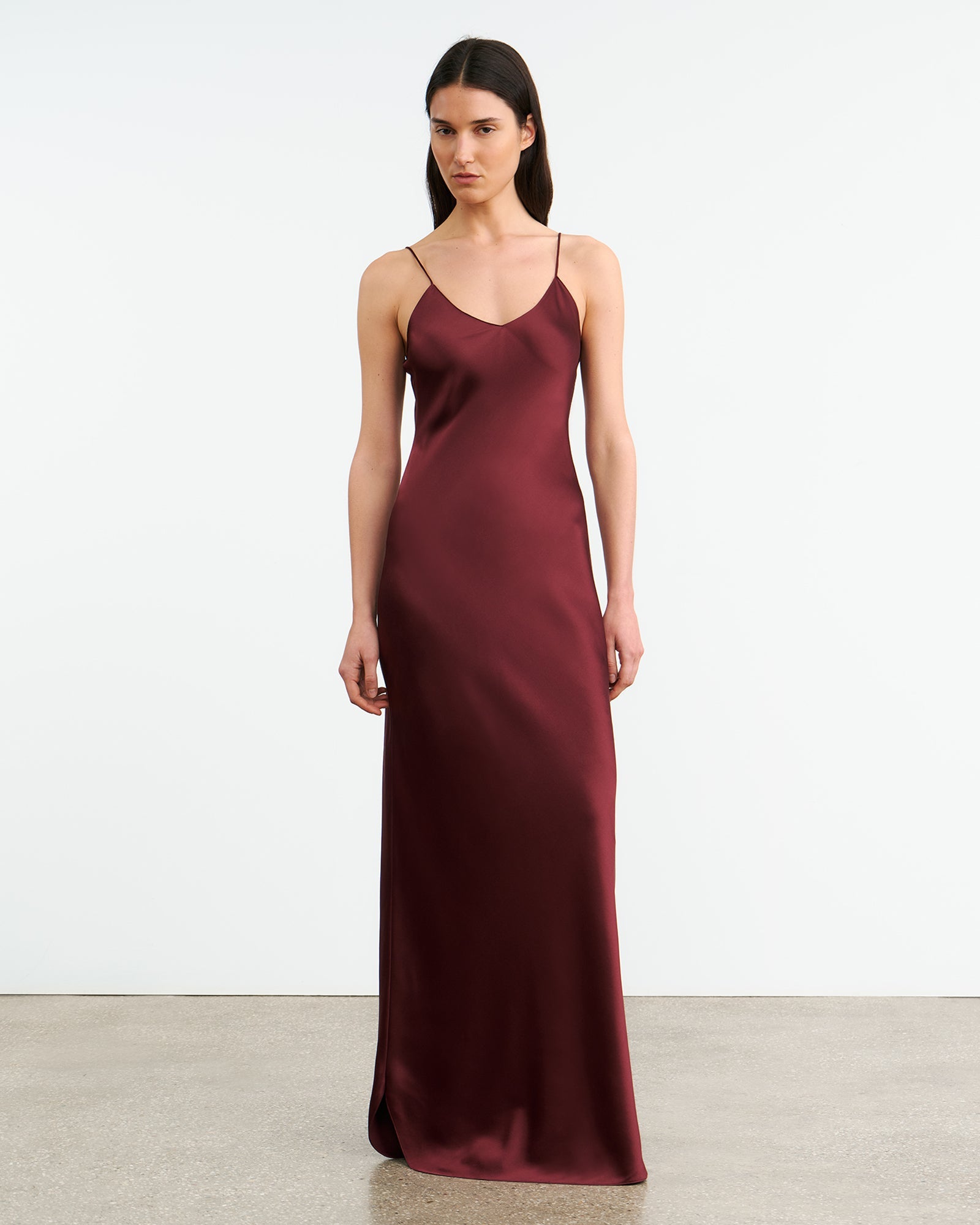 Bias cut floor length gown in silk charmeuse. Adjustable skinny straps. Shirt tale detail at hem.