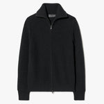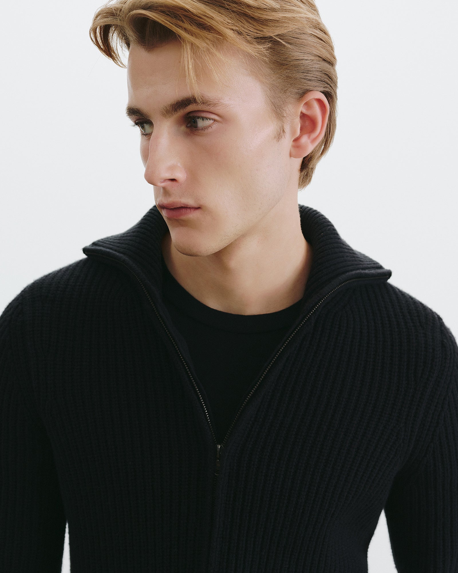 Long sleeve full zip cardigan. Medium weight in half cardigan rib. Relaxed fit. Medium body length. Regular sleeve length. 1x1 rib at cuff and hem. Neck is in half cardigan rib. 2 way logo zip from hem to edge of neck trim. Fashioning at back shoulder and sleeve.