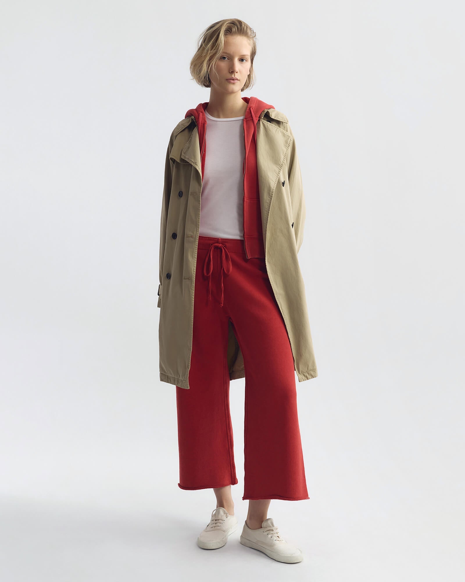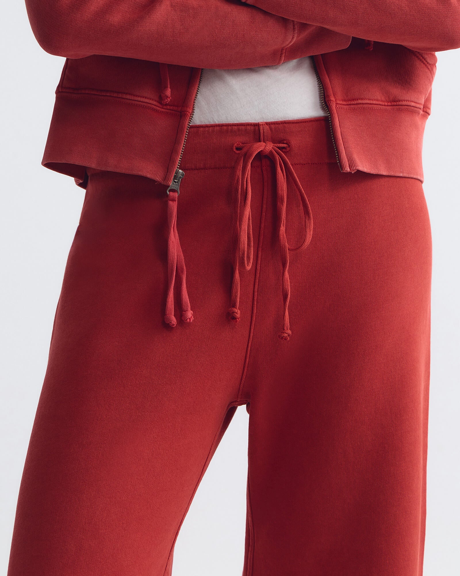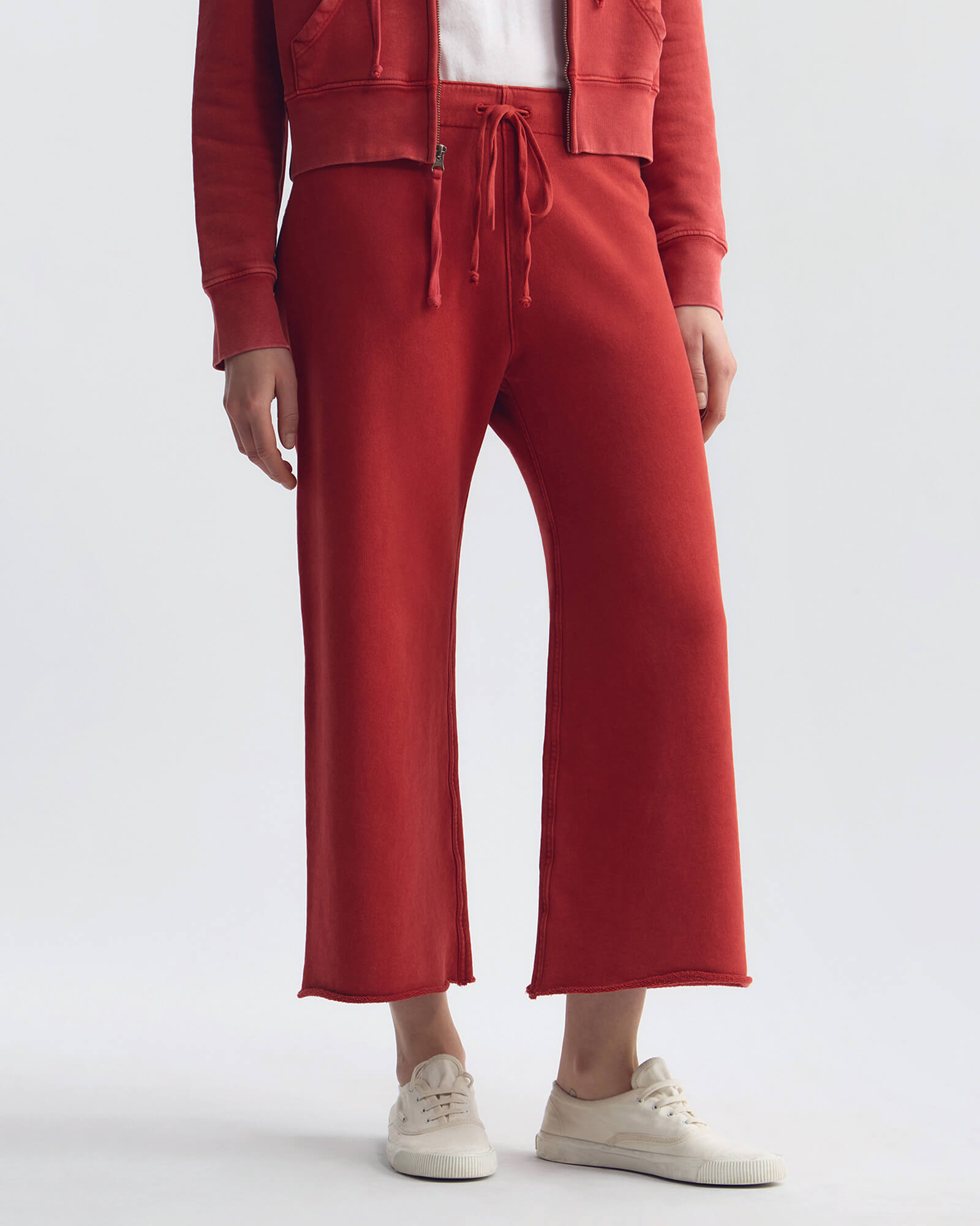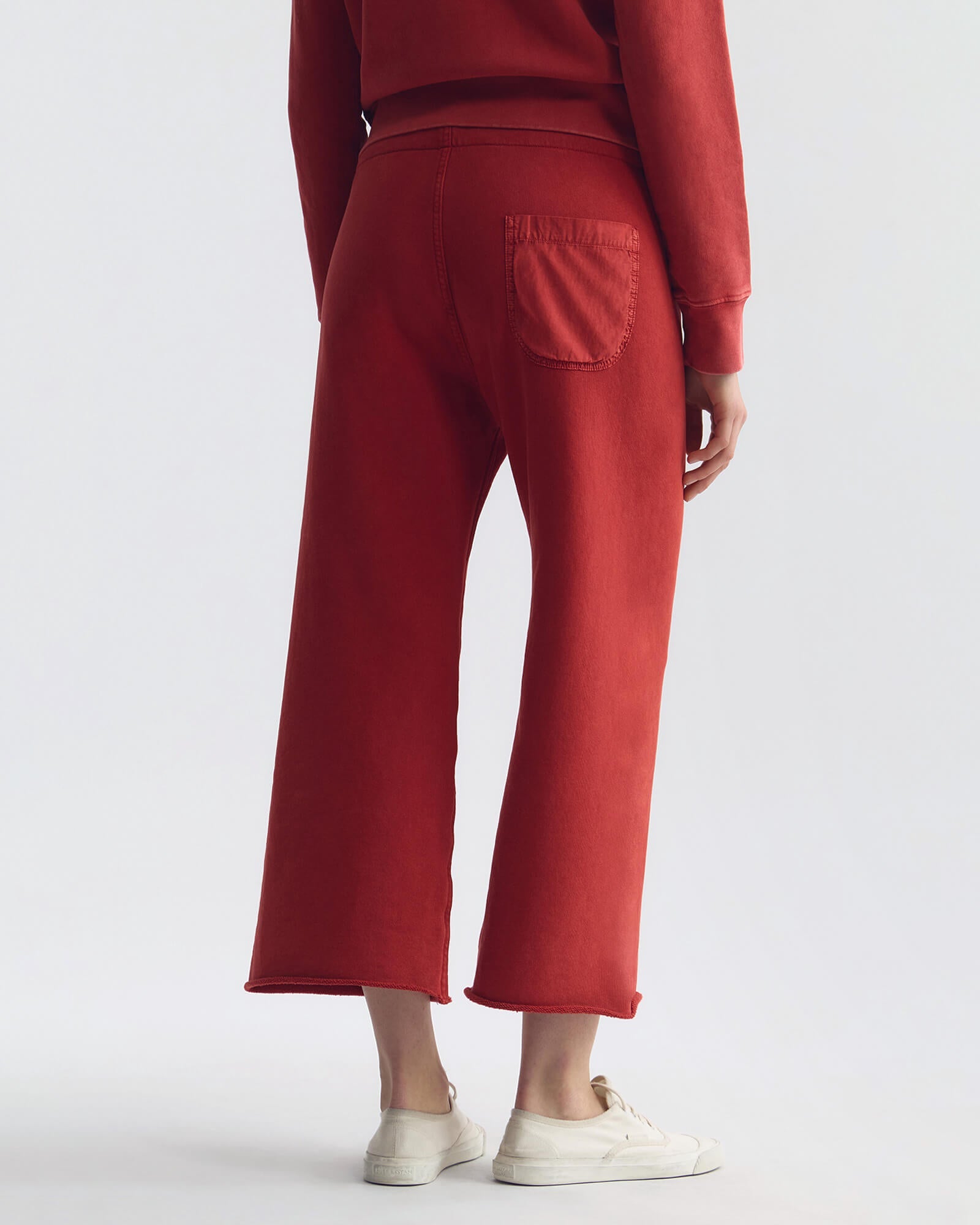 Wide-leg cropped sweatpant in classic French terry. Garment dyed with drawstring waistband, single back pocket in woven fabric combo, and raw-cut hem with subtle roll.