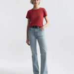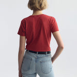 Straight fit short sleeve tee shirt in cotton. Vintage pitch short sleeve. Self-binding along neck and shoulder.