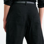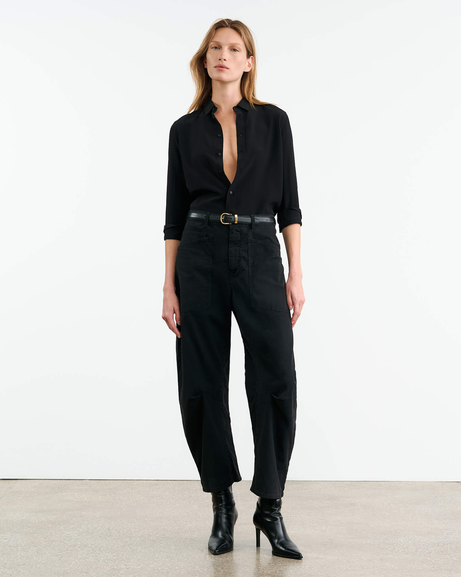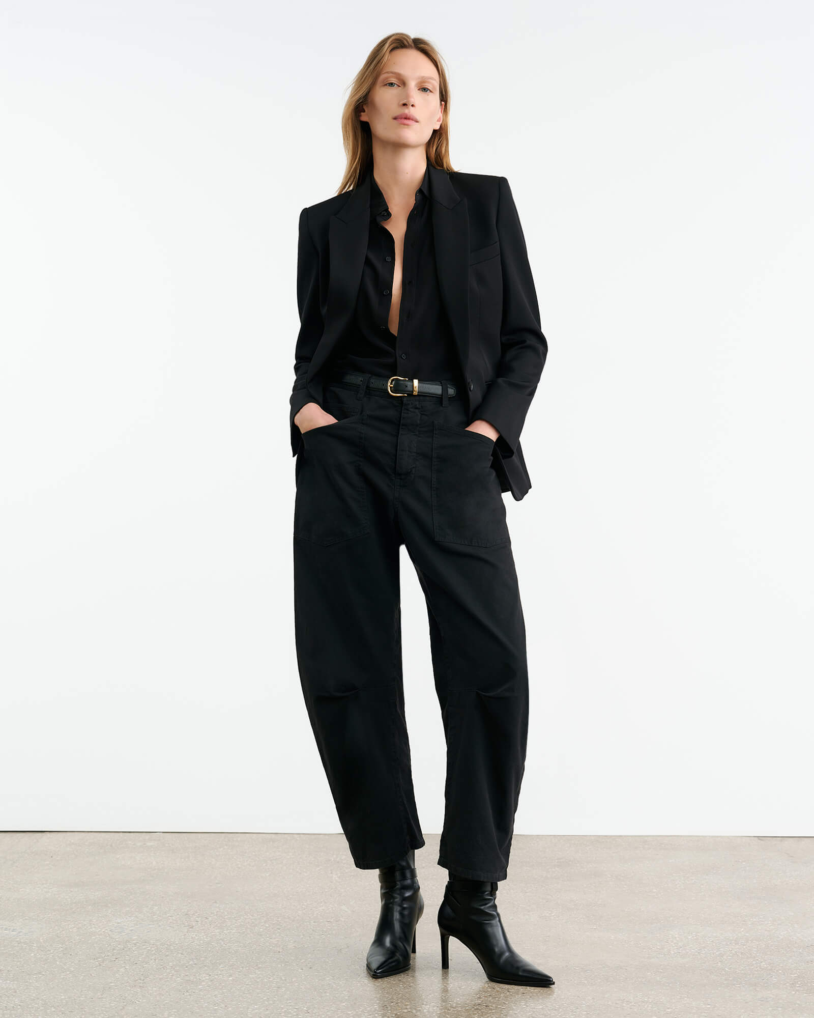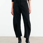 Mid-rise, relaxed fit barrel leg pant. Uniquely curved silhouette. Seam detail at knees. Gusset at inseam. Zip fly. Hidden hook-and-bar closure. Hidden stay button closure. Top-stitched front and back patch pockets. Belt loops.