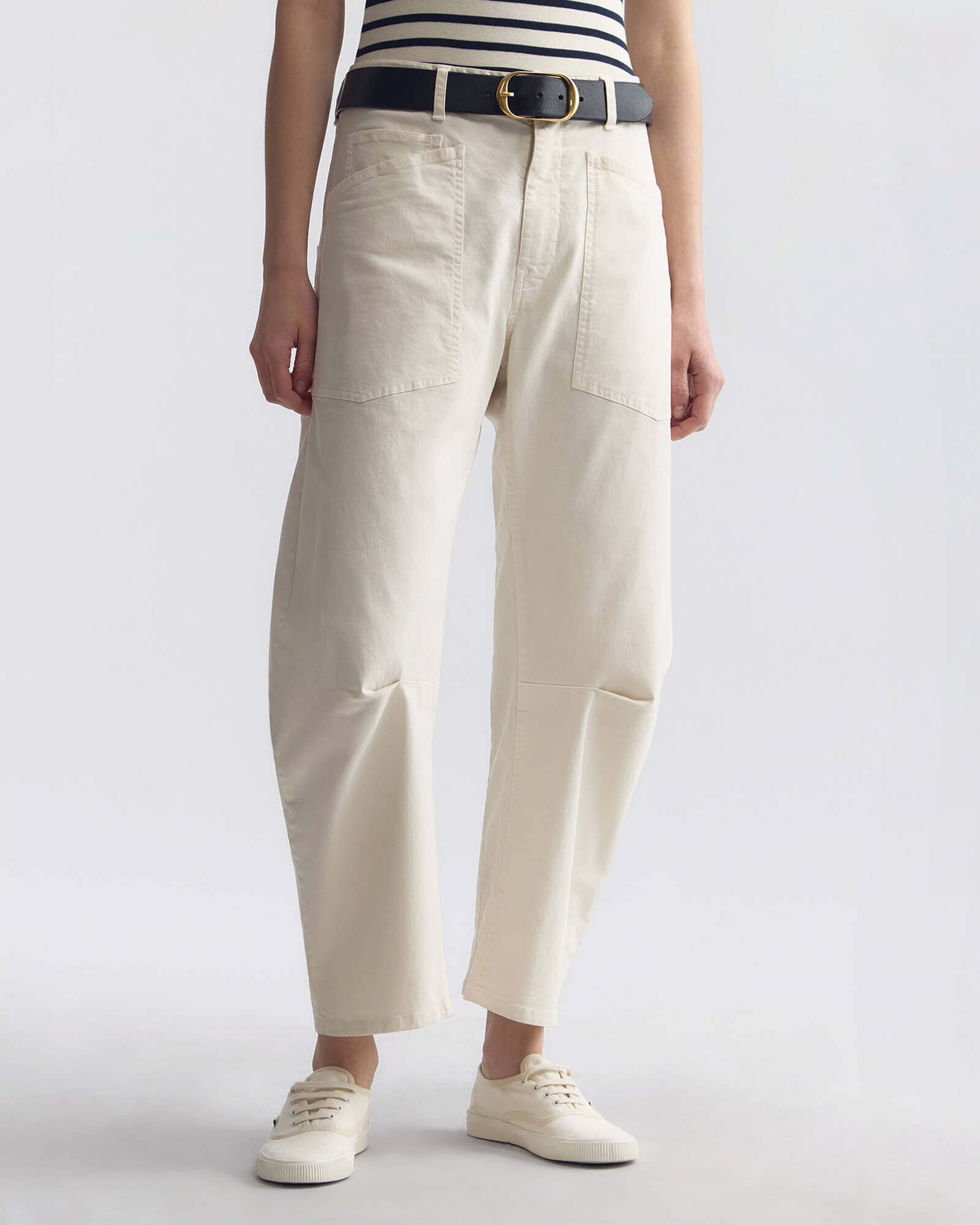 Mid-rise, relaxed fit barrel leg pant. Uniquely curved silhouette. Seam detail at knees. Gusset at inseam. Zip fly. Hidden hook-and-bar closure. Hidden stay button closure. Top-stitched front and back patch pockets. Belt loops.