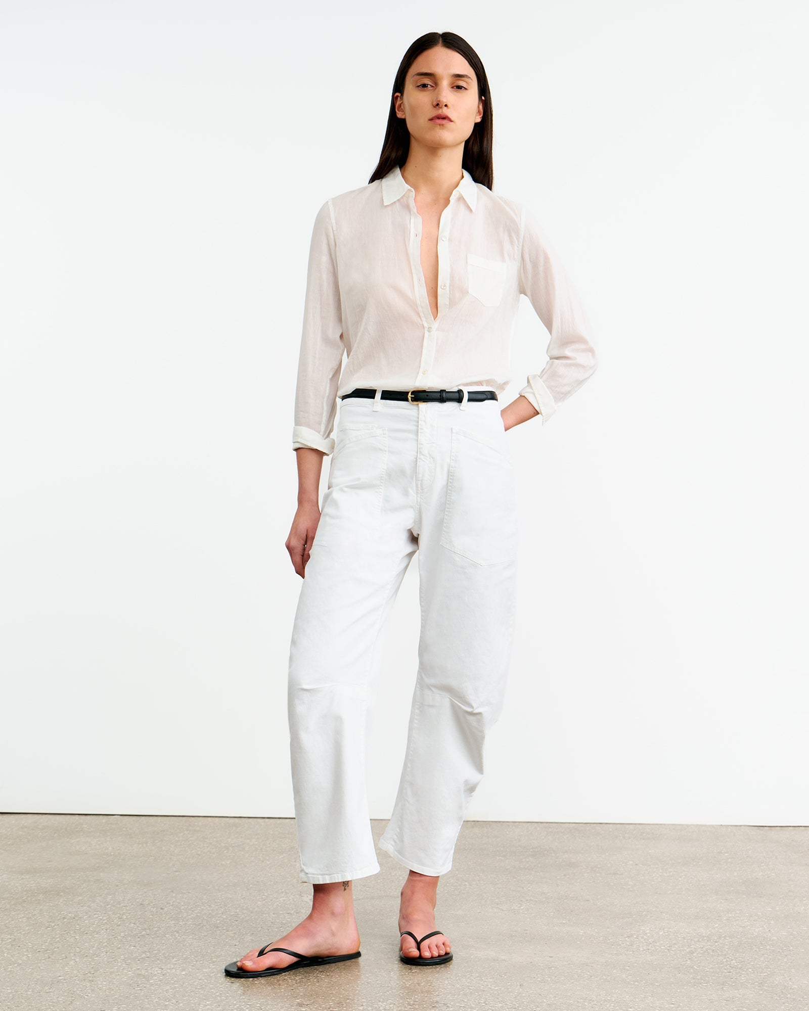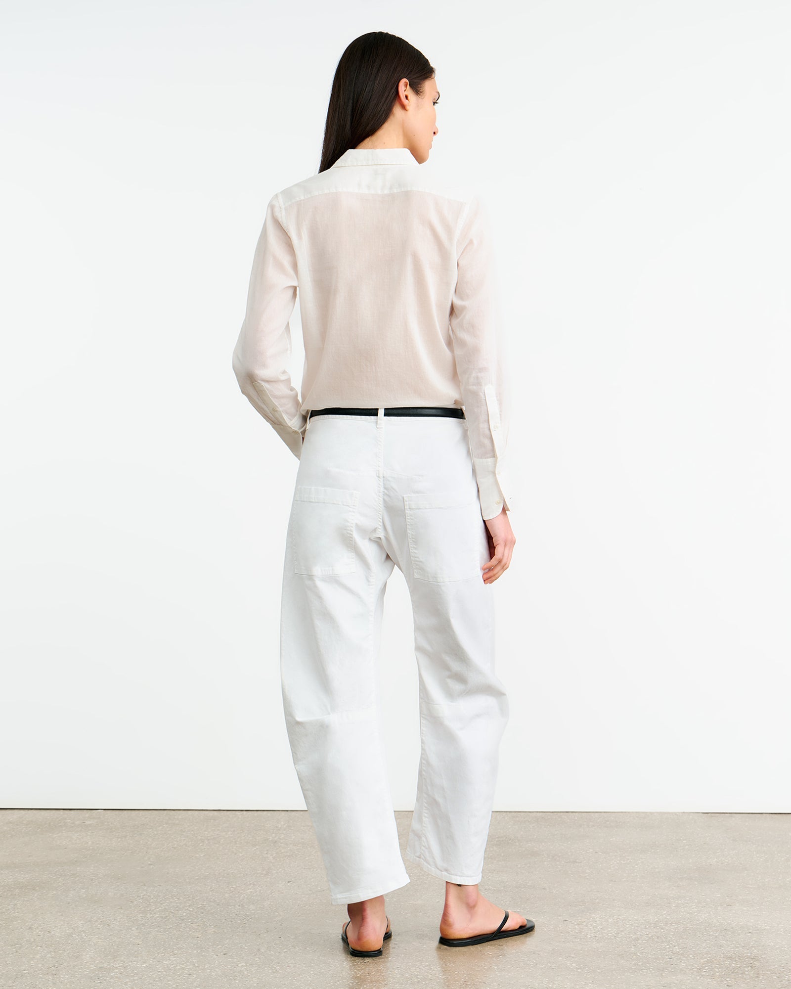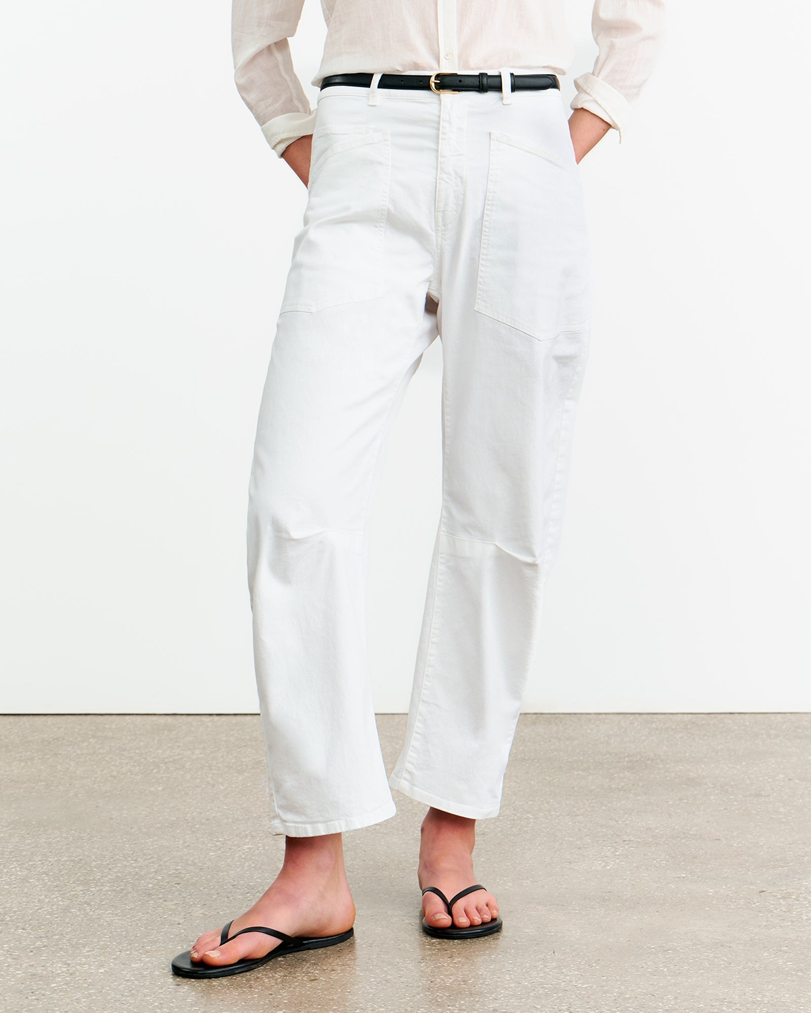Mid-rise, relaxed fit barrel leg pant. Uniquely curved silhouette. Seam detail at knees. Gusset at inseam. Zip fly. Hidden hook-and-bar closure. Hidden stay button closure. Top-stitched front and back patch pockets. Belt loops.
