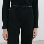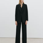 High-rise pant relaxed through the thigh and hip. Belt loops at waistband. Back welt pockets.