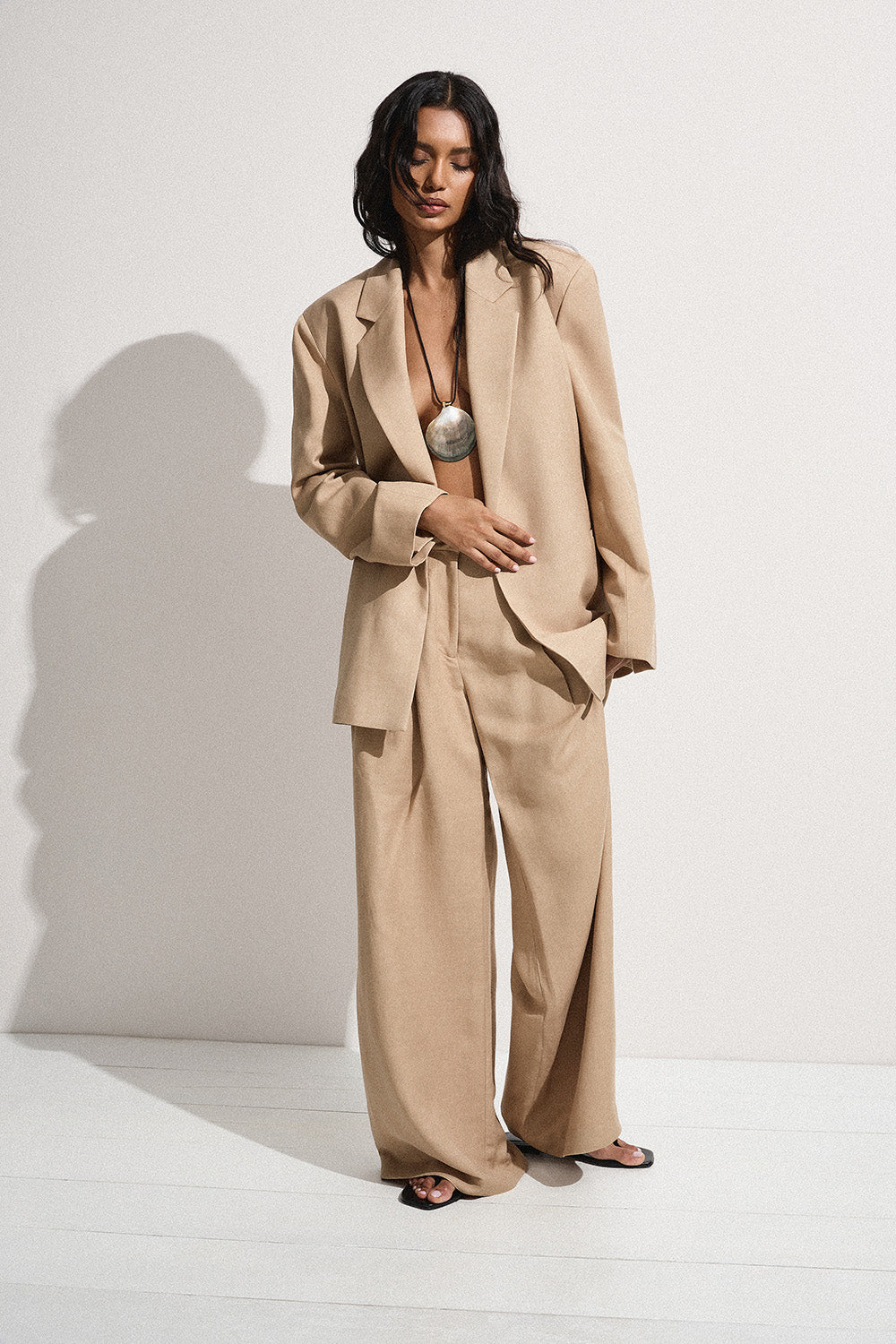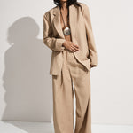 A softly tailored high-rise trouser with classic structuring around the waist with belt loops, a front fly opening and side pockets. There are pleats through the front leg which then flare out into a wide leg silhouette, cropping around the ankles. Designed from an ultra soft blend of viscose, rayon and a signature 100% European Flax® linen fabrication in a warm desert shade, style with matching Felix Blazer for an effortless approach to suiting.