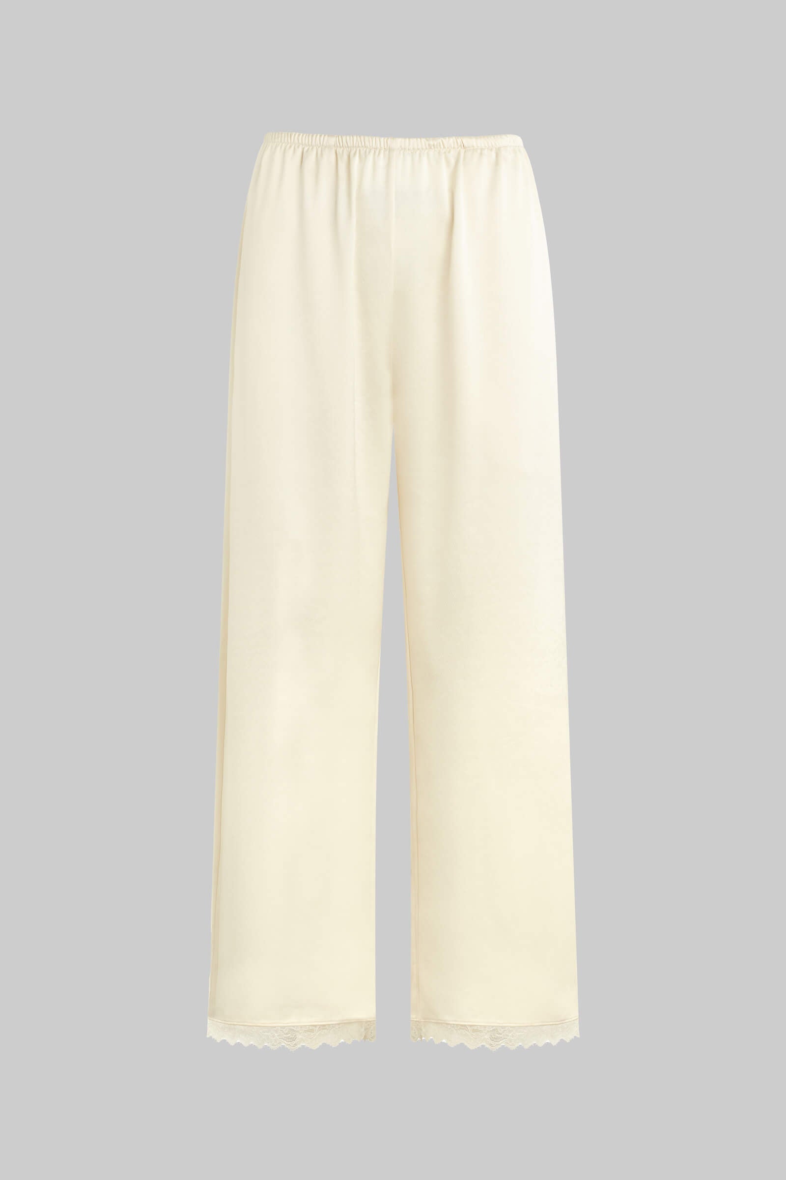 Cut in our Japanese-crafted Barb Lace Satin, the Barb Lace Crop Pant is a pull-on style pant that features a straight leg, soft elastic waistband, and a cropped length. Finished with a fine, scalloped lace edge.