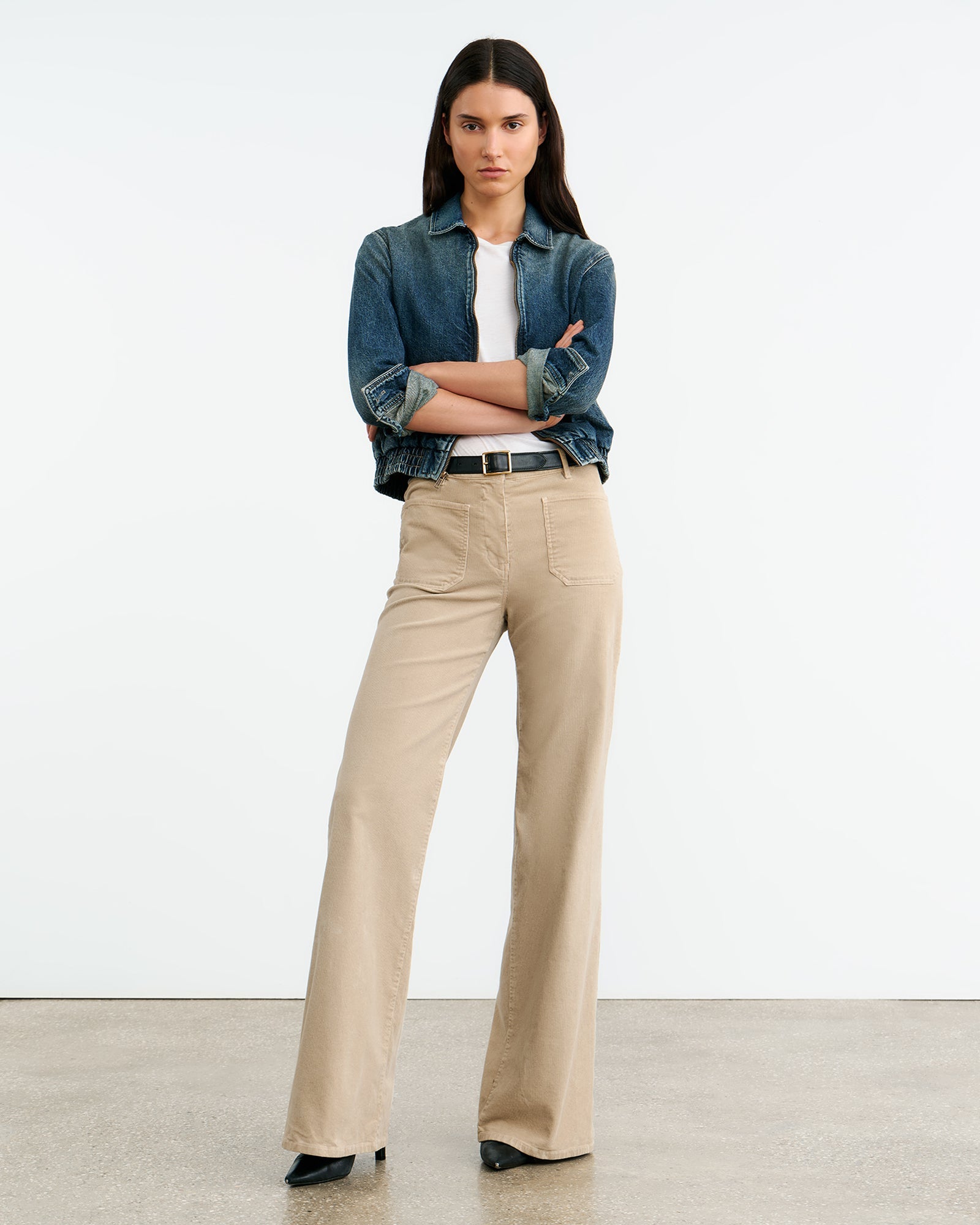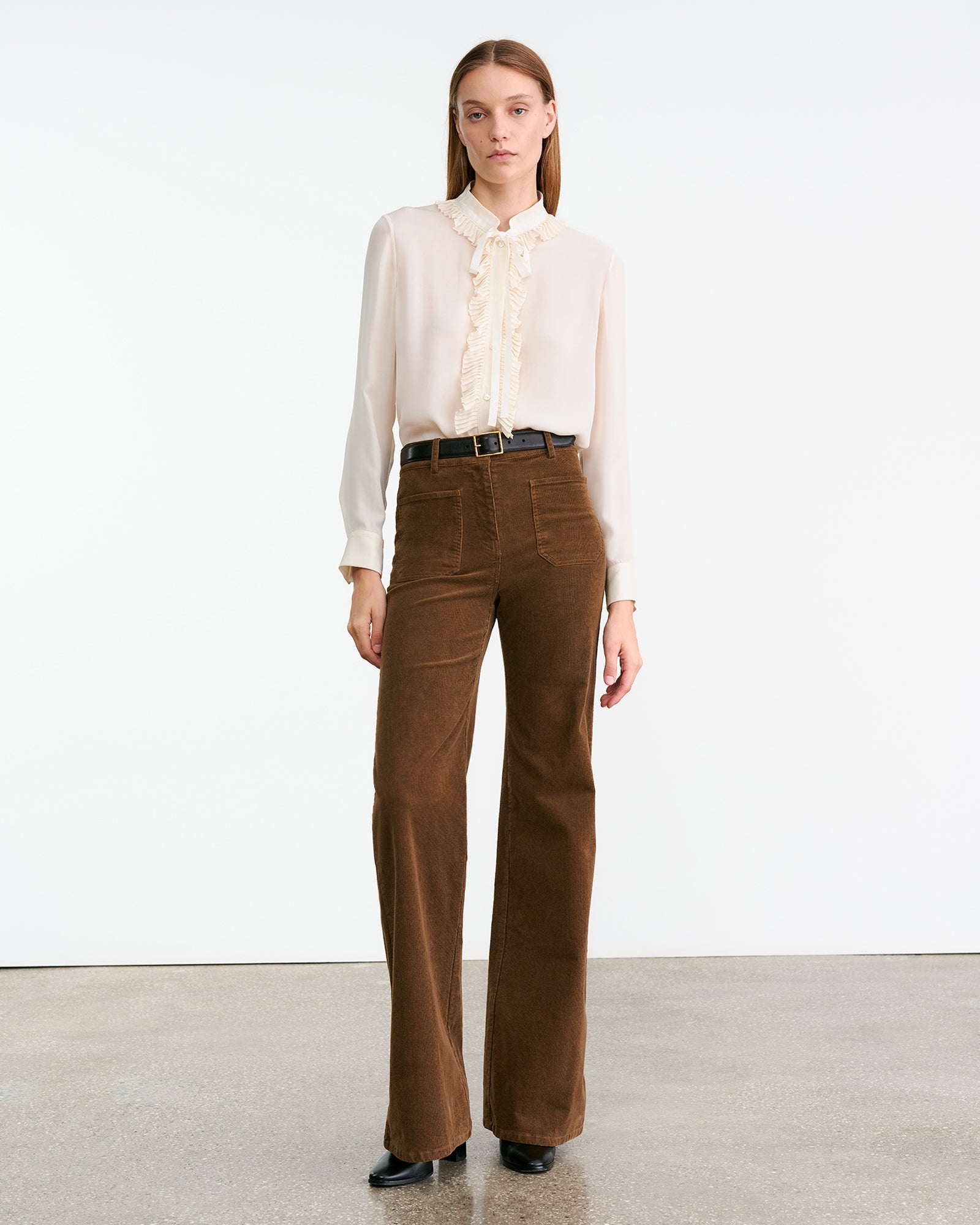 High-rise flare leg pant in corduroy. Front and back top stitched patch pockets. Button fly. Button closure. Belt loops.