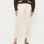 Carpenter-style pant in natural-colored denim with eyelet lace cutout detailing at the front panels. Features a fixed waist and a scalloped hem.