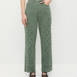 Carpenter-style pant in sage-colored denim with eyelet lace cutout detailing on the front panels. Features a fixed waist and a scalloped hem.