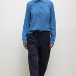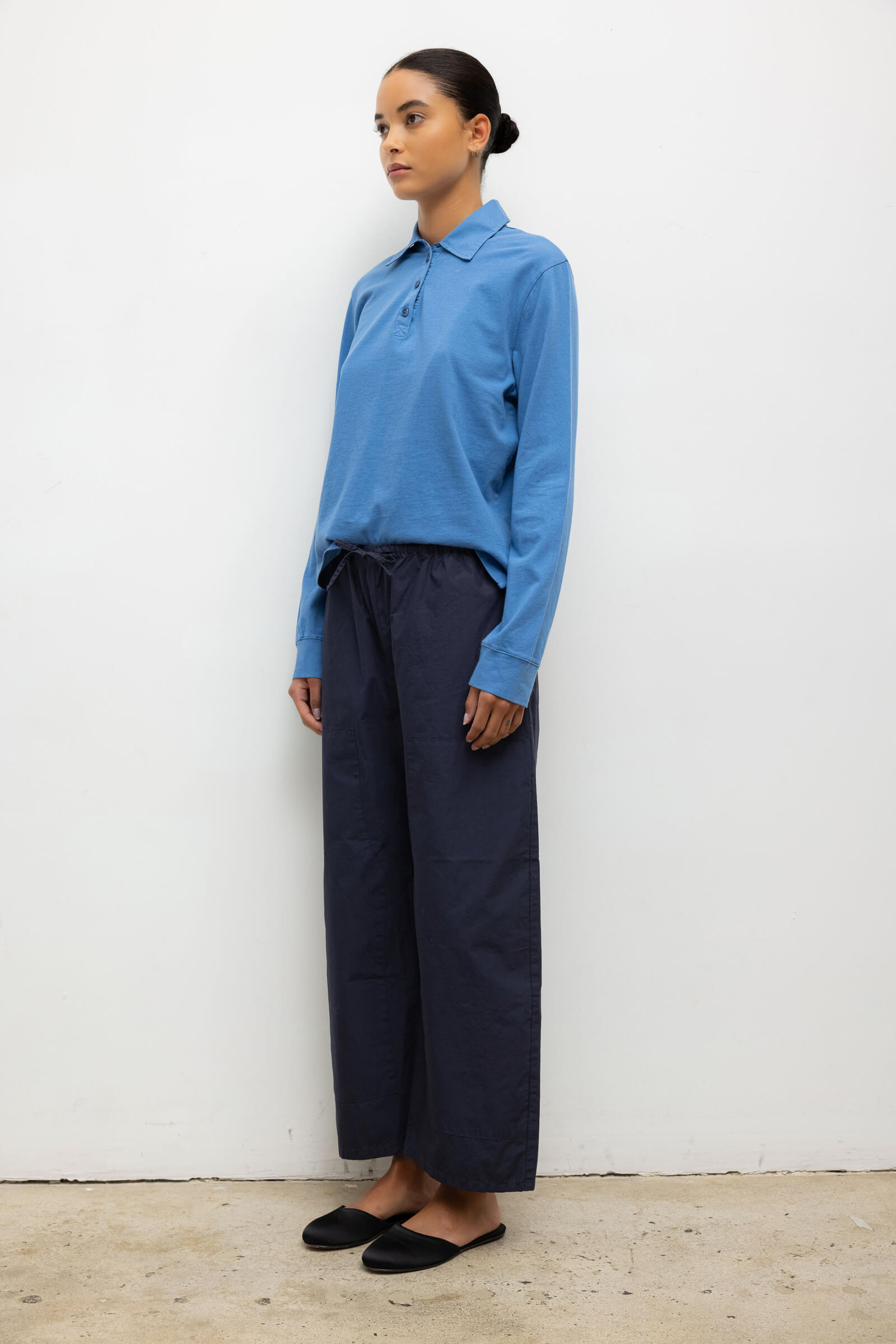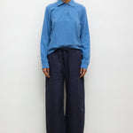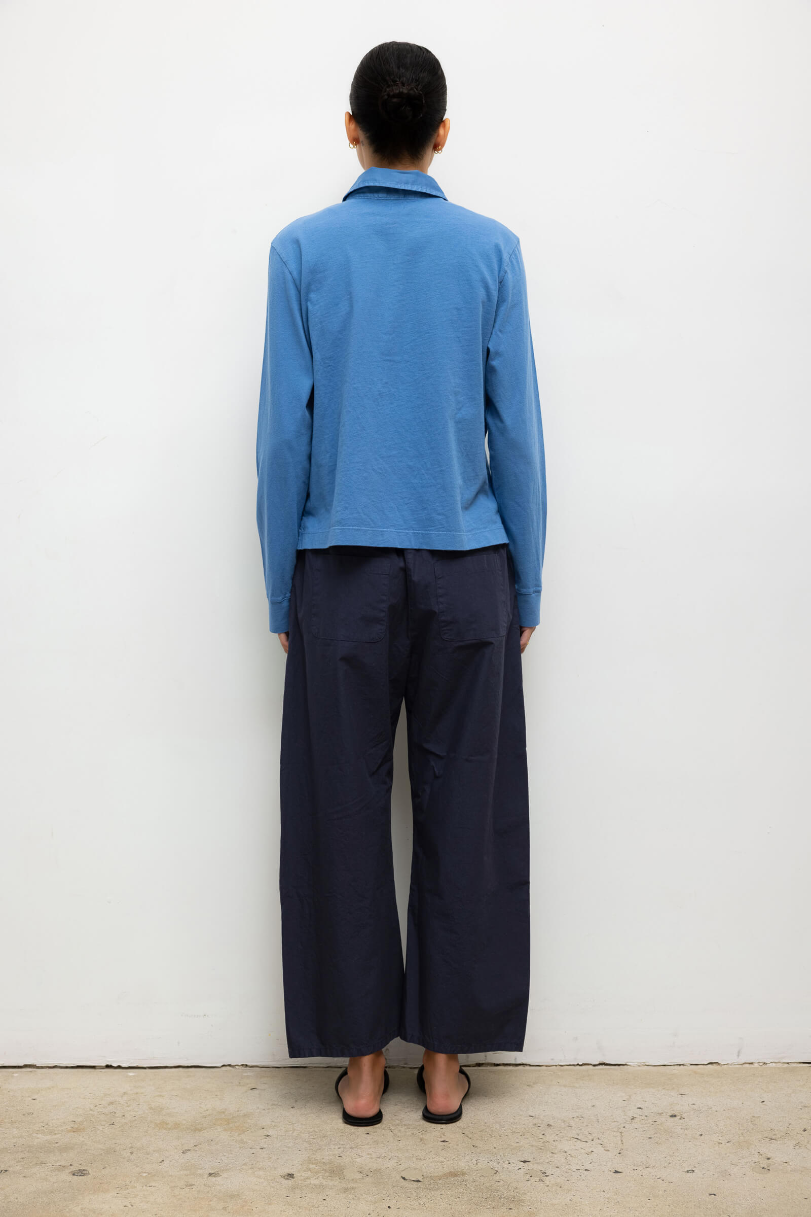 Cut in our garment dyed Kyoto Cotton, The Kyoto Carpenter Pant is a classic utility inspired trouser. This pull-on style pant features a baggy leg silhouette that hits at the ankle, with topstitched utility panels at front, an adjustable waistband, and patch pockets at back.