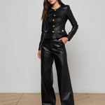 A luxe straight-leg trouser in black lambskin leather. Supple premium-leather hugs from contoured waistband to upper thigh, then releases into a full straight leg. Includes front slant and back welt pockets. With zip fly and hidden hook-and-bar closures. Fully lined. 100% Leather.
