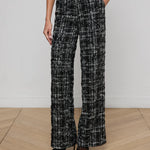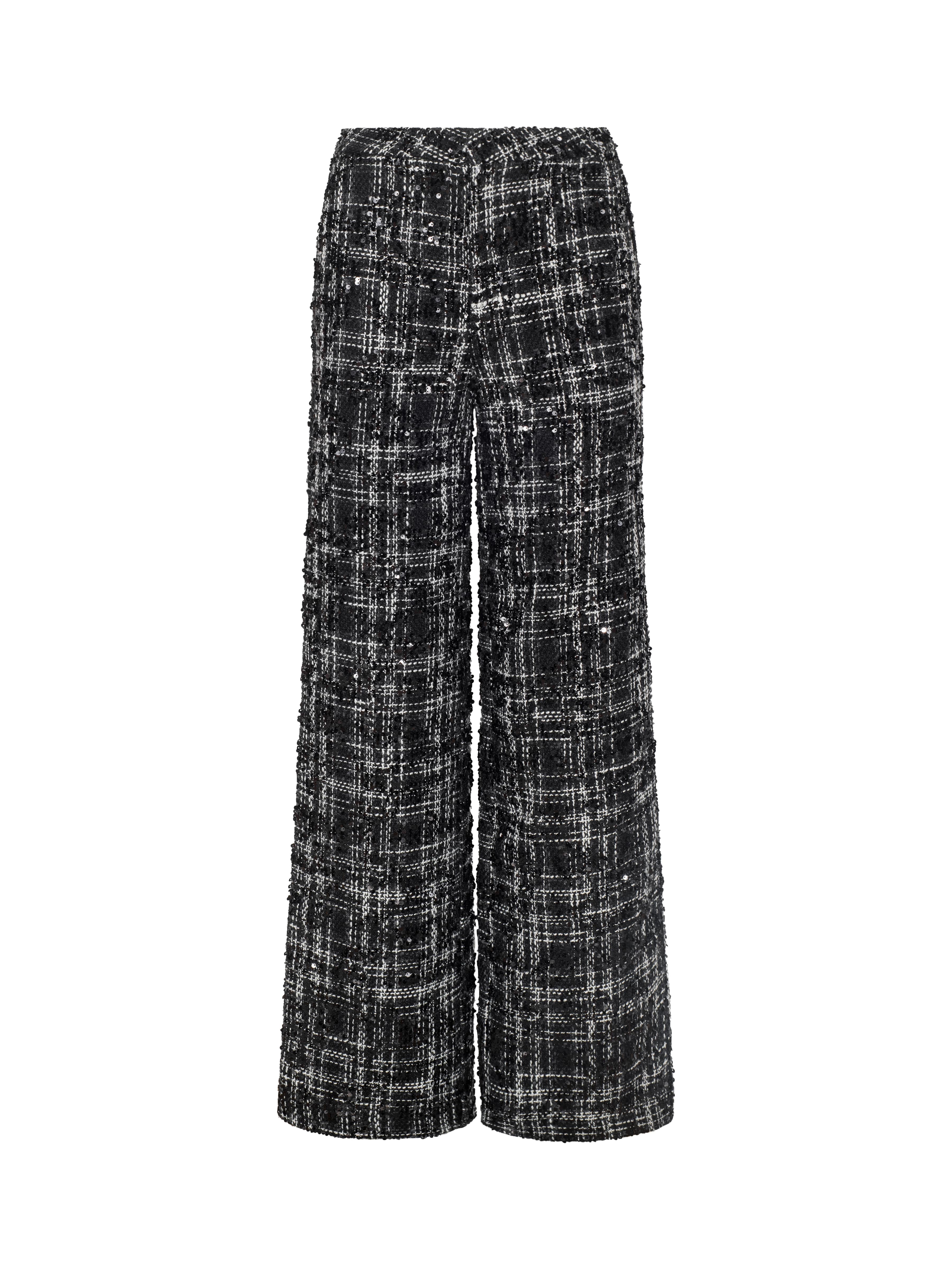 Our favorite essential trouser, now in black and ivory tweed with sequins. A full straight leg creates a beautifully balanced silhouette. Pair with its coordinating jacket for power-suit moment, or with an elegant silk blouse and heel for chic nights out.
