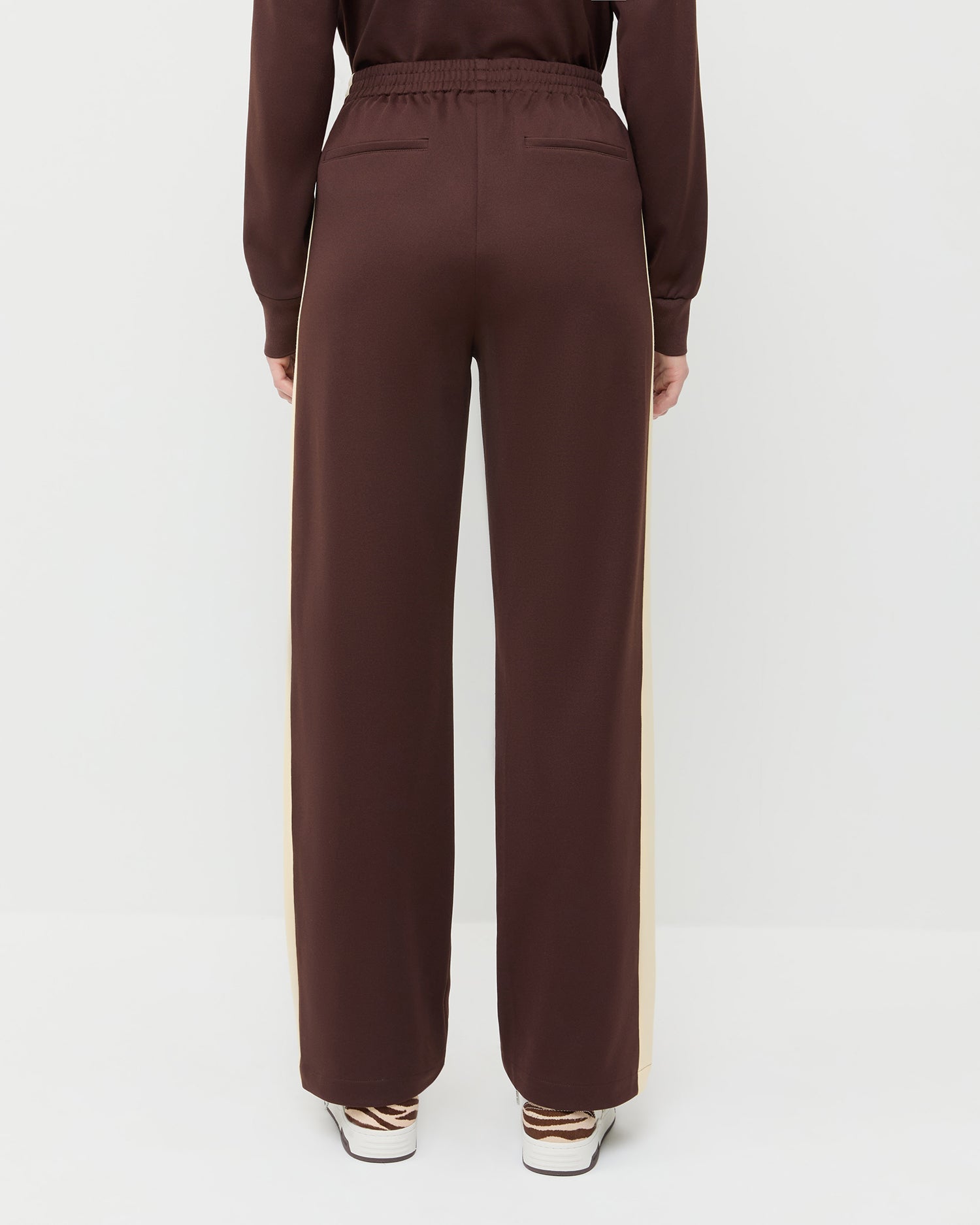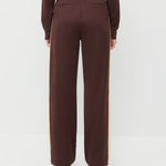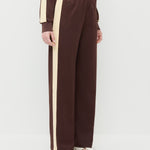 Track pant in dark brown and butter jersey. Features an elastic waistband, side pockets, and side stripe detail.