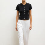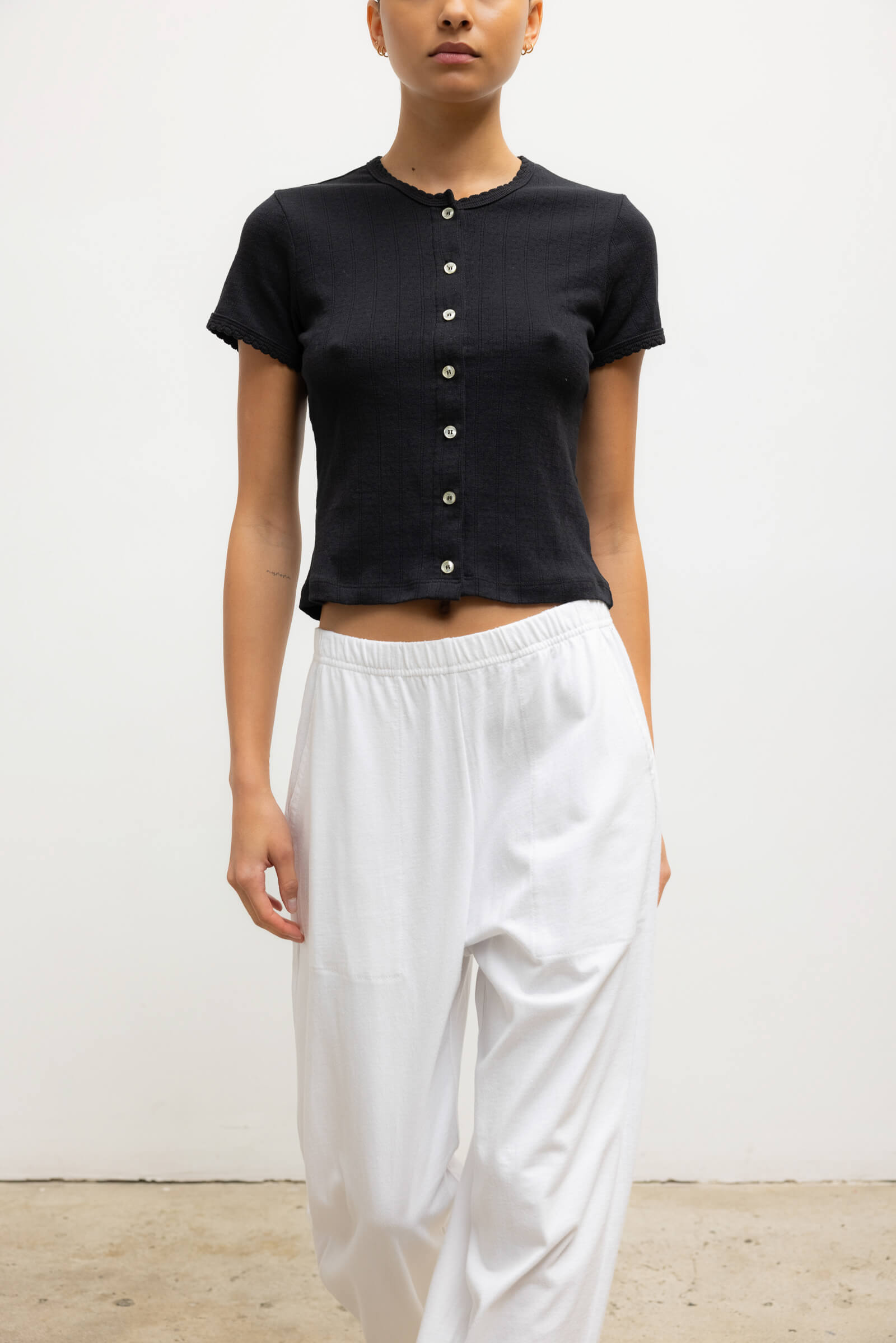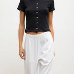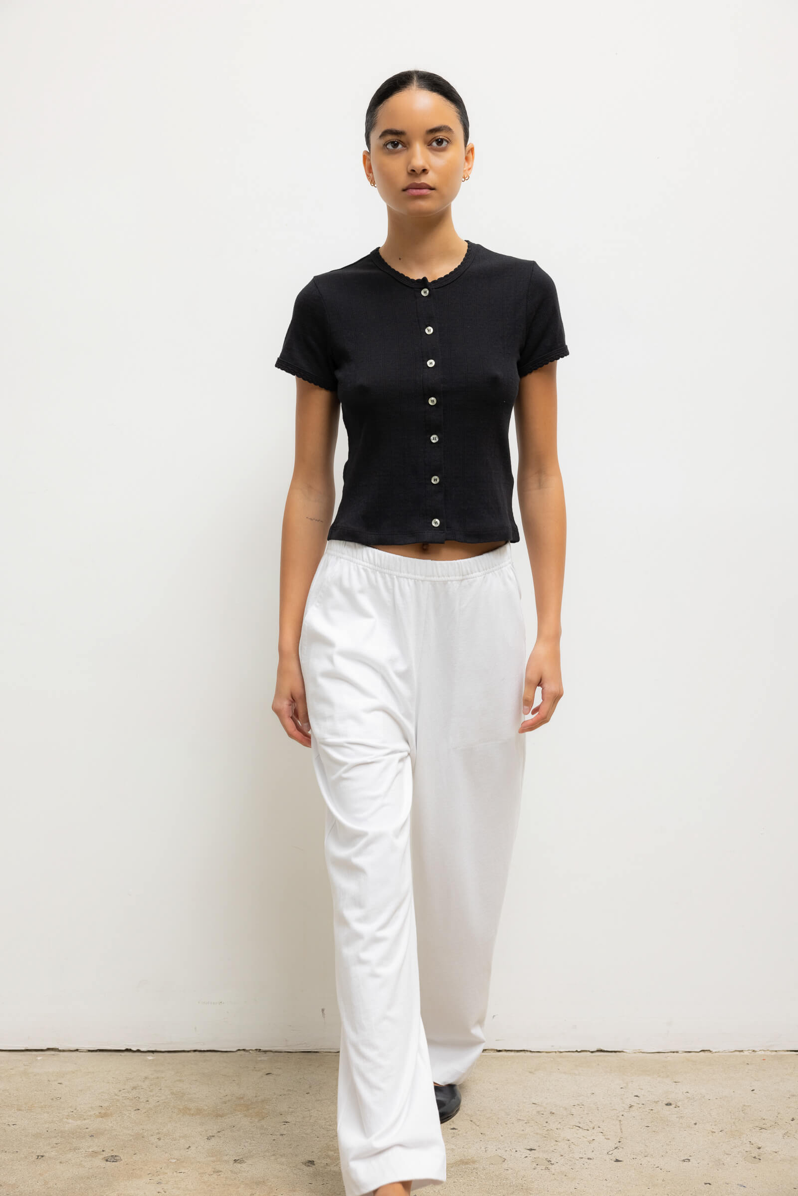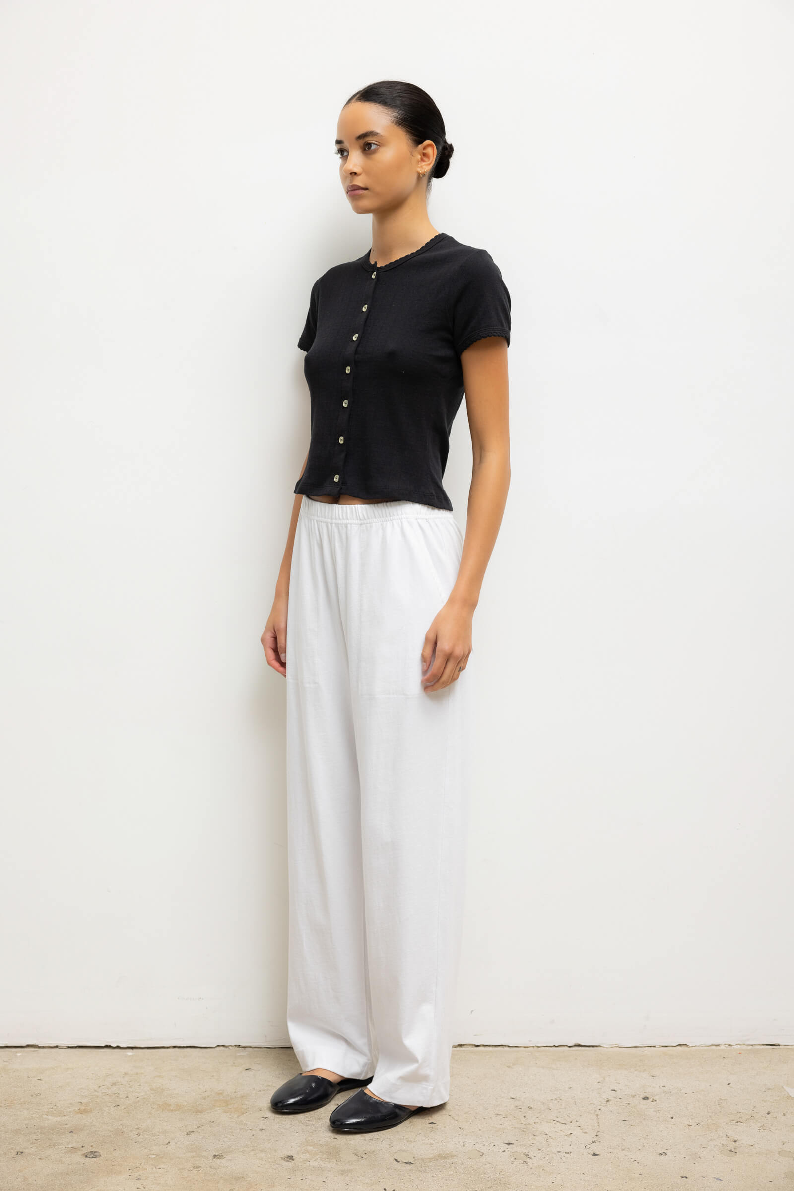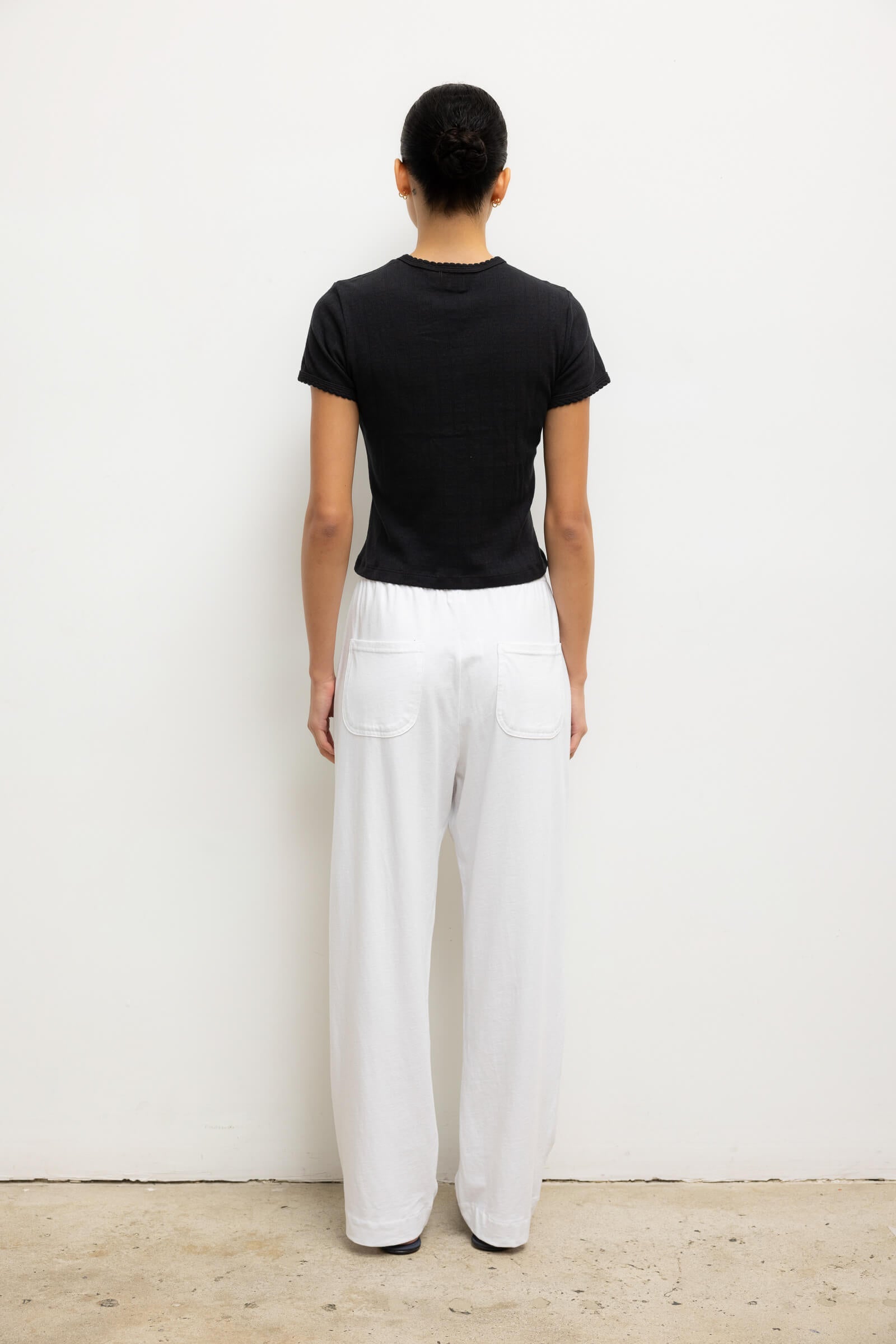 Cut in our shape-holding, 100% cotton, the Margo Tapered Pocket Pant is an easy, pull-on style pant with a straight, relaxed leg and a comfortable elastic waistband. Match it with our best-selling Margo Tee in White.