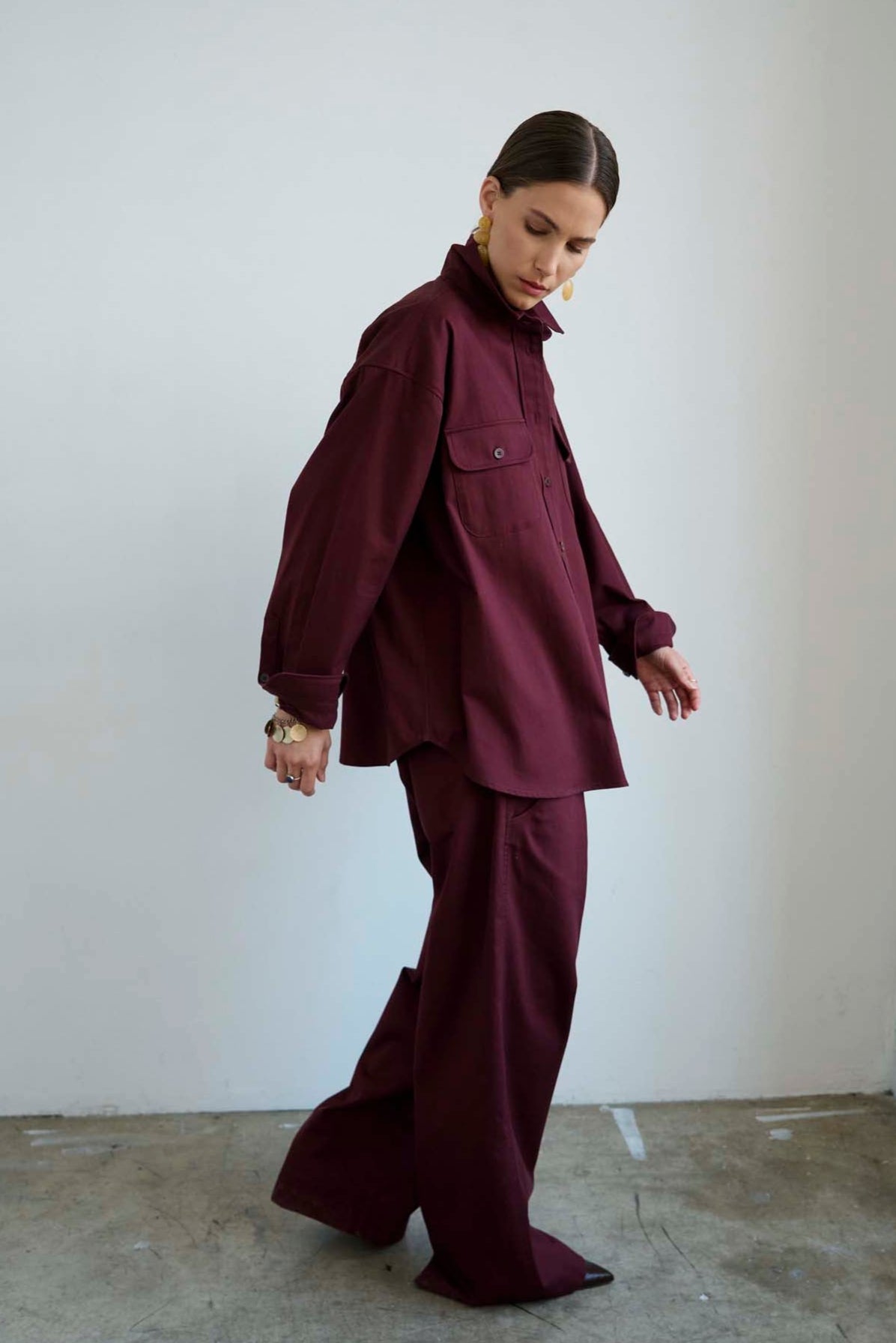 Inspired by those loose leg drawstring scrubs doctors wear. Pleats are placed below the hips for well placed volume and a streamlined silhouette. A drawstring tie adds a relaxed essence. A daily utilitarian uniform of COOL and EASY.