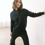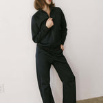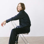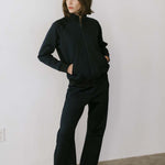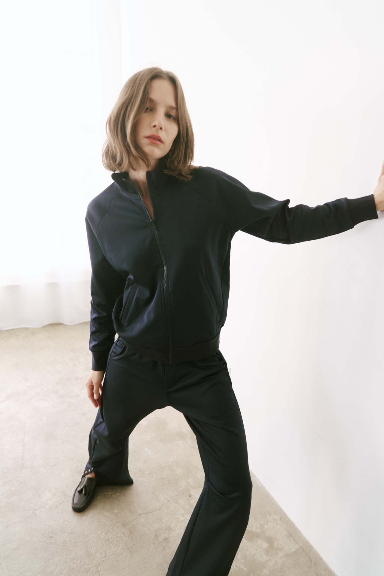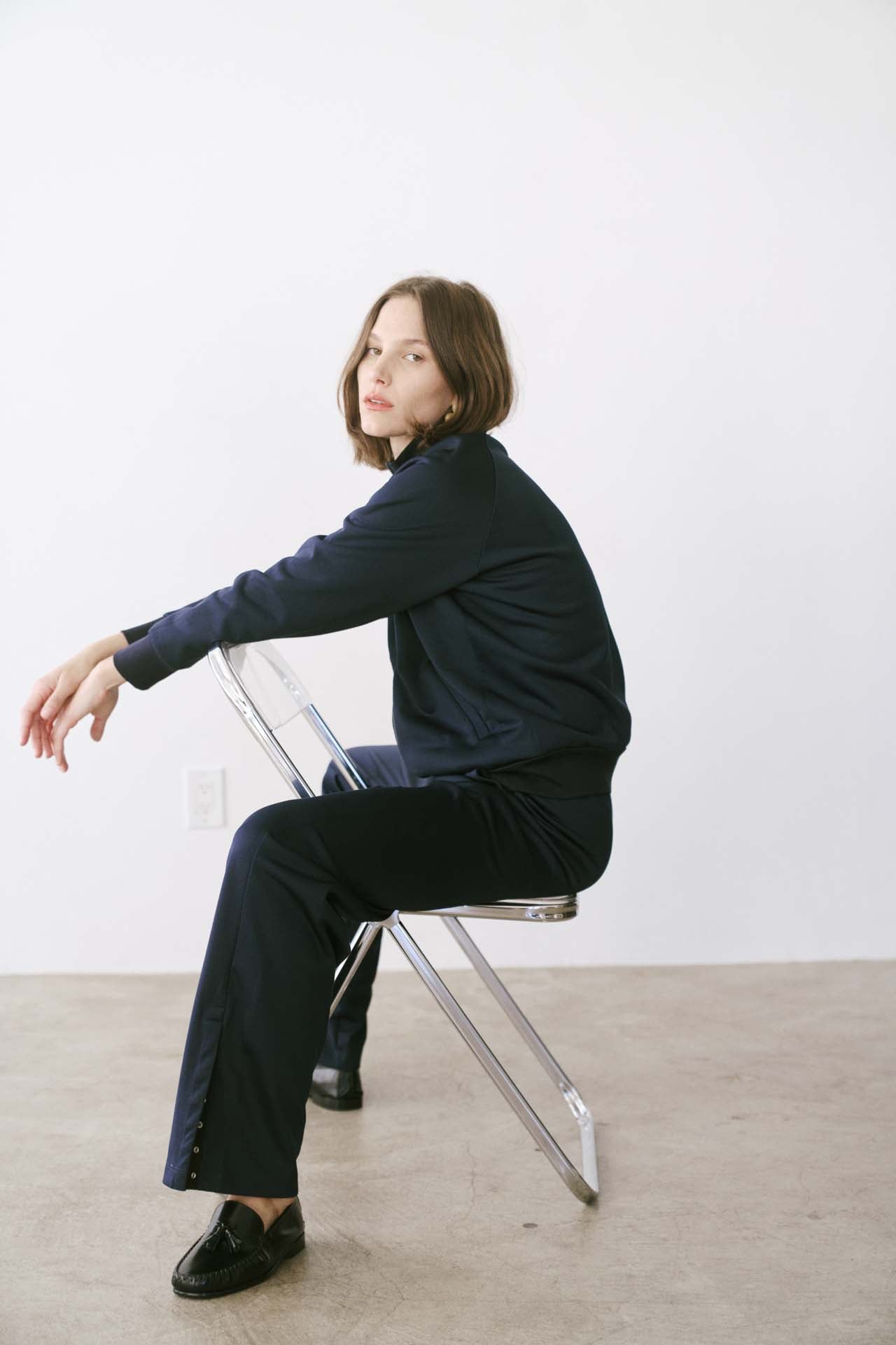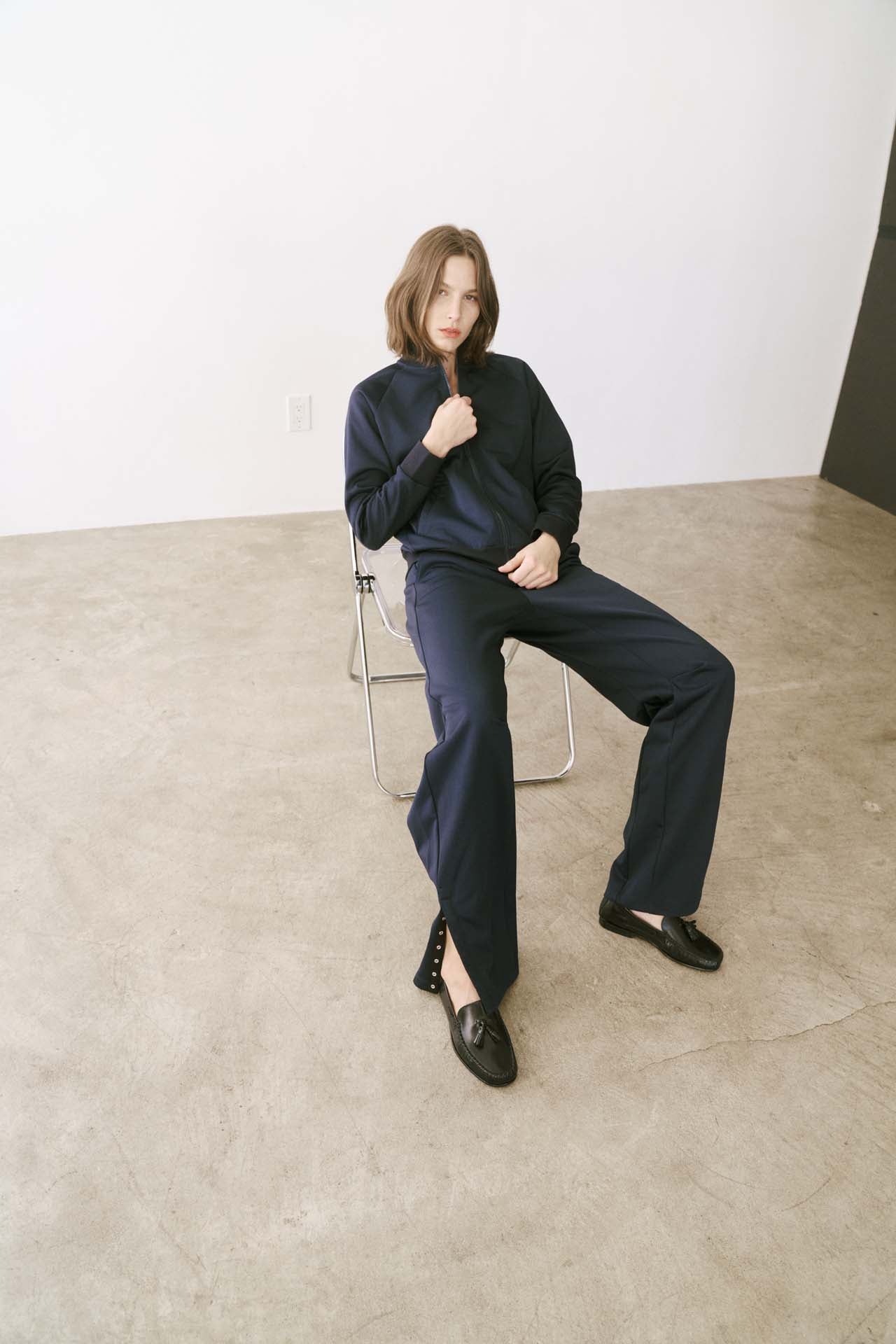 A pull on track trouser tailored in a drapy and structured Italian knit.  A snap detailed vent and arc shaped leg creates architectural interest in a sporty classic. A true dress up, dress down kind of elevated casual staple.