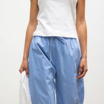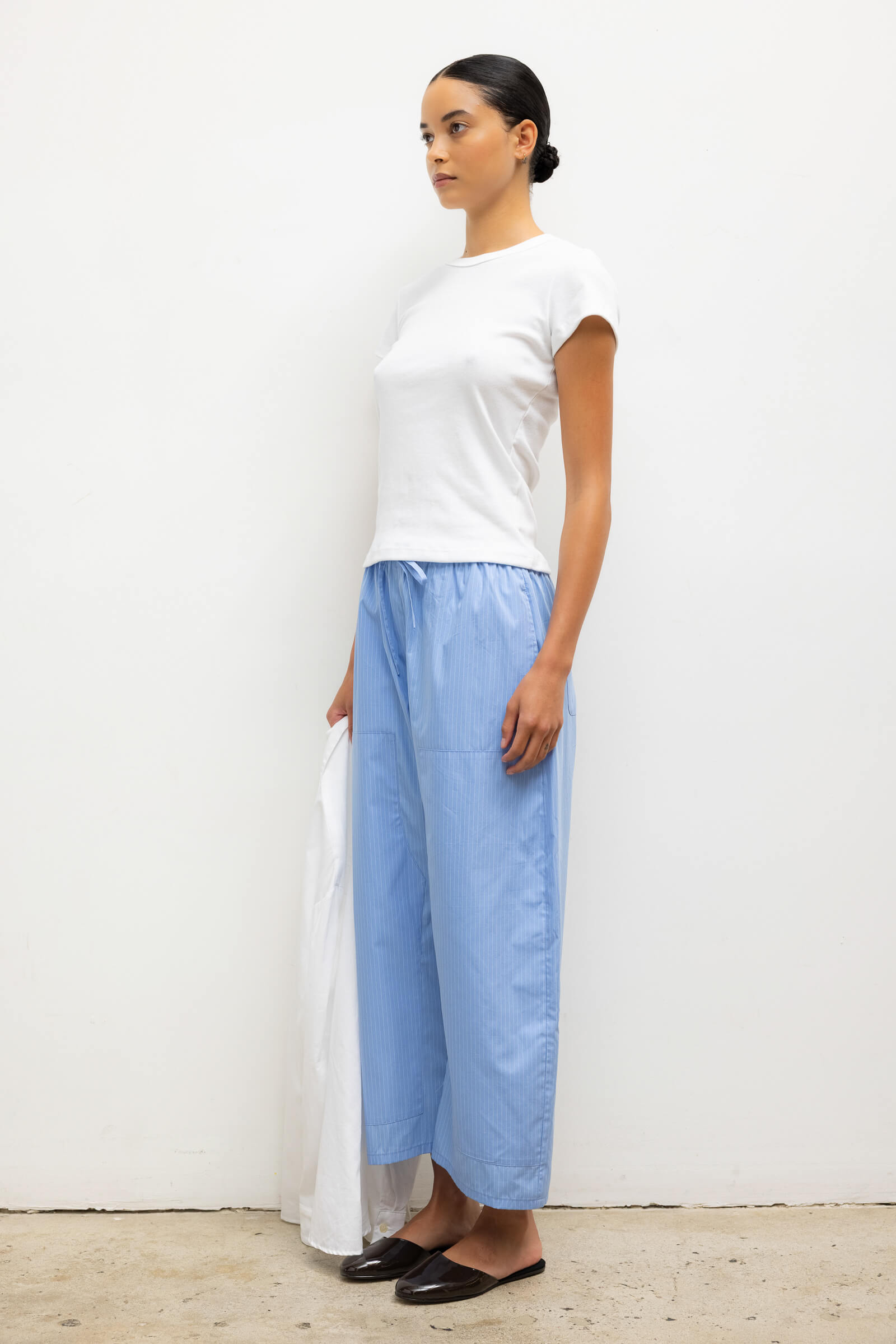 Cut in our striped Yoshi Cotton Twill, The Yoshi Carpenter Pant is a classic utility inspired trouser. This pull-on style pant features a baggy leg silhouette that hits at the ankle, with topstitched utility panels at front, an adjustable waistband, and patch pockets at back.