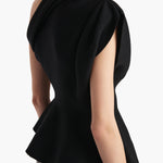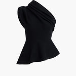 A tubular-knit peplum top of compact Merino wool. Elegantly asymmetric, with hand-pleated detail at shoulder-baring neckline and armhole. Slips on.