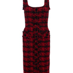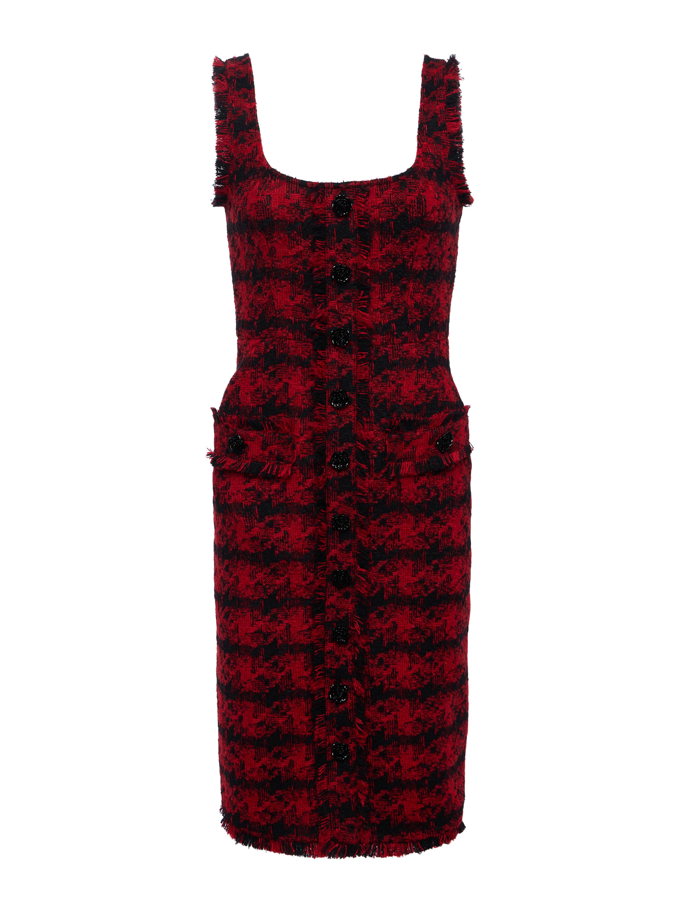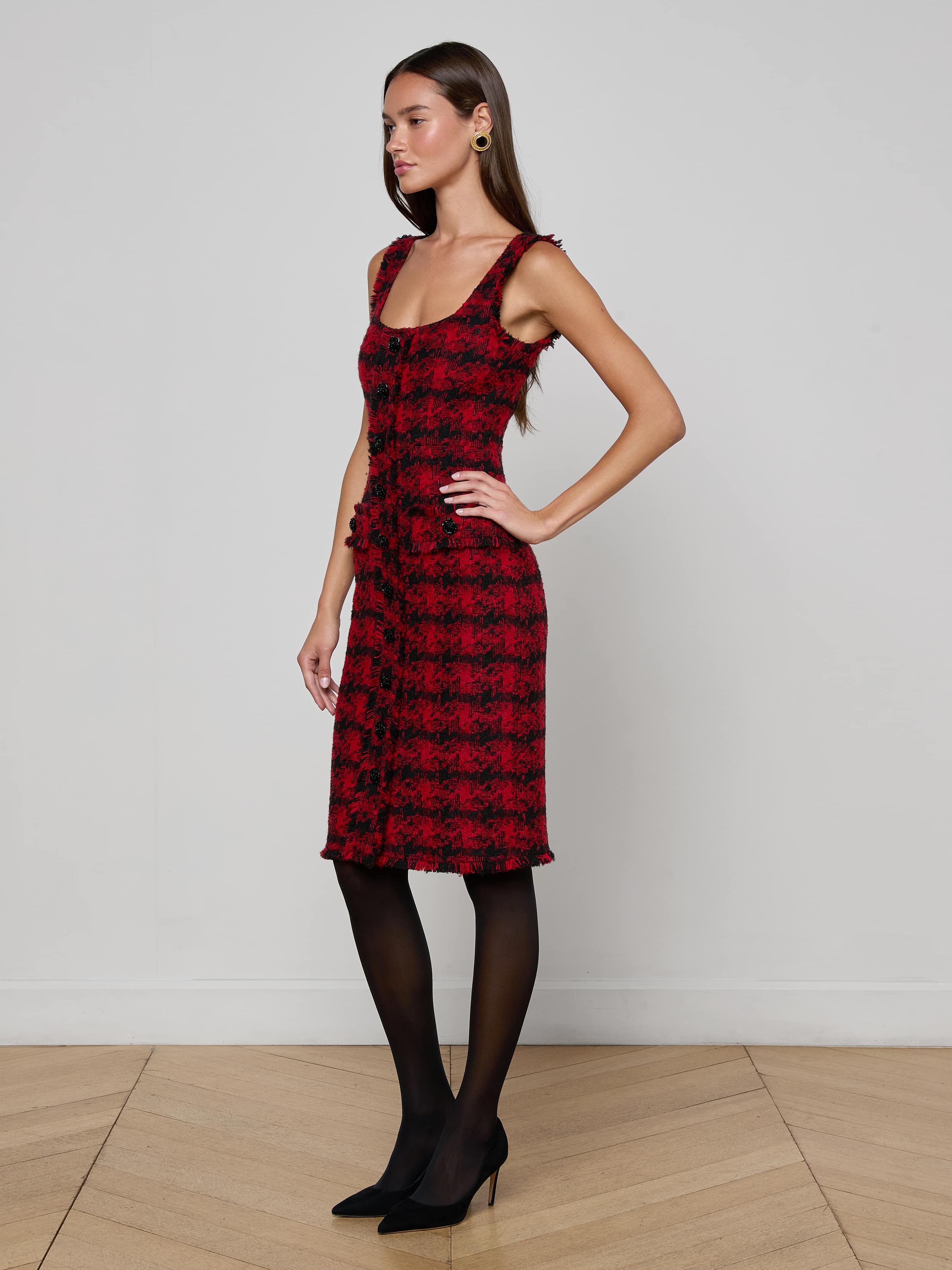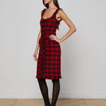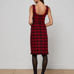 This style was featured in our Fall ‘25 NYFW presentation. The Aya midi dress is the height of refined sophistication, crafted with strategic seaming to sculpt the figure. Fringed trims add a hint of edge. Now in back in a textured red and black tweed.