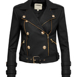 Biker style meets feminine elegance. Chic, blazer-inspired details like embossed gold buttons and peaked lapels elevate this black leather jacket, crafted from 100% luxury lambskin. Classic biker elements like an attached leather belt, zippers, straps, and a chunky belt maintain an edgy authenticity.