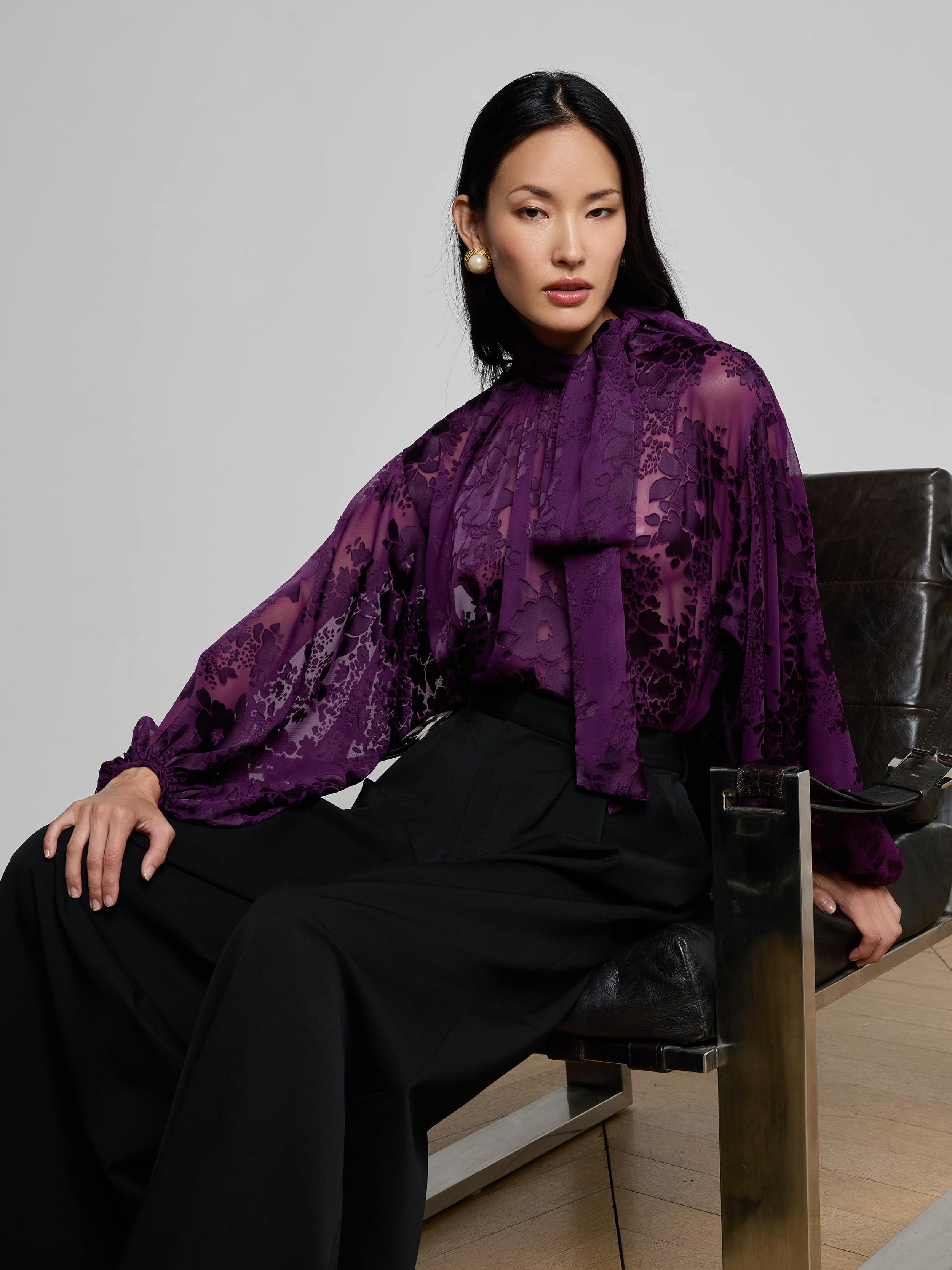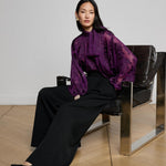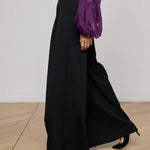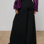 The Chelsy pant is a striking study in fluid tailoring, defined by its dramatic wide leg and sharp front pleats. Cut to sit high on the waist, it elongates the silhouette while moving with ease and elegance. Pair with a sleek blazer or let it flow against a fitted knit for a refined contrast.
