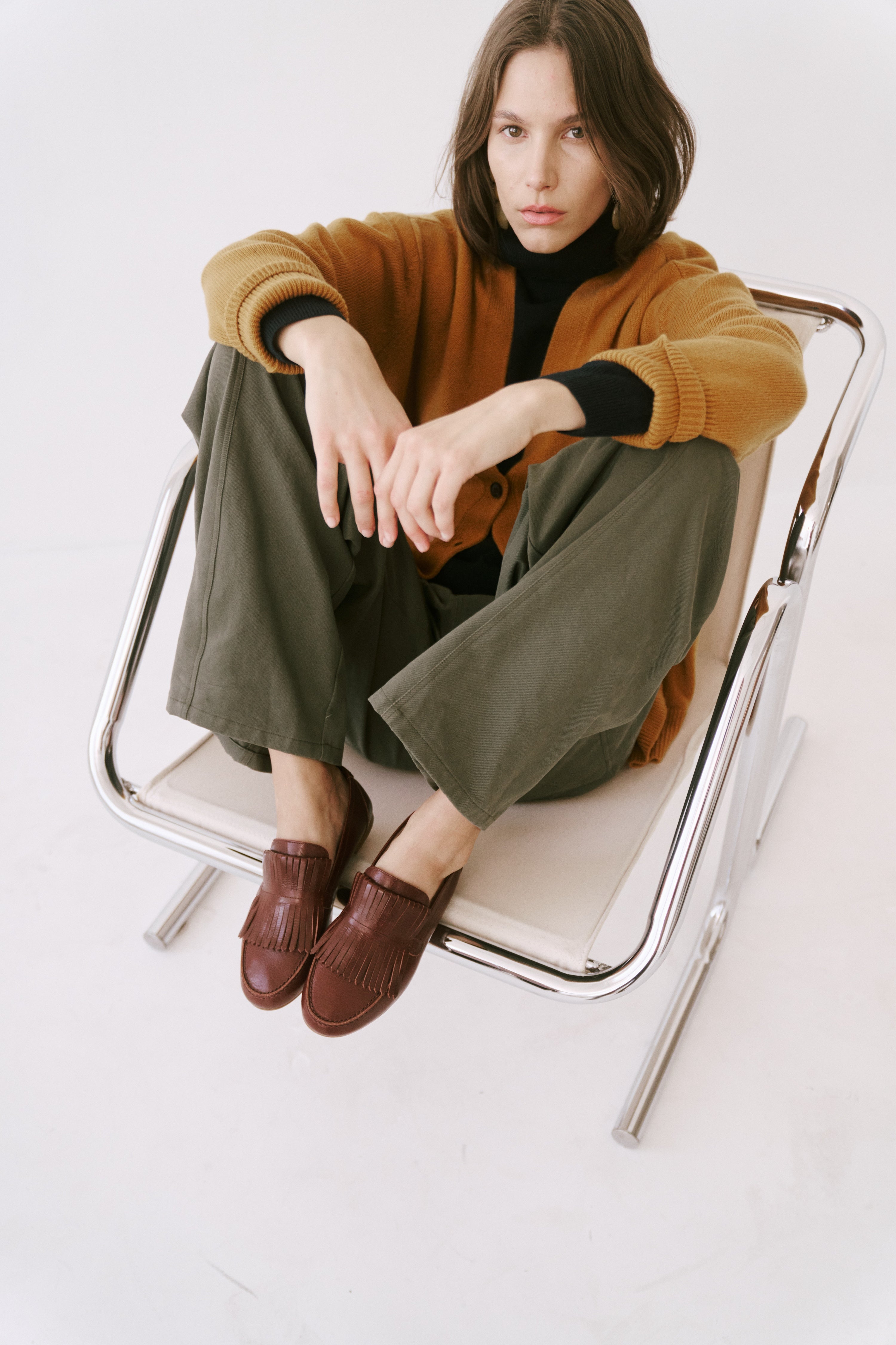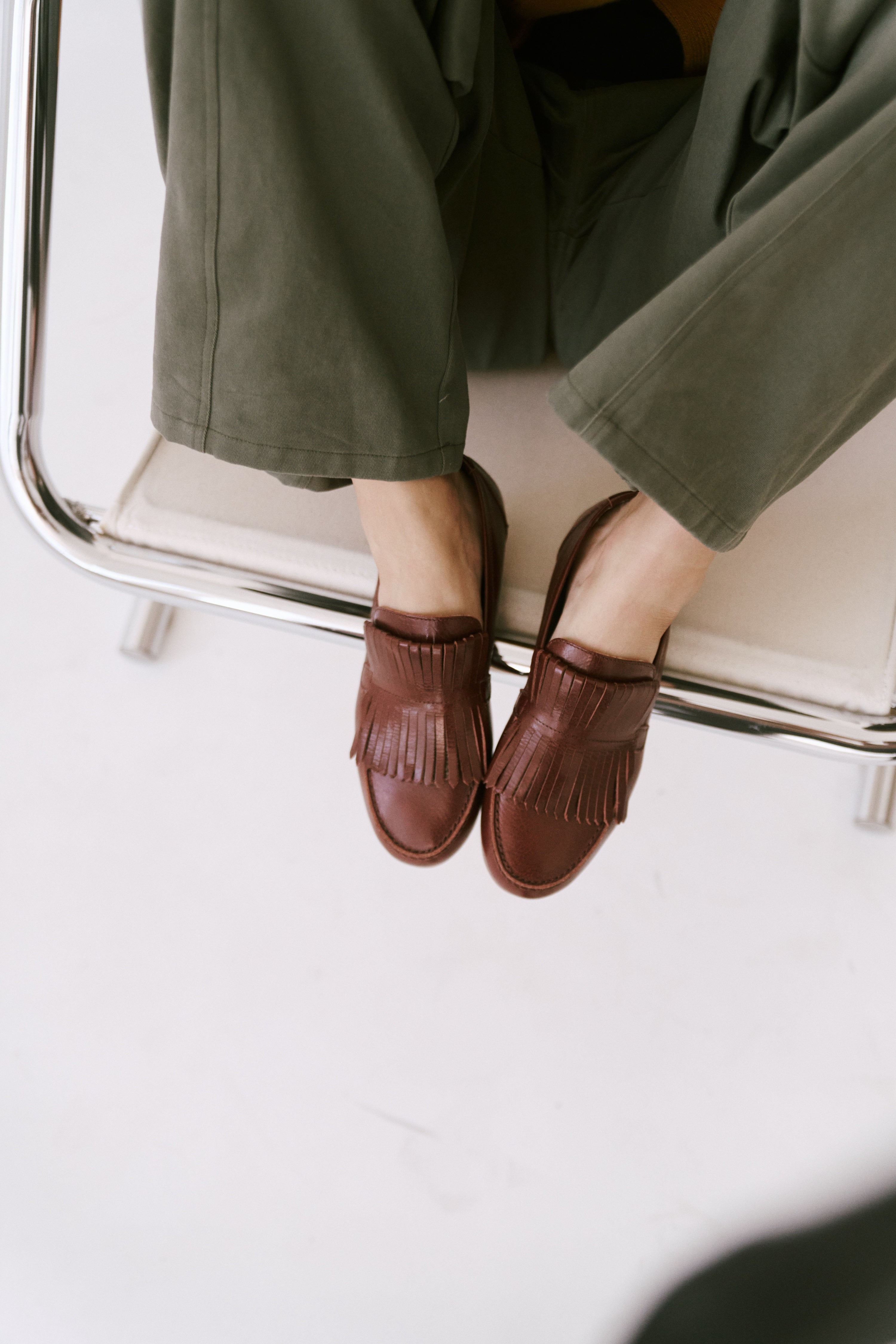 A fringy take on our classic penny loafer. A heritage concept made modern and infused with bohemian spirit. Inspired by the handsome lines of a 70’s Italian mens loafer with the understated casual soul of a slipper. Leather lining and insole. Leather sole with anti slip rubber injection. Old world Sacchetto construction for a glove like fit and feel that you can’t unsee.