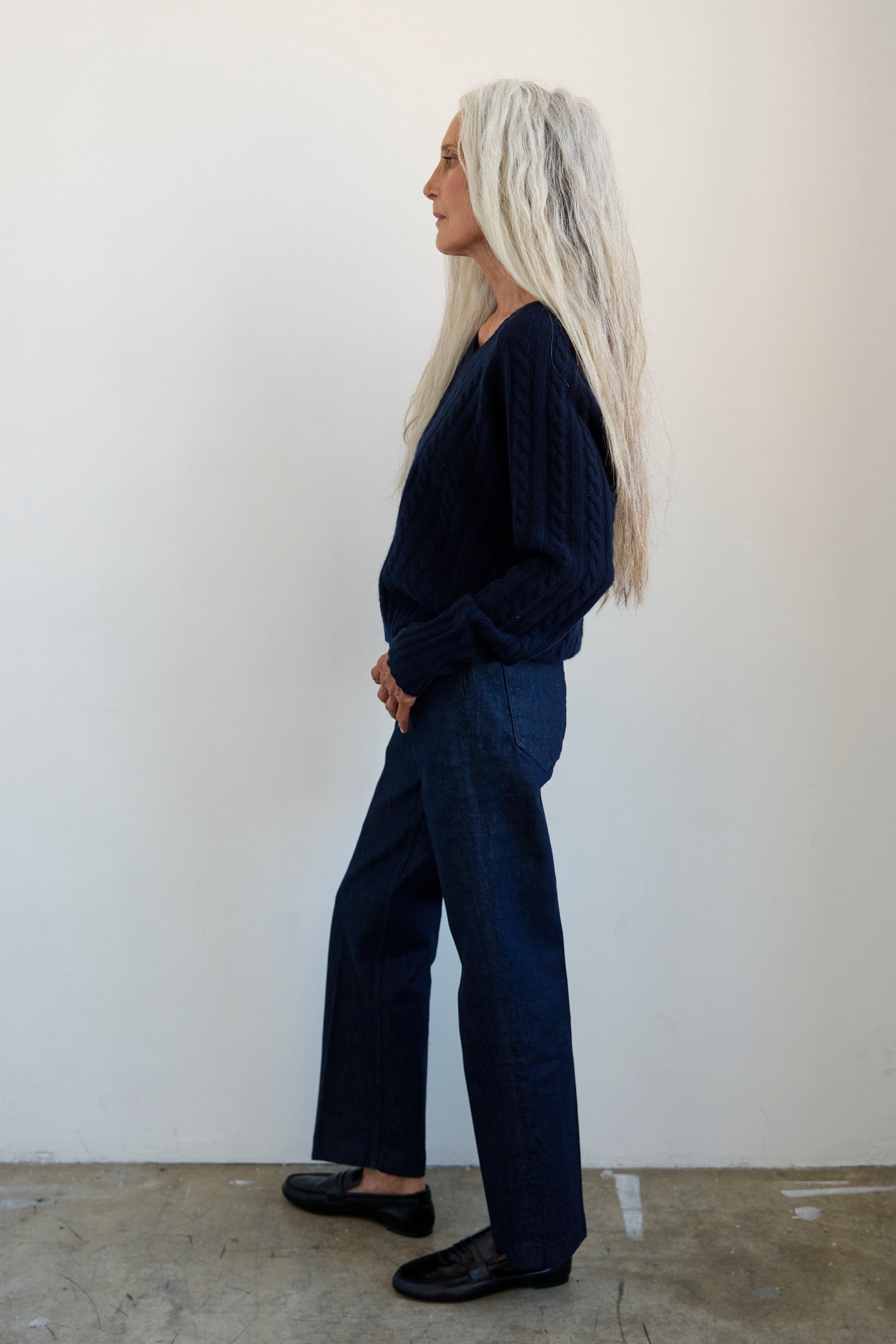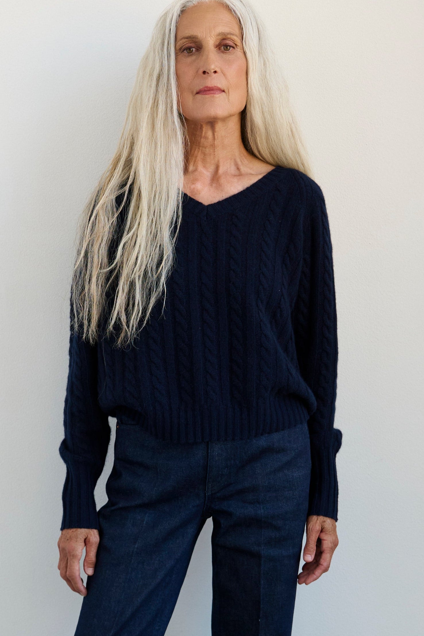 Three end Mongolian washed cashmere knit into a sartorial cable in my favorite V neck sweater. An iconic shape, inspired by my coveted 25 year old YSL mens V.
