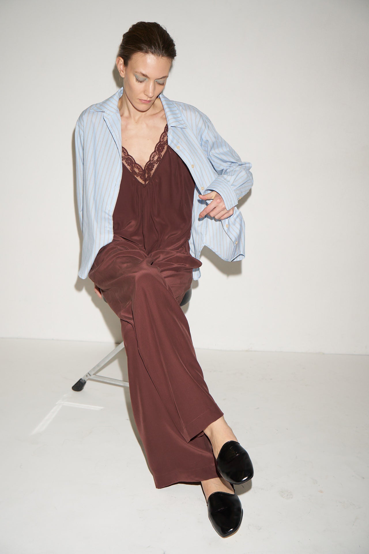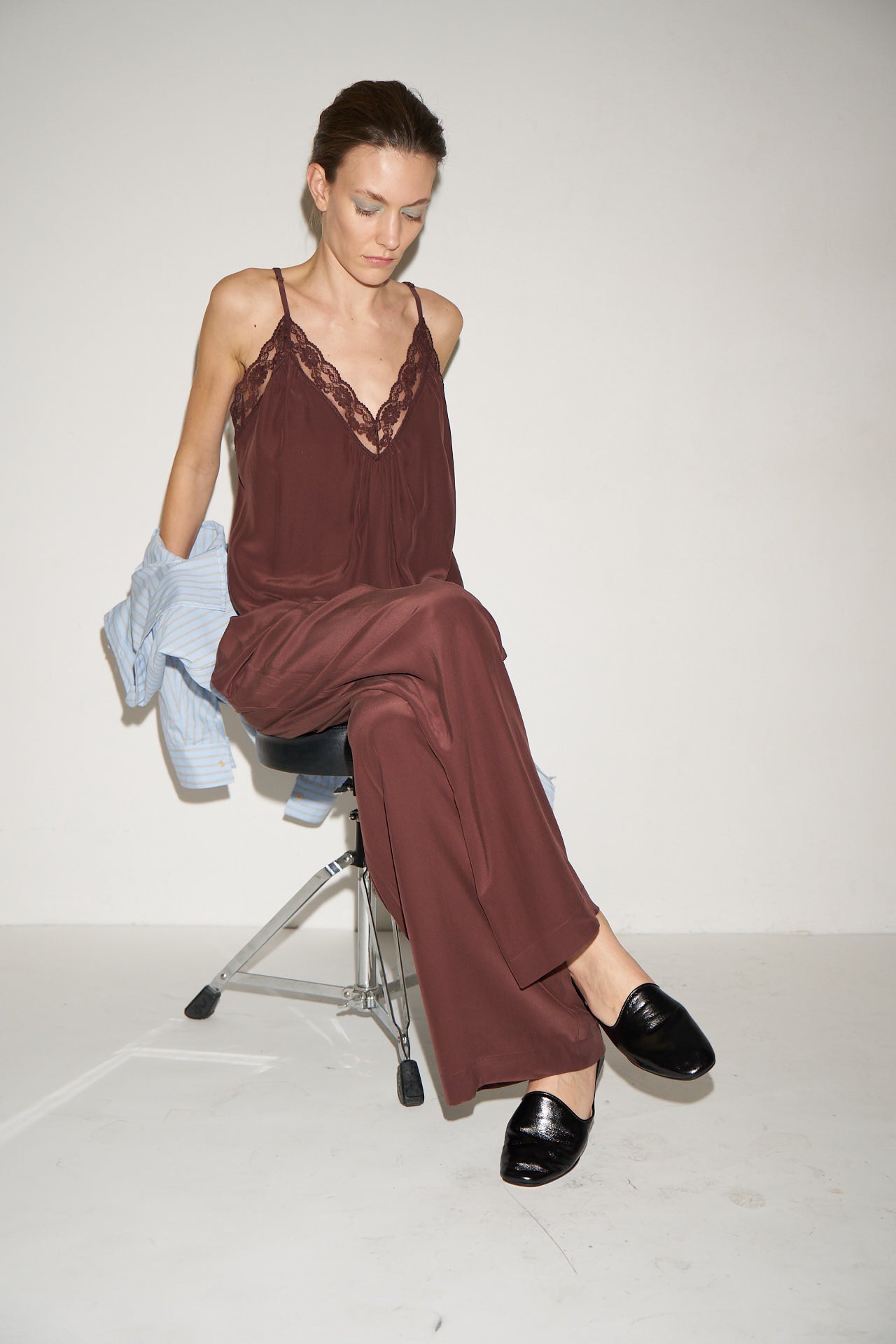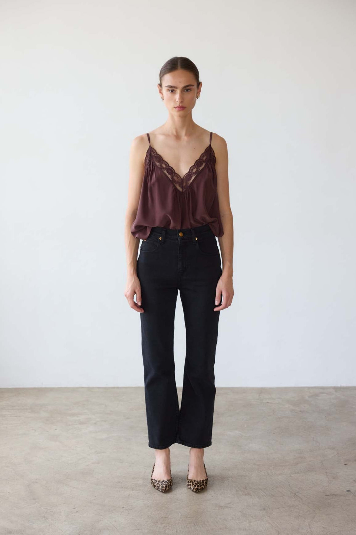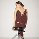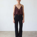 A deep V cami with delicate lace detail,  perfect for layering under a blazer or a night out with the Crease Jean. Tailored in sand washed silk charmeuse with the satin side soft to the skin.