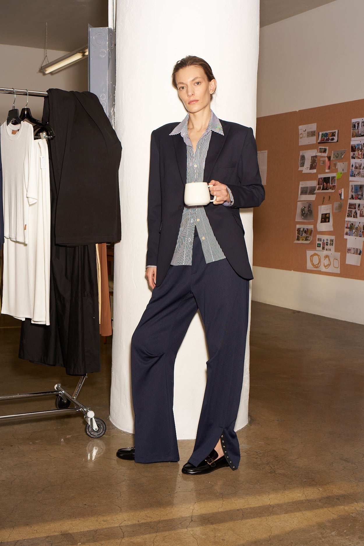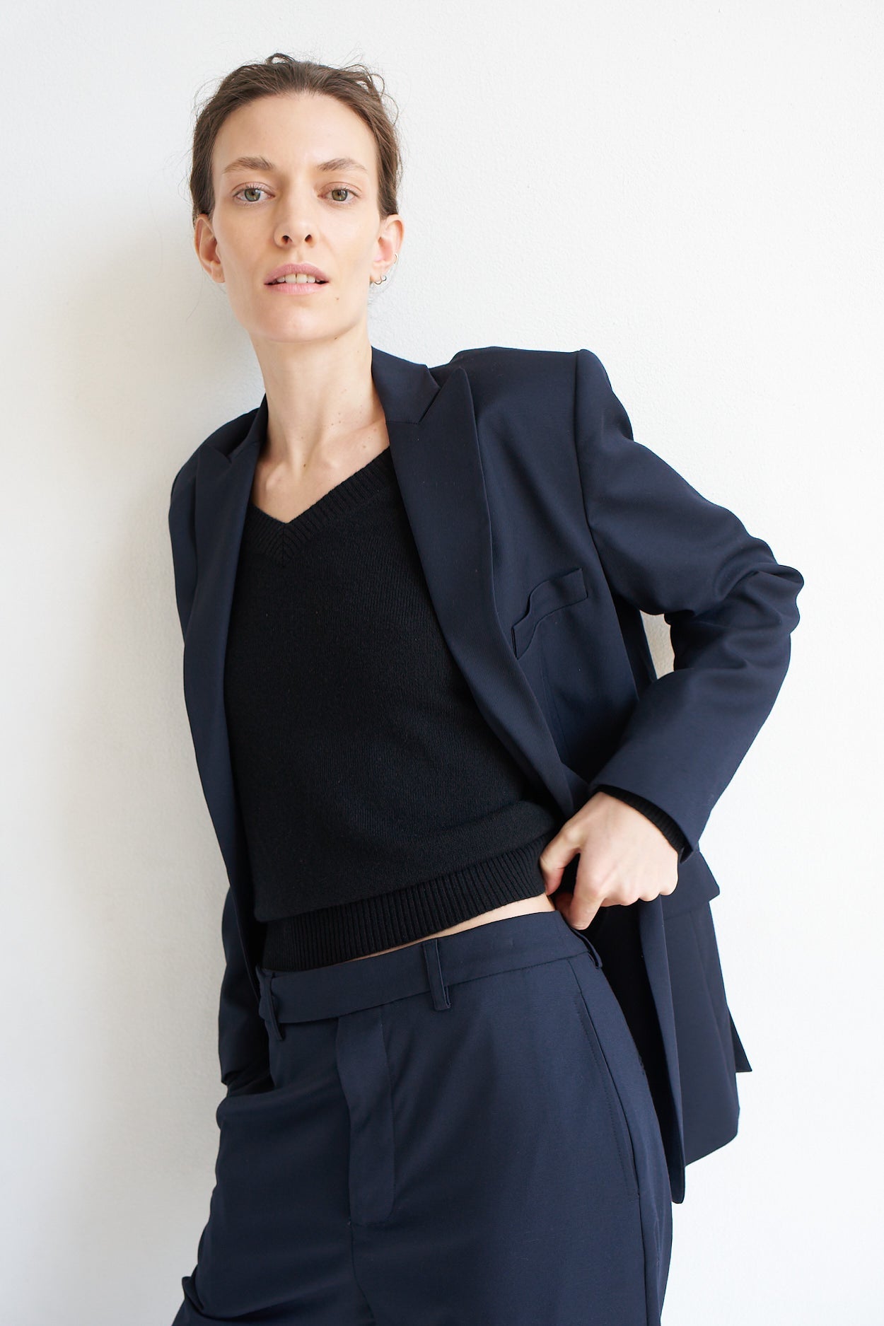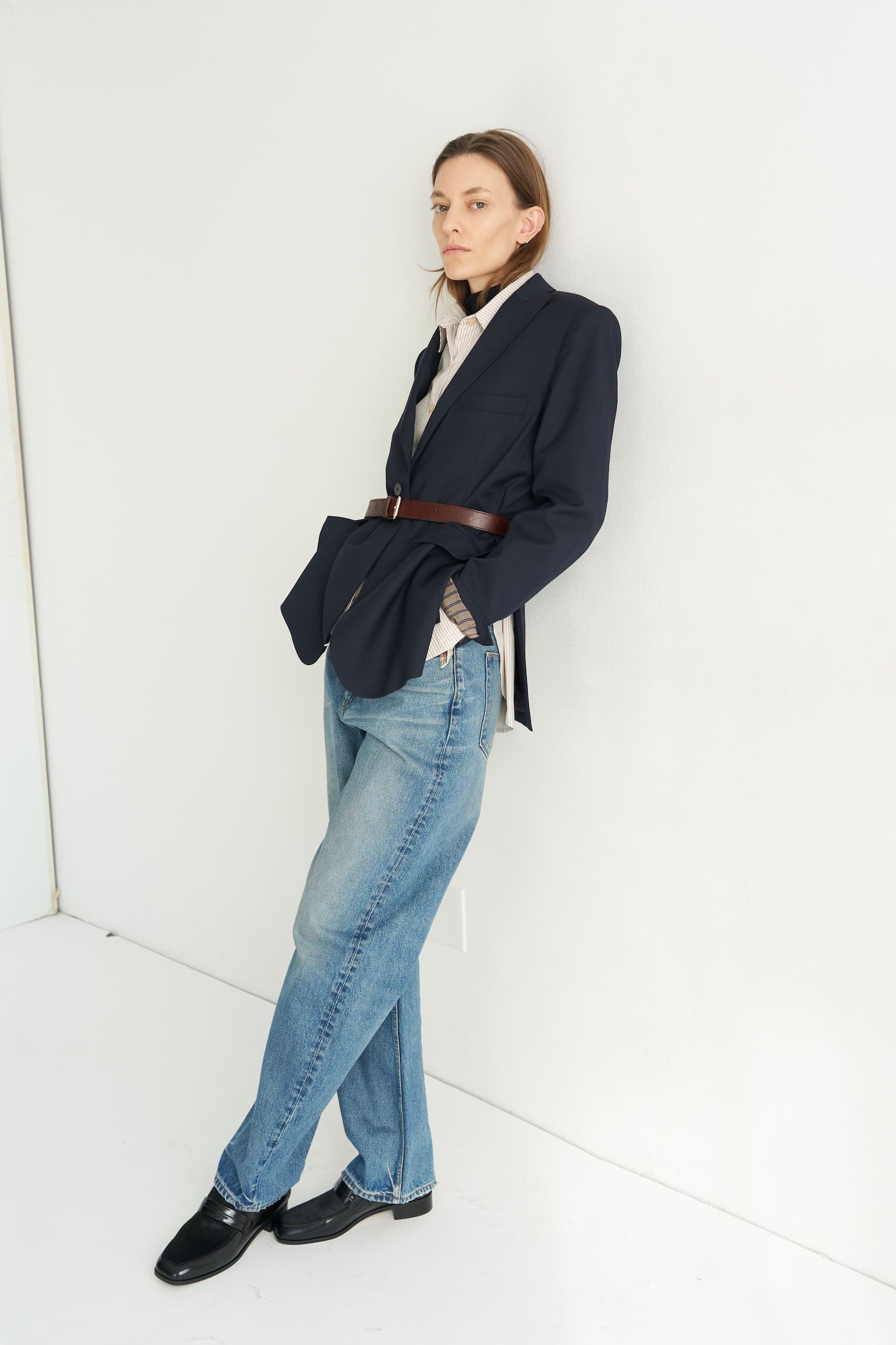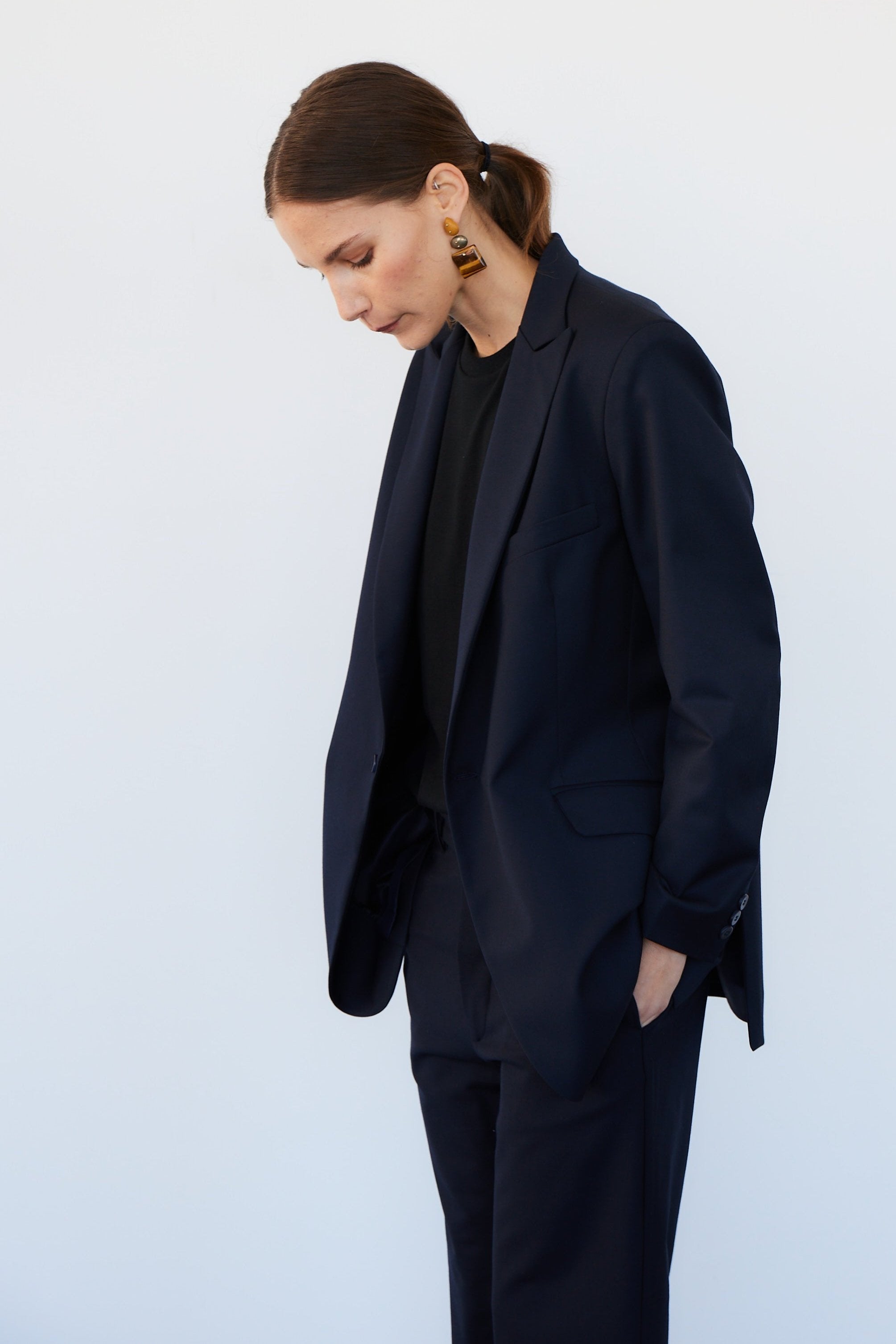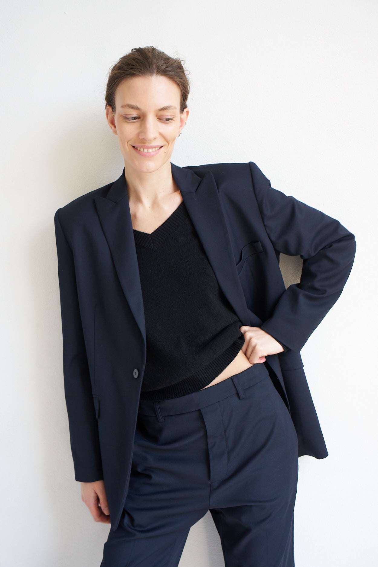 A classic navy blazer. A relaxed cut, softly tailored. The Julius blazer wears nicely back to denim, is chic back to black. The silhouette is classic but advanced. Inspired by Julia Roberts in the last scene of Pretty Woman, by the navy suits in my Grandpas’s closet, inspired by men wearing Navy blazers in 1st class on airplanes, the idea that you dress. And this idea mixed with me, because I like to undress into casual. That mix. A classic blazer back to the fatigues, back to the Easy jean, back to the Waist Tape Trouser. All of that.